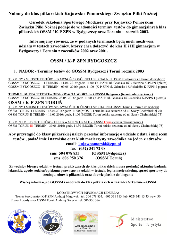Nabory do klas piłkarskich Kujawsko-Pomorskiego Związku Piłki Nożnej Ośrodek Szkolenia Sportowego Młodzieży przy Kujawsko Pomorskim Związku Piłki Nożnej podaje do wiadomości terminy testów do gimnazjalnych klas piłkarskich OSSM / K-P ZPN w Bydgoszczy oraz Toruniu – rocznik 2003. Informujemy również, że w podanych terminach będą mieli możliwość udziału w testach zawodnicy, którzy chcą dołączyć do klas II i III gimnazjum w Bydgoszczy i Toruniu z roczników 2002 oraz 2001. OSSM / K-P ZPN BYDGOSZCZ 1. NABÓR - Terminy testów do GOSSM Bydgoszcz i Toruń rocznik 2003 TERMINY i MIEJSCE TESTÓW SPRAWNOŚCI OGÓLNEJ I SPECJALNEJ OSSM Bydgoszcz (1 termin do wyboru) GOSSM BYDGOSZCZ I TERMIN - 11.04. 2016r godz. 11.00 (K-P ZPN ul. Gdańska 163 / siedziba K-PZPN I piętro) GOSSM BYDGOSZCZ II TERMIN - 09.05. 2016r godz. 11.00 (K-P ZPN ul. Gdańska 163/ siedziba K-PZPN I piętro) TERMIN i MIEJSCE TESTU– OBSERWACJA W GRZE - GOSSM Bydgoszcz (termin obowiązkowy ) GOSSM BYDGOSZCZ III TERMIN- 23.05. 2016r godz. 11.00 (K-P ZPN ul. Gdańska 163 /siedziba K-PZPN I pietro)) OSSM / K-P ZPN TORUŃ TERMINY I MIEJSCE TESTÓW SPRAWNOŚCI OGÓLNEJ I SPECJALNEJ OSSM Toruń (1 termin do wyboru) OSSM TORUŃ I TERMIN - 18.04.2016r godz. 11.00 (MOSiR Toruń boisko sztuczne od ul. Szosy Chełmińskiej 75) OSSM TORUŃ II TERMIN - 16.05.2016r godz. 11.00 (MOSiR Toruń boisko sztuczne od ul. Szosy Chełmińskiej 75) TERMIN I MIEJSCE TESTÓW – OBSERWACJI W GRACH - OSSM Toruń (termin obowiązkowy ) OSSM TORUŃ III TERMIN - 30.05.2016r godz. 11.30 (MOSiR Toruń boisko sztuczne od ul. Szosy Chełmińskiej 75) Aby przystąpić do klasy piłkarskiej należy przesłać informację o udziale z datą i miejscem testów , podać imię i nazwisko oraz klub macierzysty zawodnika na jeden z adresów: email: [email protected] fax (052) 341 72 08 sms 504 078 833 (OSSM Bydgoszcz) sms 606 950 376 (OSSM Toruń) Zawodnicy biorący udział w testach praktycznych do klas piłkarskich muszą posiadać aktualne badania lekarskie, zgodę rodzica/opiekuna prawnego na udział w testach, legitymację szkolną, sprzęt sportowy do treningu, obuwie piłkarskie oraz obuwie płaskie do biegania Więcej informacji o GOSSM i naborach do klas piłkarskich w zakładce Szkolenie – OSSM DODATKOWYCH INFORMACJI UDZIELA: Trener koordynator K-P ZPN Andrzej Magowski tel. 504 078 833, 602 331 113 lub 052/ 341 13 33 wew. 30 Trener koordynator OSSM Toruń Andrzej Górecki tel. 606 950 376