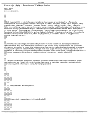ZSPiG Siedlec Promocja płyty o Powstaniu Wielkopolskim Autor: Admin 22.01.2006. Zmieniony 28.12.2008. 19 stycznia 2006 r. w świetlicy szkolnej odbyła się uroczysta prezentacja płyty o Powstaniu Wielkopolskim wykonanej przez uczniów Gimnazjum w Siedlcu. Wszystko zaczęło się od projektu, który został wysłany na konkurs programu Równać szanse. Celem Polskiej Fundacji Dzieci i Młodzieży, która prowadzi ten program, jest wyrównywanie szans młodzieży wiejskiej, tak aby miała ona takie same możliwości rozwoju jak młodzież miejska. Projekt napisali: dyrektor Dorota Brudło, nasza historyczka Zofia Mąkosa i informatyk pan Zbigniew Wąsik. Celem projektu zatytułowanego "Na tropach historii: Powstanie Wielkopolskie 1918/1919 w gminie Siedlec i okolicach" było stworzenie płyty z informacjami o Powstaniu Wielkopolskim 1918/1919, które byłyby pomocą w nauczaniu historii, w przygotowaniu uczniów do konkursów itd. W końcu roku szkolnego 2004/2005 otrzymaliśmy radosną wiadomość, że nasz projekt został zaakceptowany, a na jego realizację otrzymaliśmy 5 tys. złotych. Choć może wydawać się, że to mało, dla naszego gimnazjum ta kwota była bardzo ważna. Nas uczniów najbardziej zainteresowała propozycja wakacyjnych wędrówek tropami historii, dlatego dość duża grupa młodzieży włączyła się w pracę nad projektem. A pieniądze już zostały zainwestowane - kupiono nowoczesny aparat cyfrowy oraz dyktafon - rzeczy bardzo przydatne obecnie redakcjom strony internetowej i gazetki szkolnej. Ja sama chciałam się dowiedzieć się czegoś o walkach powstańczych na naszych terenach, bo tak naprawdę mało jest ?ródeł, które o nich mówią. Faktycznie ta płyta była niezbędna - potrzebne było zebranie wszystkich informacji w jedną, harmonijną całość. Przygotowania do uroczystości Uroczystość rozpoczęła p. dyr Dorota Brudło http://www.zspigsiedlec.pl Kreator PDF Utworzono 8 March, 2017, 07:05 ZSPiG Siedlec Wystąpienie pani Zofii Mąkosy Maciej i Kasia opowiadają o prezentacji O swojej pracy mówi Ala Brudło Przedstawiciele władz gminy z podarunkami dla szkoły Pani dyrektor odbiera prezent dla Gimnazjum - radiomagnetofon Każda z dziewcząt otrzymała różę Głos zabrał p. Marian Śmiałek - historyk, emerytowny nauczyciel naszego Gimnazjum oraz prezes TPPW Uczestnicy projektu byli zafascynowani własną pracą http://www.zspigsiedlec.pl Kreator PDF Utworzono 8 March, 2017, 07:05 ZSPiG Siedlec Na stole zostały już tylko soki... Wywiad z wójtem (nieopublikowany, gdyż zapomniałam włączyć dyktafon...). W czasie wakacji odwiedziliśmy Wolsztyn i kilka miejsc związanych z powstaniem w gminie. Naszymi opiekunami byli: pani Zofia Mąkosa (sprawy związane z historią), pan Zbigniew Wąsik (sprawy informatyczne) oraz pani dyrektor Dorota Brudło. Spotykaliśmy się z historykami, którzy opowiadali nam o walkach. Zupełnie nie wiedzieliśmy, że niektóre budynki, znane nam na co dzień, odegrały ważną rolę w powstaniu. Byliśmy zaskoczeni, że niedaleko nas stoczono ważne bitwy. Pierwszy wyjazd był do Wolsztyna (7 lipca 2005r.) - tam, na wolsztyńskim rynku, wysłuchaliśmy wykładu pana Zbigniewa Kowalewicza o powstaniu, a pó?niej z nim, jako przewodnikiem, odbyliśmy spacer po mieście, zwiedziliśmy miejsca pamięci i obejrzeliśmy ważne budynki. A wszystko to skrzętnie dokumentowaliśmy za pomocą dyktafonu i aparatu fotograficznego. Bardzo przyjemne i potrzebne było to, że na koniec spotkania w Wolsztynie poszliśmy do pizzerii i każdy mógł zjeść to, co chciał. Zamówiliśmy sobie jakieś jedzonko i pochłanialiśmy wszystko w zatrważającym tempie. Kolejna wycieczka była do Kopanicy. Jechaliśmy rowerami szlakiem powstańców. Na miejscu pan Dariusz Poszwiński opowiedział nam o walkach o tę miejscowość. Do swej opowieści dodał także wiele ciekawostek historycznych z historii Kopanicy. A potem, zgłodniali (jak zawsze) udaliśmy się na frytki i colę. Niestety, te kalorie, które spaliliśmy na rowerkach, natychmiast nadrobiliśmy, jedząc smakowite rzeczy. Trzeci wyjazd to biwak w Grójcu Wielkim. Tego miejsca nie mogło zabraknąć w naszej wędrówce, bo tu rozegrała się bitwa o przyczółek mostowy. W Grójcu Wielkim czekała na nas niespodzianka zostaliśmy zaproszeni na rejs po Jeziorze Chobienickim oraz Jeziorze Grójeckim. We wspaniałym klimacie - wieczorem, przy ognisku, pan Poszwiński zrelacjonował nam walki, które toczyły się właśnie tu, gdzie płonął ogień, a my jedliśmy kiełbaski. Przyszła tam również miejscowa młodzież, ale co dziwne, nie chciała jeść kiełbasek, być może ciekawiła ich tylko historia? Rano wstaliśmy obolali po noclegu na podłodze wiejskiej świetlicy. Niewygody wynagrodziło nam wspaniałe śniadanie na świeżym powietrzu, które razem przygotowaliśmy. Następnie znów wsiedliśmy na rowery i ruszyliśmy w dalsza drogę - do Chobienic i Zakrzewa, gdzie odwiedziliśmy groby powstańców. http://www.zspigsiedlec.pl Kreator PDF Utworzono 8 March, 2017, 07:05 ZSPiG Siedlec W czasie wakacji odbyły się trzy wycieczki, ale to wcale nie był koniec naszej pracy. W roku szkolnym odwiedziliśmy Izbę Pamięci. Tam mogliśmy pooglądać eksponaty, a nawet niektóre włożyć, aby wykonać zdjęcia. Od listopada uczyliśmy się obsługi różnych programów komputerowych. Przy ich pomocy niektórych z nich wykonywaliśmy obróbkę zdjęć, które zrobiliśmy podczas naszych wypraw. Nagrane teksty zostały przeniesione na komputer, tak żeby można było wykorzystać je przy tworzeniu płyty. Zima to okres wytężonej pracy. W jej rezultacie powstał końcowy zarys płyty. Na niej znalazła się prezentacja o Powstaniu Wielkopolskim na terenie gminy Siedlec i w okolicach oraz obszerny dokument tekstowy, zawierający szczegółowe informacje o tych walkach wraz z dokumentacją fotograficzną. Rozpierała nas duma, gdy 19 stycznia na uroczystości koń
