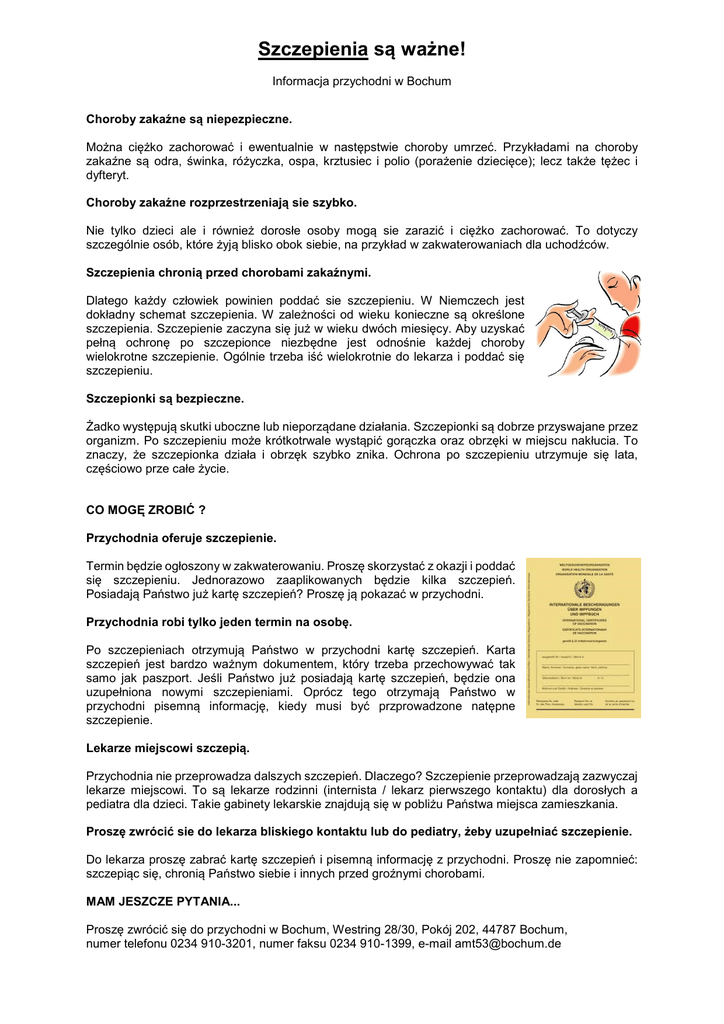 Szczepienia są ważne! Informacja przychodni w Bochum Choroby zakaźne są niepezpieczne. Można ciężko zachorować i ewentualnie w następstwie choroby umrzeć. Przykładami na choroby zakaźne są odra, świnka, różyczka, ospa, krztusiec i polio (porażenie dziecięce); lecz także tężec i dyfteryt. Choroby zakaźne rozprzestrzeniają sie szybko. Nie tylko dzieci ale i również dorosłe osoby mogą sie zarazić i ciężko zachorować. To dotyczy szczególnie osób, które żyją blisko obok siebie, na przykład w zakwaterowaniach dla uchodźców. Szczepienia chronią przed chorobami zakaźnymi. Dlatego każdy człowiek powinien poddać sie szczepieniu. W Niemczech jest dokładny schemat szczepienia. W zależności od wieku konieczne są określone szczepienia. Szczepienie zaczyna się już w wieku dwóch miesięcy. Aby uzyskać pełną ochronę po szczepionce niezbędne jest odnośnie każdej choroby wielokrotne szczepienie. Ogólnie trzeba iść wielokrotnie do lekarza i poddać się szczepieniu. Szczepionki są bezpieczne. Żadko występują skutki uboczne lub nieporządane działania. Szczepionki są dobrze przyswajane przez organizm. Po szczepieniu może krótkotrwale wystąpić gorączka oraz obrzęki w miejscu nakłucia. To znaczy, że szczepionka działa i obrzęk szybko znika. Ochrona po szczepieniu utrzymuje się lata, częściowo prze całe życie. CO MOGĘ ZROBIĆ ? Przychodnia oferuje szczepienie. Termin będzie ogłoszony w zakwaterowaniu. Proszę skorzystać z okazji i poddać się szczepieniu. Jednorazowo zaaplikowanych będzie kilka szczepień. Posiadają Państwo już kartę szczepień? Proszę ją pokazać w przychodni. Przychodnia robi tylko jeden termin na osobę. Po szczepieniach otrzymują Państwo w przychodni kartę szczepień. Karta szczepień jest bardzo ważnym dokumentem, który trzeba przechowywać tak samo jak paszport. Jeśli Państwo już posiadają kartę szczepień, będzie ona uzupełniona nowymi szczepieniami. Oprócz tego otrzymają Państwo w przychodni pisemną informację, kiedy musi być przprowadzone natępne szczepienie. Lekarze miejscowi szczepią. Przychodnia nie przeprowadza dalszych szczepień. Dlaczego? Szczepienie przeprowadzają zazwyczaj lekarze miejscowi. To są lekarze rodzinni (internista / lekarz pierwszego kontaktu) dla dorosłych a pediatra dla dzieci. Takie gabinety lekarskie znajdują się w pobliżu Państwa miejsca zamieszkania. Proszę zwrócić sie do lekarza bliskiego kontaktu lub do pediatry, żeby uzupełniać szczepienie. Do lekarza proszę zabrać kartę szczepień i pisemną informację z przychodni. Proszę nie zapomnieć: szczepiąc się, chronią Państwo siebie i innych przed groźnymi chorobami. MAM JESZCZE PYTANIA... Proszę zwrócić się do przychodni w Bochum, Westring 28/30, Pokój 202, 44787 Bochum, numer telefonu 0234 910-3201, numer faksu 0234 910-1399, e-mail [email protected]
