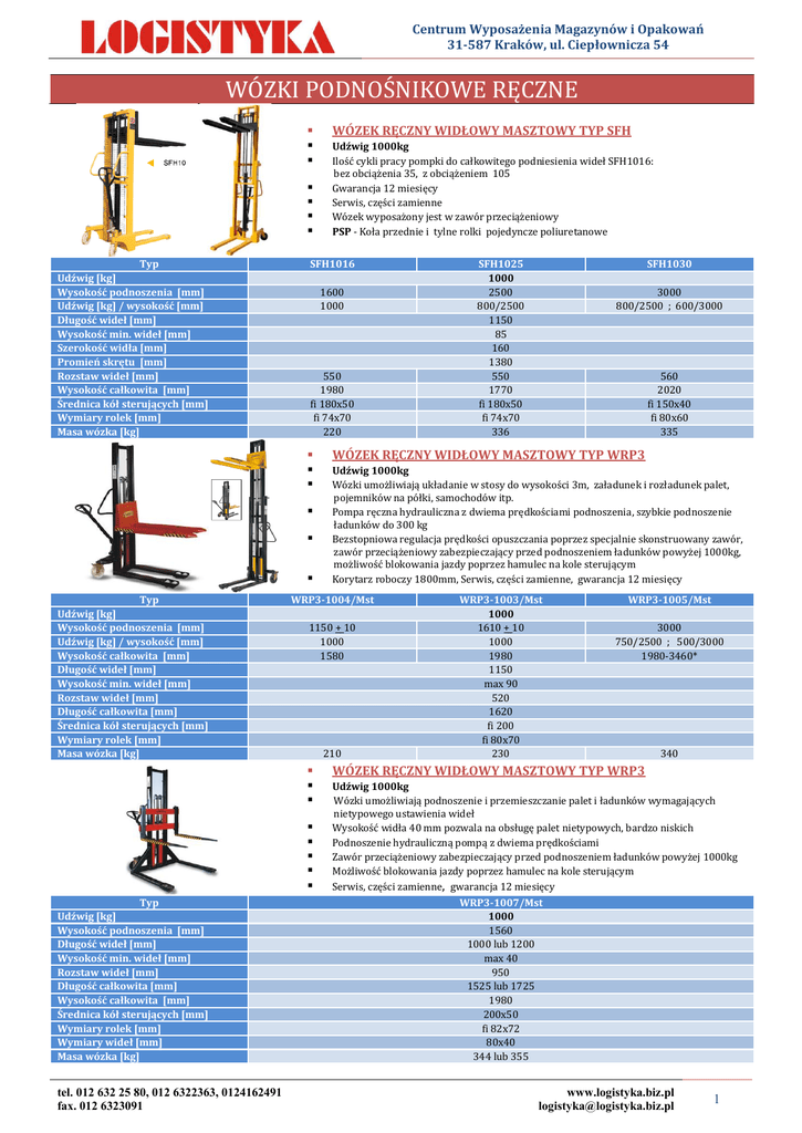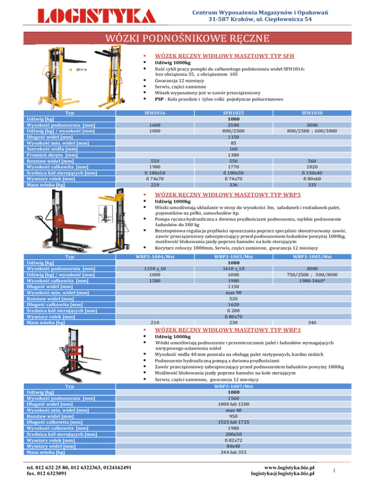 Centrum Wyposażenia Magazynów i Opakowań 31-587 Kraków, ul. Ciepłownicza 54 WÓZKI PODNOŚNIKOWE RĘCZNE Typ Udźwig [kg] Wysokość podnoszenia [mm] Udźwig [kg] / wysokość [mm] Długość wideł [mm] Wysokość min. wideł [mm] Szerokość widła [mm] Promień skrętu [mm] Rozstaw wideł [mm] Wysokość całkowita [mm] Średnica kół sterujących [mm] Wymiary rolek [mm] Masa wózka [kg] 1600 1000 550 1980 fi 180x50 fi 74x70 220 tel. 012 632 25 80, 012 6322363, 0124162491 fax. 012 6323091 SFH1030 3000 800/2500 ; 600/3000 560 2020 fi 150x40 fi 80x60 335 Udźwig 1000kg Wózki umożliwiają układanie w stosy do wysokości 3m, załadunek i rozładunek palet, pojemników na półki, samochodów itp. Pompa ręczna hydrauliczna z dwiema prędkościami podnoszenia, szybkie podnoszenie ładunków do 300 kg Bezstopniowa regulacja prędkości opuszczania poprzez specjalnie skonstruowany zawór, zawór przeciążeniowy zabezpieczający przed podnoszeniem ładunków powyżej 1000kg, możliwość blokowania jazdy poprzez hamulec na kole sterującym Korytarz roboczy 1800mm, Serwis, części zamienne, gwarancja 12 miesięcy 1150 + 10 1000 1580 210 SFH1025 1000 2500 800/2500 1150 85 160 1380 550 1770 fi 180x50 fi 74x70 336 WÓZEK RĘCZNY WIDŁOWY MASZTOWY TYP WRP3 WRP3-1004/Mst Typ Udźwig [kg] Wysokość podnoszenia [mm] Długość wideł [mm] Wysokość min. wideł [mm] Rozstaw wideł [mm] Długość całkowita [mm] Wysokość całkowita [mm] Średnica kół sterujących [mm] Wymiary rolek [mm] Wymiary wideł [mm] Masa wózka [kg] Udźwig 1000kg Ilość cykli pracy pompki do całkowitego podniesienia wideł SFH1016: bez obciążenia 35, z obciążeniem 105 Gwarancja 12 miesięcy Serwis, części zamienne Wózek wyposażony jest w zawór przeciążeniowy PSP - Koła przednie i tylne rolki pojedyncze poliuretanowe SFH1016 Typ Udźwig [kg] Wysokość podnoszenia [mm] Udźwig [kg] / wysokość [mm] Wysokość całkowita [mm] Długość wideł [mm] Wysokość min. wideł [mm] Rozstaw wideł [mm] Długość całkowita [mm] Średnica kół sterujących [mm] Wymiary rolek [mm] Masa wózka [kg] WÓZEK RĘCZNY WIDŁOWY MASZTOWY TYP SFH WRP3-1003/Mst 1000 1610 + 10 1000 1980 1150 max 90 520 1620 fi 200 fi 80x70 230 WRP3-1005/Mst 3000 750/2500 ; 500/3000 1980-3460* 340 WÓZEK RĘCZNY WIDŁOWY MASZTOWY TYP WRP3 Udźwig 1000kg Wózki umożliwiają podnoszenie i przemieszczanie palet i ładunków wymagających nietypowego ustawienia wideł Wysokość widła 40 mm pozwala na obsługę palet nietypowych, bardzo niskich Podnoszenie hydrauliczną pompą z dwiema prędkościami Zawór przeciążeniowy zabezpieczający przed podnoszeniem ładunków powyżej 1000kg Możliwość blokowania jazdy poprzez hamulec na kole sterującym Serwis, części zamienne, gwarancja 12 miesięcy WRP3-1007/Mst 1000 1560 1000 lub 1200 max 40 950 1525 lub 1725 1980 200x50 fi 82x72 80x40 344 lub 355 www.logistyka.biz.pl [email protected] 1 Centrum Wyposażenia Magazynów i Opakowań 31-587 Kraków, ul. Ciepłownicza 54 WÓZKI PODNOŚNIKOWE RĘCZNE Typ Udźwig [kg] Wysokość podnoszenia [mm] Max. wysokość platformy [mm] Wysokość całkowita [mm] Wysokość min. platformy [mm] Szerokość wózka [mm] Długość platformy [mm] Szerokość platformy [mm] Średnica kół sterujących [mm] Wymiary rolek [mm] Masa wózka [kg] tel. 012 632 25 80, 012 6322363, 0124162491 fax. 012 6323091 WÓZEK RĘCZNY WIDŁOWY PLATFORMOWY TYP PS Udźwig 400kg Specjalne wykonanie wózka podnośnikowego widłowego wraz z platformą - podnoszenie, transport, piętrowanie Platforma nakładana na widły Pompa nożna hydrauliczna Możliwość blokowania jazdy poprzez hamulec na kole sterującym Gwarancja 12 miesięcy Serwis, części zamienne Wózek wyposażony jest w zawór przeciążeniowy PSP - Koła przednie i tylne rolki pojedyncze poliuretanowe PS0412 PS0415 400 1115 1415 1200 1500 1425 1725 85 600 650 576 fi 127x40 fi 75x40 81 91 www.logistyka.biz.pl [email protected] 2