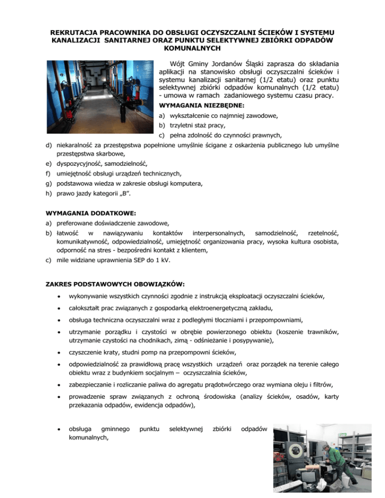 REKRUTACJA PRACOWNIKA DO OBSŁUGI OCZYSZCZALNI ŚCIEKÓW I SYSTEMU KANALIZACJI SANITARNEJ ORAZ PUNKTU SELEKTYWNEJ ZBIÓRKI ODPADÓW KOMUNALNYCH Wójt Gminy Jordanów Śląski zaprasza do składania aplikacji na stanowisko obsługi oczyszczalni ścieków i systemu kanalizacji sanitarnej (1/2 etatu) oraz punktu selektywnej zbiórki odpadów komunalnych (1/2 etatu) - umowa w ramach zadaniowego systemu czasu pracy. WYMAGANIA NIEZBĘDNE: a) wykształcenie co najmniej zawodowe, b) trzyletni staż pracy, c) pełna zdolność do czynności prawnych, d) niekaralność za przestępstwa popełnione umyślnie ścigane z oskarżenia publicznego lub umyślne przestępstwa skarbowe, e) dyspozycyjność, samodzielność, f) umiejętność obsługi urządzeń technicznych, g) podstawowa wiedza w zakresie obsługi komputera, h) prawo jazdy kategorii „B”. WYMAGANIA DODATKOWE: a) preferowane doświadczenie zawodowe, b) łatwość w nawiązywaniu kontaktów interpersonalnych, samodzielność, rzetelność, komunikatywność, odpowiedzialność, umiejętność organizowania pracy, wysoka kultura osobista, odporność na stres - bezpośredni kontakt z klientem, c) mile widziane uprawnienia SEP do 1 kV. ZAKRES PODSTAWOWYCH OBOWIĄZKÓW: • wykonywanie wszystkich czynności zgodnie z instrukcją eksploatacji oczyszczalni ścieków, • całokształt prac związanych z gospodarką elektroenergetyczną zakładu, • obsługa techniczna oczyszczalni wraz z podległymi tłoczniami i przepompowniami, • utrzymanie porządku i czystości w obrębie powierzonego obiektu (koszenie trawników, utrzymanie czystości na chodnikach, zimą - odśnieżanie i posypywanie), • czyszczenie kraty, studni pomp na przepompowni ścieków, • odpowiedzialność za prawidłową pracę wszystkich urządzeń oraz porządek na terenie całego obiektu wraz z budynkiem socjalnym – oczyszczalnia ścieków, • zabezpieczanie i rozliczanie paliwa do agregatu prądotwórczego oraz wymiana oleju i filtrów, • prowadzenie spraw związanych z ochroną środowiska (analizy ścieków, osadów, karty przekazania odpadów, ewidencja odpadów), • obsługa gminnego komunalnych, punktu selektywnej zbiórki odpadów • kontrola nieruchomości zamieszkałych i niezamieszkałych celem weryfikacji zgodności stanu faktycznego z danymi wynikającymi z deklaracjami dot. gospodarowania odpadami komunalnymi, • nadzór nad prawidłowością realizacji selektywnego gromadzenia opadów komunalnych, • prowadzenie i podstawowa obsługa samochodu służbowego, • wykonywanie drobnych prac konserwacyjno-remontowych. WYMAGANE DOKUMENTY: a) list motywacyjny z podanym numerem telefonu kontaktowego, b) Curriculum Vitae, c) kserokopie świadectw pracy, d) kserokopie dokumentów potwierdzających wykształcenie (świadectwa szkolne, dyplomy), e) oświadczenie kandydata o niekaralności za umyślne przestępstwo ścigane z oskarżenia publicznego lub umyślne przestępstwo skarbowe, f) oświadczenie o pełnej zdolności do czynności prawnych oraz o korzystaniu z pełni praw publicznych, g) oświadczenie kandydata o stanie zdrowia pozwalającym na zatrudnienie na wyszczególnionym stanowisku (w przypadku zatrudnienia kandydat zostanie skierowany na wstępne badania lekarskie do wskazanego lekarza medycyny pracy), h) kserokopia dokumentu potwierdzającego obywatelstwo polskie i ukończenie osiemnastego roku życia, i) kserokopie zaświadczeń o ukończonych kursach, szkoleniach, j) kwestionariusz osobowy dla osoby ubiegającej się o zatrudnienie, k) inne dodatkowe dokumenty uznane za ważne przez kandydata zainteresowanego pracą. Wysokość wynagrodzenia - stosownie do Zarządzenia nr 12/2009 Wójta Gminy Jordanów Śląski z dnia 18 maja 2009 r. w sprawie ustanowienia regulaminu wynagradzania pracowników zatrudnionych w Urzędzie Gminy Jordanów Śląski. Osoby zainteresowane prosimy o składanie ofert osobiście bądź pocztą na adres: Urząd Gminy Jordanów Śląski, ul. Wrocławska 55, 55-065 Jordanów Śląski (sekretariat urzędu) z dopiskiem „Oferta pracy – oczyszczalnia ścieków, PSZOK”, w terminie do dnia 20 czerwca 2013 r. do godz. 15.15 (decyduje data wpływu oferty do urzędu). Dokumenty, które wpłyną do urzędu po wyżej określonym terminie nie będą rozpatrywane. Do wymaganych dokumentów aplikacyjnych należy dołączyć oświadczenie treści: „Wyrażam zgodę na przetwarzanie moich danych osobowych zawartych w ofercie pracy dla potrzeb niezbędnych do realizacji procesu rekrutacji zgodnie z Ustawą z dnia 29 sierpnia 1997 r. o ochronie danych osobowych (Dz. U. z 2002 r. Nr 101, poz. 926 ze zm.) oraz ustawą z dnia 21 listopada 2008 r. o pracownikach samorządowych (Dz. U. z 2008 r. Nr 223, poz. 1458 ze zm.)”. Inne informacje: Informacja o wynikach naboru zostanie ogłoszona w Biuletynie Informacji Publicznej Urzędu Gminy Jordanów Śląski, www.bip.jordanowslaski.pl. Wybrani kandydaci spełniający wymogi formalne zostaną indywidualnie poinformowani o terminie rozmowy kwalifikacyjnej. Dodatkowe informacje w zakresie spraw formalnych i merytorycznych uzyskać można u p. Grzegorza Gawła - Sekretarza Gminy, tel. 71 39 11 584. Organizator procesu rekrutacyjnego zastrzega sobie prawo do jego odwołania, bez podania przyczyn.