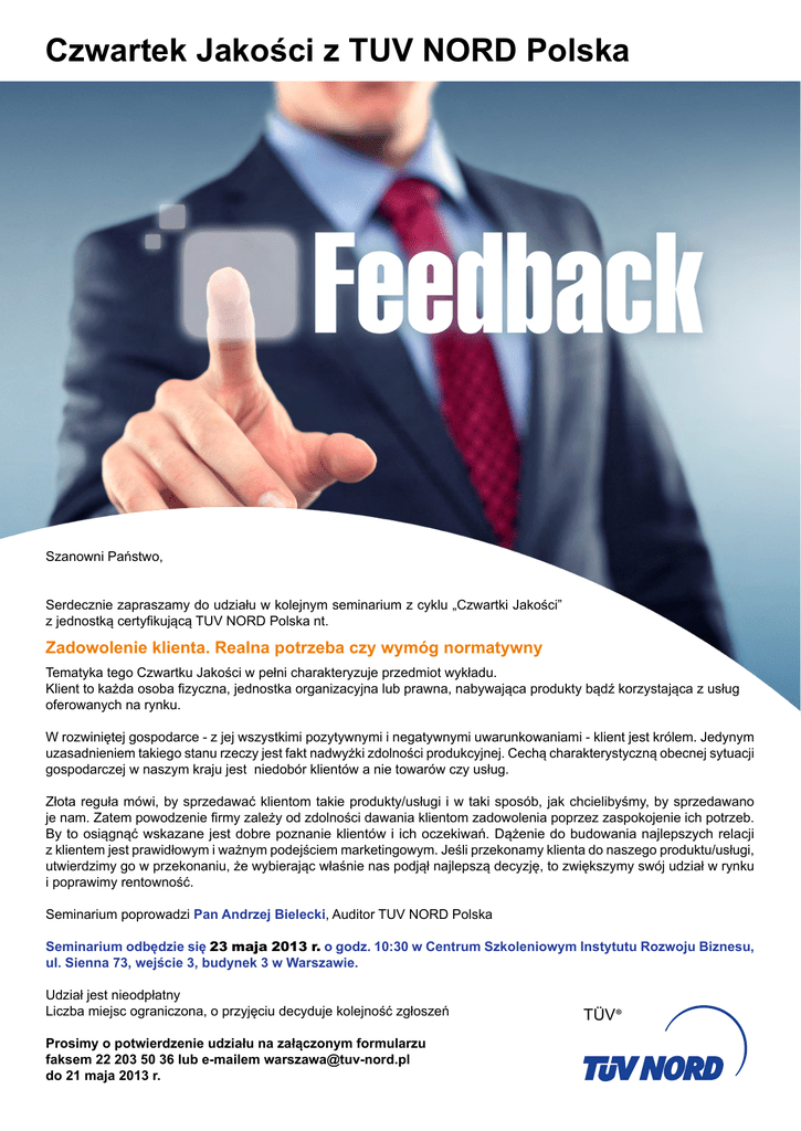 Czwartek Jakości z TUV NORD Polska Szanowni Państwo, Serdecznie zapraszamy do udziału w kolejnym seminarium z cyklu „Czwartki Jakości” z jednostką certyfikującą TUV NORD Polska nt. Zadowolenie klienta. Realna potrzeba czy wymóg normatywny Tematyka tego Czwartku Jakości w pełni charakteryzuje przedmiot wykładu. Klient to każda osoba fizyczna, jednostka organizacyjna lub prawna, nabywająca produkty bądź korzystająca z usług oferowanych na rynku. W rozwiniętej gospodarce - z jej wszystkimi pozytywnymi i negatywnymi uwarunkowaniami - klient jest królem. Jedynym uzasadnieniem takiego stanu rzeczy jest fakt nadwyżki zdolności produkcyjnej. Cechą charakterystyczną obecnej sytuacji gospodarczej w naszym kraju jest niedobór klientów a nie towarów czy usług. Złota reguła mówi, by sprzedawać klientom takie produkty/usługi i w taki sposób, jak chcielibyśmy, by sprzedawano je nam. Zatem powodzenie firmy zależy od zdolności dawania klientom zadowolenia poprzez zaspokojenie ich potrzeb. By to osiągnąć wskazane jest dobre poznanie klientów i ich oczekiwań. Dążenie do budowania najlepszych relacji z klientem jest prawidłowym i ważnym podejściem marketingowym. Jeśli przekonamy klienta do naszego produktu/usługi, utwierdzimy go w przekonaniu, że wybierając właśnie nas podjął najlepszą decyzję, to zwiększymy swój udział w rynku i poprawimy rentowność. Seminarium poprowadzi Pan Andrzej Bielecki, Auditor TUV NORD Polska Seminarium odbędzie się 23 maja 2013 r. o godz. 10:30 w Centrum Szkoleniowym Instytutu Rozwoju Biznesu, ul. Sienna 73, wejście 3, budynek 3 w Warszawie. Udział jest nieodpłatny Liczba miejsc ograniczona, o przyjęciu decyduje kolejność zgłoszeń Prosimy o potwierdzenie udziału na załączonym formularzu faksem 22 203 50 36 lub e-mailem [email protected] do 21 maja 2013 r. TÜV® FORMULARZ ZGŁOSZENIOWY CZWARTEK JAKOŚCI Warszawa, 23.05.2013, godz 10:30, Centrum Szkoleniowe Instytutu Rozwoju Biznesu, ul. Sienna 73, wejście 3, budynek 3, TUV NORD Polska Sp. z o.o. Biuro Regionalne w Warszawie, ul. Krucza 6/14, 00-537 Warszawa tel.: 22 276 37 90, fax.: 22 203 50 36, e-mail: [email protected] Dane uczestników spotkania: Pełna nazwa firmy Ulica i numer Tel / fax Kod i miejscowość NIP 1 2 Imię i nazwisko Stanowisko Telefon e-mail Przesyłając niniejszy formularz zgadzam się na wykorzystywanie przez TUV NORD Polska moich danych (w tym adresu poczty elektronicznej) w celach związanych z organizacją spotkania, pod warunkiem przestrzegania przepisów ustawy z dnia 29 sierpnia 1997r. o ochronie danych osobowych (t. jedn. Dz. U. z 2002 r. Nr 101, poz. 926) i na przekazywanie danych uczestnika firmom biorącym udział w opracowaniu programu szkoleniowego. Informujemy, że przysługuje Państwu prawo dostępu do treści swoich danych osobowych, ich poprawienia lub usunięcia. TUV NORD Polska zastrzega sobie prawo do wystawienia faktury i obciążenia kosztami w wysokości 50 zł netto / os., te osoby, które się zgłoszą do udziału w seminarium, a nie wezmą w nim udziału i nie odwołają pisemnie uczestnictwa do dnia 21.05.2013 r. Zapis ten dotyczy przedstawicieli firm, które nie są certyfikowane przez TUV NORD Polska Sp. z o.o. Warunkiem uczestnictwa w spotkaniu jest: ■■ przesłanie do Biura TUV NORD Polska Sp. z o.o. wypełnionego formularza zgłoszeniowego na numer faksu 22 203 50 36 lub e-mail [email protected] Z racji ograniczonej ilości miejsc prosimy o jak najszybsze przesłanie zgłoszeń z potwierdzeniem Państwa uczestnictwa. Zapraszamy serdecznie do udziału w spotkaniu! Wyrażamy zgodę na otrzymywanie informacji handlowych przesyłanych drogą elektroniczną: (Zgodnie z ustawą z dnia 18 lipca 2002 r. o świadczeniu usług drogą elektroniczną (Dz. U. Nr 144, poz. 1204) TAK (miejscowość data) NIE (podpis osoby upoważnionej)