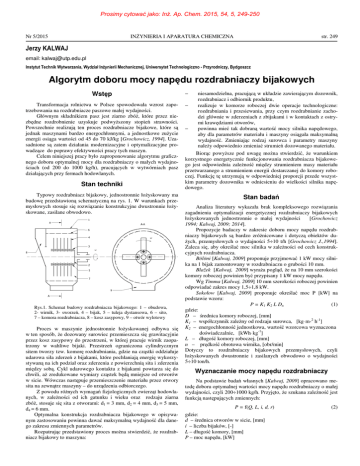 Prosimy cytować jako: Inż. Ap. Chem. 2015, 54, 5, 249-250 Nr 5/2015 INŻYNIERIA I APARATURA CHEMICZNA str. 249 Jerzy KALWAJ email: [email protected] Instytut Technik Wytwarzania, Wydział Inżynierii Mechanicznej, Uniwersytet Technologiczno - Przyrodniczy, Bydgoszcz Algorytm doboru mocy napędu rozdrabniaczy bijakowych Wstęp Transformacja rolnictwa w Polsce spowodowała wzrost zapotrzebowania na rozdrabniacze paszowe małej wydajności. Głównym składnikiem pasz jest ziarno zbóż, które przez niezbędne rozdrobnienie uzyskuje podwyższony stopień strawności. Powszechnie realizują ten proces rozdrabniacze bijakowe, które są jednak maszynami bardzo energochłonnymi, a jednostkowe zużycie energii osiąga wartości od 45 do 70 kJ/kg [Grochowicz, 1994]. Uzasadnione są zatem działania modernizacyjne i optymalizacyjne prowadzące do poprawy efektywności pracy tych maszyn. Celem niniejszej pracy było zaproponowanie algorytmu graficznego doboru optymalnej mocy dla rozdrabniaczy o małych wydajnościach (od 200 do 1000 kg/h), pracujących w wytwórniach pasz działających przy fermach hodowlanych. Stan techniki Typowy rozdrabniacz bijakowy, jednostronnie łożyskowany ma budowę przedstawioną schematyczną na rys. 1. W warunkach przemysłowych stosuje się rozwiązanie konstrukcyjne dwustronnie łożyskowane, zasilane obwodowo. Rys.1. Schemat budowy rozdrabniacza bijakowego: 1 – obudowa, 2- wirnik, 3- sworzeń, 4 – bijak, 5 – tuleja dystansowa, 6 – sito, 7 – komora rozdrabniacza, 8 – kosz zasypowy, 9 – otwór wylotowy Proces w maszynie jednostronnie łożyskowanej odbywa się w ten sposób, że dozowany surowiec przemieszcza się grawitacyjnie przez kosz zasypowy do przestrzeni, w której pracuje wirnik zaopatrzony w wahliwe bijaki. Przestrzeń ograniczona cylindrycznym sitem tworzy tzw. komorę rozdrabniania, gdzie na cząstki oddziałuje udarowa siła zderzeń z bijakami, które pochłaniają energię wykorzystywaną na ich podział oraz zderzenia z powierzchnią sita i zderzenia między sobą. Cykl udarowego kontaktu z bijakami powtarza się do chwili, aż zredukowane wymiary cząstek będą mniejsze od otworów w sicie. Wówczas następuje przemieszczenie materiału przez otwory sita na zewnątrz maszyny – do urządzenia odbiorczego. Z powodu różnych wymagań fizjologicznych zwierząt hodowlanych, w zależności od ich gatunku i wieku oraz rodzaju ziarna zbóż, stosuje się sita z otworami: d1 = 3 mm, d2 = 4 mm, d3 = 5 mm, d4 = 6 mm. Optymalna konstrukcja rozdrabniacza bijakowego w opisywanym zastosowaniu powinna dawać maksymalną wydajność dla danego zakresu zmiennych parametrów. Rozpatrując przedstawiony proces można stwierdzić, że rozdrabniacz bijakowy to maszyna: niesamodzielna, pracującą w układzie zawierającym dozownik, rozdrabniacz i odbiornik produktu, − realizuje w komorze roboczej dwie operacje technologiczne: rozdrabniania i przesiewania, przy czym rozdrabnianie zachodzi głównie w zderzeniach z zbijakami i w kontaktach z ostrymi krawędziami otworów, − powinna mieć tak dobraną wartość mocy silnika napędowego, aby dla parametrów materiału i maszyny osiągała maksymalną wydajność. Zmieniając rodzaj surowca i parametry maszyny należy odpowiednio zmieniać strumień dozowanego materiału. Biorąc powyższe pod uwagę można stwierdzić, że warunkiem korzystnego energetycznie funkcjonowania rozdrabniacza bijakowego jest odpowiednia zależność między strumieniem masy materiału przetwarzanego a strumieniem energii dostarczanej do komory roboczej. Funkcję tę utrzymują w odpowiedniej proporcji przede wszystkim parametry dozownika w odniesieniu do wielkości silnika napędowego. − Stan badań Analiza literatury wykazała brak kompleksowego rozwiązania zagadnienia optymalizacji energetycznej rozdrabniaczy bijakowych łożyskowanych jednostronnie o małej wydajności [Grochowicz 1994; Kalwaj, 2009; 2014]. Propozycje badaczy w zakresie doboru mocy napędu rozdrabniaczy bijakowych są bardzo zróżnicowane i dotyczą obiektów dużych, przemysłowych o wydajności 5÷10 t/h [Grochowicz J.,1994]. Zaleca się, aby określać moc silnika w zależności od cech konstrukcyjnych rozdrabniacza. Bölöni [Kalwaj, 2009] proponuje przyjmować 1 kW mocy silnika na 1 bijak zamontowany w rozdrabniaczu o grubości 10 mm. Blažek [Kalwaj, 2009] wyraża pogląd, że na 10 mm szerokości komory roboczej powinien być przypisany 1 kW mocy napędu. Wg Timma [Kalwaj, 2009] 10 mm szerokości roboczej powinien odpowiadać zakres mocy 1,5÷1,8 kW. Sokołow [Kalwaj, 2009] proponuje określać moc P [kW] na podstawie wzoru: P = K1 K2 L Dn (1) gdzie: D – średnica komory roboczej, [mm] K1 – współczynnik zależny od rodzaju surowca, [kgּm-2 h-1] K2 – energochłonność jednostkowa, wartość wzorcowa wyznaczona doświadczalnie, [kWhּkg-1] L – długość komory roboczej, [mm] n – prędkość obrotowa wirnika, [obr/min] Dotyczy to rozdrabniaczy bijakowych przemysłowych, czyli łożyskowanych dwustronnie i zasilanych obwodowo o wydajności 5÷10 ton/h. Wyznaczanie mocy napędu rozdrabniaczy Na podstawie badań własnych [Kalwaj, 2009] opracowano metodę doboru optymalnej wartości mocy napędu rozdrabniaczy o małej wydajności, czyli 200÷1000 kg/h. Przyjęto, że szukana zależność jest funkcją następujących zmiennych: P = f(Q, L, i, d, r) gdzie: d – średnica otworów w sicie, [mm] i – liczba bijaków, [-] L – długość komory, [mm] P – moc napędu, [kW] (2) Prosimy cytować jako: Inż. Ap. Chem. 2015, 54, 5, 249-250 str. 250 INŻYNIERIA I APARATURA CHEMICZNA Q – wydajność masowa, [kg/h] r – rodzaj ziarna (pszenica, jęczmień, żyto, owies, kukurydza). Natomiast jako czynniki stałe przyjęto geometrię bijaków (70 x 30 x 3 mm) oraz prędkość obwodową końca bijaków (80 m/s) i czynnik zakłócający, jakim jest zmienna wilgotność surowca (0,1 %). W celu rozwiązania równ. (2) zbudowano laboratoryjne 