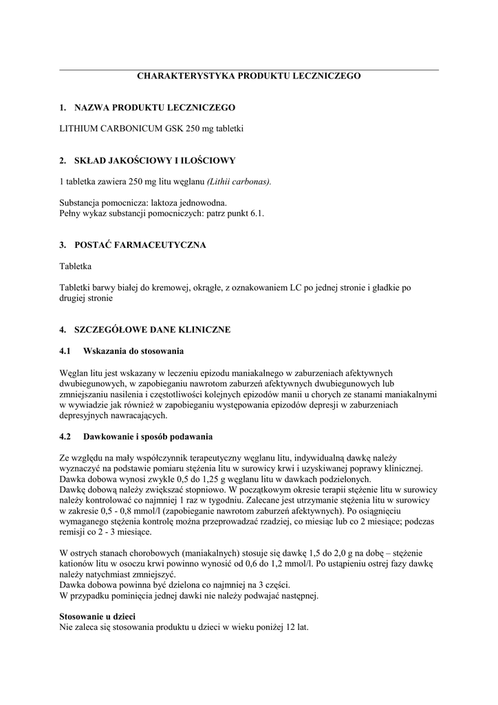 CHARAKTERYSTYKA PRODUKTU LECZNICZEGO 1. NAZWA PRODUKTU LECZNICZEGO LITHIUM CARBONICUM GSK 250 mg tabletki 2. SKŁAD JAKOŚCIOWY I ILOŚCIOWY 1 tabletka zawiera 250 mg litu węglanu (Lithii carbonas). Substancja pomocnicza: laktoza jednowodna. Pełny wykaz substancji pomocniczych: patrz punkt 6.1. 3. POSTAĆ FARMACEUTYCZNA Tabletka Tabletki barwy białej do kremowej, okrągłe, z oznakowaniem LC po jednej stronie i gładkie po drugiej stronie 4. SZCZEGÓŁOWE DANE KLINICZNE 4.1 Wskazania do stosowania Węglan litu jest wskazany w leczeniu epizodu maniakalnego w zaburzeniach afektywnych dwubiegunowych, w zapobieganiu nawrotom zaburzeń afektywnych dwubiegunowych lub zmniejszaniu nasilenia i częstotliwości kolejnych epizodów manii u chorych ze stanami maniakalnymi w wywiadzie jak również w zapobieganiu występowania epizodów depresji w zaburzeniach depresyjnych nawracających. 4.2 Dawkowanie i sposób podawania Ze względu na mały współczynnik terapeutyczny węglanu litu, indywidualną dawkę należy wyznaczyć na podstawie pomiaru stężenia litu w surowicy krwi i uzyskiwanej poprawy klinicznej. Dawka dobowa wynosi zwykle 0,5 do 1,25 g węglanu litu w dawkach podzielonych. Dawkę dobową należy zwiększać stopniowo. W początkowym okresie terapii stężenie litu w surowicy należy kontrolować co najmniej 1 raz w tygodniu. Zalecane jest utrzymanie stężenia litu w surowicy w zakresie 0,5 - 0,8 mmol/l (zapobieganie nawrotom zaburzeń afektywnych). Po osiągnięciu wymaganego stężenia kontrolę można przeprowadzać rzadziej, co miesiąc lub co 2 miesiące; podczas remisji co 2 - 3 miesiące. W ostrych stanach chorobowych (maniakalnych) stosuje się dawkę 1,5 do 2,0 g na dobę – stężenie kationów litu w osoczu krwi powinno wynosić od 0,6 do 1,2 mmol/l. Po ustąpieniu ostrej fazy dawkę należy natychmiast zmniejszyć. Dawka dobowa powinna być dzielona co najmniej na 3 części. W przypadku pominięcia jednej dawki nie należy podwajać następnej. Stosowanie u dzieci Nie zaleca się stosowania produktu u dzieci w wieku poniżej 12 lat. Planowane odstawianie litu Zaleca się stopniowe odstawianie litu (przez okres przynajmniej 2 tygodni) z uwagi na to, że może nastąpić powrót objawów, które były przyczyną leczenia litem. Przerwanie leczenia litem z powodu toksyczności W przypadku pojawienia się pierwszych objawów toksyczności, leczenie powinno być natychmiast przerwane (patrz pkt. 4.4). 4.3 Przeciwwskazania - nadwrażliwość (uczulenie) na substancję czynną lub pozostałe składniki produktu, - ciężka niewydolność nerek, - świeżo przebyty zawał mięśnia sercowego, - organiczne uszkodzenia mózgu, - białaczka, - ciąża (działanie teratogenne w I trymestrze), - okres karmienia piersią (lit przenika do mleka matki). 4.4 Specjalne ostrzeżenia i środki ostrożności dotyczące stosowania Z uwagi na zwiększone ryzyko wystąpienia objawów toksycznych, lit nie powinien być podawany pacjentom, u których występuje: - ciężka niewydolność nerek, - choroba sercowo-naczyniowa, - nieleczona niedoczynność tarczycy, - niewyrównany sód wynikający z odwodnienia, - choroba Addisona, - zmniejszona podaż soli z dietą. Szczególnie ostrożnie należy stosować lit w chorobie Parkinsona, zaburzeniach czynności węzła zatokowego i przewodnictwa zatokowo-komorowego, padaczce, łuszczycy, wrodzonej nużliwości mięśni, cukrzycy, schizofrenii. Przed rozpoczęciem leczenia litem wskazana jest ocena czynności tarczycy, nerek, serca (zapis EKG), oznaczenie stężenia sodu i glukozy w surowicy krwi. Wpływ na nerki Ponieważ lit hamuje wychwyt zwrotny sodu z kanalików nerkowych, dlatego w czasie terapii należy ostrzec pacjenta o konieczności zapewnienia odpowiedniej ilości sodu i wody w diecie. W przypadku biegunki, nadmiernego pocenia (np. w czasie infekcji) może być konieczne zmniejszenie dawki lub czasowe przerwanie terapii. Zmiany histologiczne (w tym nefropatię kanalikowo-miąższową odnotowano po przedłużonym leczeniu litem. Zmiany te mogą prowadzić do zaburzenia czynności nerek. Nie wiadomo, czy te zmiany są zawsze odwracalne po zaprzestaniu stosowania litu. Zaleca się okresowe monitorowanie funkcji nerek. Terapia elektrowstrząsami Odnotowano przypadki zwiększonego ryzyka neurologicznych działań niepożądanych (np. delirium, przedłużone napady i dezorientacja) podczas stosowania u pacjentów leczonych litem terapii elektrowstrząsami (ECT). Jeśli połączone leczenie litem i elektrowstrząsami jest wskazane klinicznie, należy stosować elektrowstrząsy ostrożnie, a pacjenta należy ściśle monitorować. Terapia połączona Należy ściśle monitorować pacjentów, którzy razem z litem otrzymują neuroleptyki pod kątem wczesnych objawów toksyczności neurologicznej i szybkiego zakończenia leczenia w przypadku pojawienia się tych objawów. W bardzo rzadkich przypadkach jednoczesne stosowanie litu i 1.2/12.03.2012/core10.10 2 neuroleptyków może spowodować pojawienie się objawów psychicznych i neurologicznych (tj. delirium, napady lub zwiększona częstość występowania objawów pozapiramidowych), które mogą być podobne lub identyczne jak objawy złośliwego zespołu neuroleptycznego. W niektórych przypadkach, objawy kończyły się nieodwracanym uszkodzeniem mózgu. Toksyczność Leczenie litem należy natychmiast przerwać, jeśli wystąpią pierwsze objawy toksyczności, które obejmują: - zaburzenia sercowo-naczyniowe np. wydłużenie QT/QTc w badaniu EKG - zaburzenia żołądkowo-jelitowe np. biegunka, wymioty i odwodnienie - zaburzenia neurologiczne np. ataksja, drżenie, hipertonia, mimowolne skurcze mięśniowe, hiperrefleksja, zaburzenia mowy, splątanie, senność i oczopląs. Rzadko zgłaszano ostrą niewydolność nerkową w wyniku toksycznego działania litu. Osoby w podeszłym wieku Lit powinien być stosowany ze szczególną ostrożnością u osób w podeszłym wieku, ze względu na to, że 