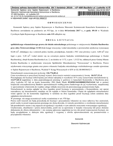 Zmiana adresu kancelarii komornika. Od 1 kwietnia 2016r. : 47-400 Racibórz ul. Ludwika 4/5 Komornik Sądowy przy Sądzie Rejonowym w Raciborzu Sławomir Kaźmierczak Kancelaria Komornicza w Raciborzu 47-400 Racibórz, ul. Ludwika 4/5 Racibórz, dnia 02-02-2017 *9017020200756* tel: 32 417 50 29, [email protected];www.komornik-raciborz.pl w odpowiedzi podać: sygn.akt.Km 4464/12 OBWIESZCZENIE Komornik Sądowy przy Sądzie Rejonowym w Raciborzu Sławomir Kaźmierczak Kancelaria Komornicza w Raciborzu zawiadamia na podstawie art. 953 kpc, że w dniu 04 kwietnia 2017 r., o godz. 09:10 w Wydziale Cywilnym Sądu Rejonowego w Raciborzu sala 119 odbędzie się: DRUGA LICYTACJA spółdzielczego własnościowego prawa do lokalu mieszkalnego położonego w miejscowości Kuźnia Raciborska przy ulicy Świerczewskiego 11/10 (brak księgi wieczystej. Lokal mieszkalny o powierzchni użytkowej wynoszącej 82,06 m2, składający się z czterech pokoi, kuchni, przedpokoju, łzaienki z WC oraz piwnicy o pow. 4,00 m2 oraz logii o pow. 5,20 m2. Lokal mieści się na czwartym piętrze budynku wielolokalowego położonego w Kuźni Raciborskiej, obręb Kuźnia Raciborska k.m. 2, na działce nr 1172, o pow. 1,5122 ha, oddanych przez Gminę Miasta Kuźnia Raciborska w użytkowanie wieczyste Spółdzielni Mieszkaniowej "Nowoczesna" w Raciborzu. Prawo użytkowania wieczystego gruntu oraz prawo własności budynku mieszkalnego wielolokalowego zostało ujawnione w Sądzie Rejonowym w Raciborzu, Wydział V Ksiąg Wieczystych w KW nr GL1R/00038652/7. Nieruchomość oszacowana jest na kwotę: 126.776,00 zł. Cena wywoławcza w powyższej licytacji wynosi: dwie trzecie wartości oszacowania tj. kwotę: 84.517,33 zł. Przystępujący do licytacji zobowiązany jest złożyć rękojmię w wysokości 10 % ceny oszacowania nieruchomości tj. 12.677,60 zł najpóźniej w dniu poprzedzającym przetarg w gotówce w kancelarii Komornika w Raciborzu przy ulicy Ludwika 4/5 lub na konto komornika: ING Bank Ślaski 03105013441000002356214144 lub w postaci książeczki oszczędnościowej Banków upoważnionych według prawa bankowego do jej wystawienia, zaopatrzonej w upoważnienie właściciela do wypłaty całego wkładu stosownie do prawomocnego postanowienia Sądu. Nieruchomość tą można oglądać na dwa tygodnie przed licytacją w porozumieniu z Komornikiem, zaś operat szacunkowy tej nieruchomości znajduje sie do wglądu w biurze komornika. Chętni do oglądania nieruchomości winni zgłosić sie do komornika najpóźniej w terminie na dwa tygodnie przed licytacją celem ustalenia daty oglądania nieruchomości. W przetargu nie mogą uczestniczyć osoby wymienione w art. 976 kpc. Prawa osób trzecich nie będą przeszkodą do licytacji i przysadzenia własności na rzecz nabywcy bez zastrzeżeń, jeżeli osoby te przed rozpoczęciem przetargu nie złożą dowodu, iż wniosły powództwo o zwolnienie nieruchomości lub przedmiotów razem z nią zajętych od egzekucji i uzyskały w tym zakresie orzeczenie wstrzymujące egzekucję; Użytkowanie, służebności i prawa dożywotnika, jeżeli nie sa ujawnione w księdze wieczystej lub przez złożenie dokumentu do zbioru dokumentów i nie zostaną zgłoszone najpóźniej na trzy dni przed rozpoczęciem licytacji, nie będą uwzględnione w dalszym toku egzekucji i wygasną z chwila uprawomocnienia się postanowienia o przysądzeniu własności. Komornik Sławomir Kaźmierczak (Sporządził: MJ )