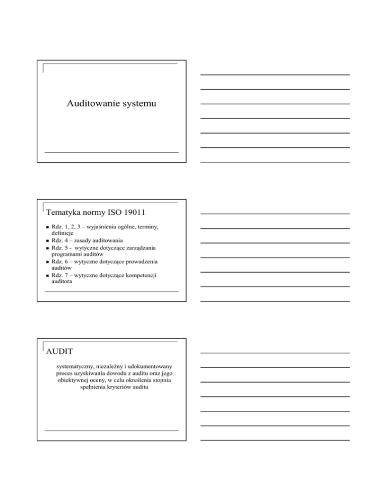 Auditowanie systemu Tematyka normy ISO 19011 Rdz. 1, 2, 3 – wyjaśnienia ogólne, terminy, definicje Rdz. 4 – zasady auditowania Rdz. 5 - wytyczne dotyczące zarządzania programami auditów Rdz. 6 – wytyczne dotyczące prowadzenia auditów Rdz. 7 – wytyczne dotyczące kompetencji auditora AUDIT systematyczny, niezależny i udokumentowany proces uzyskiwania dowodu z auditu oraz jego obiektywnej oceny, w celu określenia stopnia spełnienia kryteriów auditu KRYTERIA AUDITU Zestaw polityk, procedur lub wymagań wg ISO 19011:2002 - Norma - Dokumentacja systemu zarządzania - Plan jakości - Inne, w tym przepisy prawne DOWÓD Z AUDITU Zapisy, stwierdzenia faktu lub inne informacje istotne ze względu na kryteria auditu i możliwe do zweryfikowania (wg ISO 19011:2002) CELE AUDITU określenie zgodności auditowanego systemu zarządzania z kryteriami auditu; ocena zdolności systemu zarządzania do zapewnienia zgodności z wymaganiami wynikającymi z ustaw, przepisów i umów; ocena skuteczności systemu zarządzania w osiąganiu wyspecyfikowanych celów; identyfikacja obszarów potencjalnego doskonalenia systemu zarządzania ETAPY AUDITU 1.Program auditu 2.Przygotowanie i plan auditu 3.Spotkanie otwierające 4.Zbieranie obiektywnych dowodów (audit) 5.Spotkanie zamykające 6.Działania podejmowane w wyniku auditu AUDITOR CECHY DOBREGO AUDITORA Etyczny Otwarty Dyplomatyczny Spostrzegawczy Elastyczny Wytrwały Zdecydowany Niezależny KWALIFIKACJE AUDITORA WEWNĘTRZNEGO OKREŚLA SAMA ORGANIZACJA Znajomość zasad, procedur i technik audiowania Znajomość systemów zarządzania, wymagań norm serii ISO 9000 i 14000 Znajomość organizacji własnej firmy Znajomość dokumentacji systemu zarządzania we własnej firmie Znajomość prawa i przepisów mających zastosowanie we własnej organizacji szkolenie auditorskie 24 godzin szkolenia dla auditorów Inne kryteria (cechy osobiste, zaangażowanie, itp.) KWALIFIKACJE AUDITORA ZEWNĘTRZNEGO Wykształcenie – średnie Doświadczenie w pracy 5 lat stażu pracy Doświadczenie w pracy w obszarze jakości (minimum 2 lata) szkolenie auditorskie 40 godzin szkolenia dla auditorów Doświadczenie w auditowaniu 4 pełne audity trwające łącznie nie mniej niż 20 dni pod nadzorem kompetentnego auditora wiodącego Auditorzy wewnętrzni i zewnętrzni powinni mieć kompetencje w zakresie: Wymagań systemowych według ISO 9001:2000 Podstaw i terminologii według ISO 9000:2005 Ośmiu zasad zarządzania jakością Ogólnego rozumienia wytycznych dotyczących doskonalenia według ISO 9004:2000 Znajomości wytycznych dotyczących auditowania według ISO 19011:2002 Role i działania osób biorących udział w audicie Auditor: Zidentyfikowanie niezgodności Akceptacja zaproponowanych przez auditowanego działań korygujących i/lub korekcyjnych Weryfikacja podjętych działań poauditowych Auditowany: Podanie przyczyny niezgodności Zaproponowanie działań korygujących i/lub korekcyjnych Usunięcie niezgodności Źródła informacji Rozmowy z zatrudnionymi Obserwacje działań oraz warunków otoczenia Dokumenty (Księga Jakości, procedury, plany jakości, polityka jakości, cele jakości, umowy, zamówienia, specyfikacje) Zapisy (raporty, zapisy wyników monitorowania procesu, wyniki pomiarów, sprawozdania ze spotkań) Auditor powinien Być przygotowany Aktywnie słuchać Obserwować Zadawać jasne i precyzyjne pytania Zapisywać obserwacje Być przyjazny, grzeczny, delikatny, elastyczny w kontaktach interpersonalnych Być punktualny Zachować poufność Auditor nie powinien Sprzeczać się Okazywać swojej władzy Być agresywnym Być łatwowiernym Ulegać wpływom Pouczać Precyzować wniosków zbyt szybko Typowe błędy auditorów I. Niewłaściwe przygotowanie auditu Słaba znajomość auditowanych procesów Próbka nie skorelowana z czasem auditu Brak uzgodnienia planu auditu z auditowaną komórką TYPOWE BŁĘDY AUDITORÓW II. Błędna interpretacja wymagań normy ISO 9001:2000 Niewystarczająca znajomość wymagań normy ISO 9001:2000 Nie przestrzeganie własnych procedur dotyczących auditu wewnętrznego Brak dokumentowania (zapisywania) obiektywnych dowodów