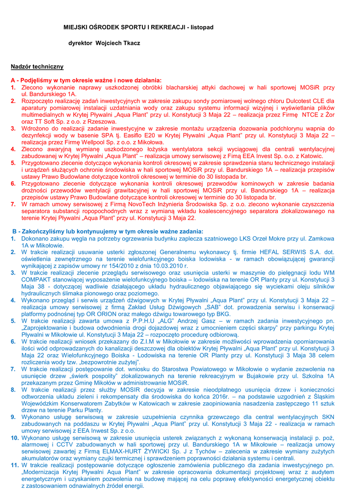 MIEJSKI OŚRODEK SPORTU I REKREACJI - listopad dyrektor Wojciech Tkacz Nadzór techniczny A - Podjęliśmy w tym okresie ważne i nowe działania: 1. Zlecono wykonanie naprawy uszkodzonej obróbki blacharskiej attyki dachowej w hali sportowej MOSiR przy ul. Bandurskiego 1A. 2. Rozpoczęto realizację zadań inwestycyjnych w zakresie zakupu sondy pomiarowej wolnego chloru Dulcotest CLE dla aparatury pomiarowej instalacji uzdatniania wody oraz zakupu systemu informacji wizyjnej i wyświetlania plików multimedialnych w Krytej Pływalni „Aqua Plant” przy ul. Konstytucji 3 Maja 22 – realizacja przez Firmę NTCE z Żor oraz TT Soft Sp. z o.o. z Rzeszowa. 3. Wdrożono do realizacji zadanie inwestycyjne w zakresie montażu urządzenia dozowania podchlorynu wapnia do dezynfekcji wody w basenie SPA tj. Easiflo E20 w Krytej Pływalni „Aqua Plant” przy ul. Konstytucji 3 Maja 22 – realizacja przez Firmę Wellpool Sp. z o.o. z Mikołowa. 4. Zlecono awaryjną wymianę uszkodzonego łożyska wentylatora sekcji wyciągowej dla centrali wentylacyjnej zabudowanej w Krytej Pływalni „Aqua Plant” – realizacja umowy serwisowej z Fimą EEA Invest Sp. o.o. z Katowic. 5. Przygotowano zlecenie dotyczące wykonania kontroli okresowej w zakresie sprawdzenia stanu technicznego instalacji i urządzeń służących ochronie środowiska w hali sportowej MOSiR przy ul. Bandurskiego 1A – realizacja przepisów ustawy Prawo Budowlane dotyczące kontroli okresowej w terminie do 30 listopada br. 6. Przygotowano zlecenie dotyczące wykonania kontroli okresowej przewodów kominowych w zakresie badania drożności przewodów wentylacji grawitacyjnej w hali sportowej MOSiR przy ul. Bandurskiego 1A – realizacja przepisów ustawy Prawo Budowlane dotyczące kontroli okresowej w terminie do 30 listopada br. 7. W ramach umowy serwisowej z Firmą NovoTech Inżynieria Środowiska Sp. z o.o. zlecono wykonanie czyszczenia separatora substancji ropopochodnych wraz z wymianą wkładu koalescencyjnego separatora zlokalizowanego na terenie Krytej Pływalni „Aqua Plant” przy ul. Konstytucji 3 Maja 22. B - Zakończyliśmy lub kontynuujemy w tym okresie ważne zadania: 1. Dokonano zakupu węgla na potrzeby ogrzewania budynku zaplecza szatniowego LKS Orzeł Mokre przy ul. Zamkowa 1A w Mikołowie. 2. W trakcie realizacji usuwanie usterki zgłoszonej Generalnemu wykonawcy tj. firmie HEFAL SERWIS S.A. dot. oświetlenia zewnętrznego na terenie wielofunkcyjnego boiska lodowiska - w ramach obowiązującej gwarancji wynikającej z zapisów umowy nr 154/2010 z dnia 10.03.2010 r. 3. W trakcie realizacji zlecenie przeglądu serwisowego oraz usunięcia usterki w maszynie do pielęgnacji lodu WM COMPAKT stanowiącej wyposażenie wielofunkcyjnego boiska – lodowiska na terenie OR Planty przy ul. Konstytucji 3 Maja 38 - dotyczącej wadliwie działającego układu hydraulicznego objawiającego się wyciekami oleju silników hydraulicznych ślimaka pionowego oraz poziomego. 4. Wykonano przegląd i serwis urządzeń dźwigowych w Krytej Pływalni „Aqua Plant” przy ul. Konstytucji 3 Maja 22 – realizacja umowy serwisowej z firmą Zakład Usług Dźwigowych „SAB” dot. prowadzenia serwisu i konserwacji platformy podnośnej typ OR ORION oraz małego dźwigu towarowego typ BKG. 5. W trakcie realizacji zawarta umowa z P.P.H.U „ALG” Andrzej Gasz – w ramach zadania inwestycyjnego pn. „Zaprojektowanie i budowa odwodnienia drogi dojazdowej wraz z umocnieniem części skarpy” przy parkingu Krytej Pływalni w Mikołowie ul. Konstytucji 3 Maja 22 – rozpoczęto procedurę odbiorową. 6. W trakcie realizacji wniosek przekazany do Z.I.M w Mikołowie w zakresie możliwości wprowadzenia opomiarowania ilości wód odprowadzanych do kanalizacji deszczowej dla obiektów Krytej Pływalni „Aqua Plant” przy ul. Konstytucji 3 Maja 22 oraz Wielofunkcyjnego Boiska - Lodowiska na terenie OR Planty przy ul. Konstytucji 3 Maja 38 celem rozliczenia wody tzw. „bezpowrotnie zużytej”. 7. W trakcie realizacji postępowanie dot. wniosku do Starostwa Powiatowego w Mikołowie o wydanie zezwolenia na usunięcie drzew „świerk pospolity” zlokalizowanych na terenie rekreacyjnym w Bujakowie przy ul. Szkolna 1A przekazanym przez Gminę Mikołów w administrowanie MOSiR. 8. W trakcie realizacji przez służby MOSIR decyzja w zakresie nieodpłatnego usunięcia drzew i konieczności odtworzenia układu zieleni i rekompensaty dla środowiska do końca 2016r. – na podstawie uzgodnień z Śląskim Wojewódzkim Konserwatorem Zabytków w Katowicach w zakresie zaopiniowania nasadzenia zastępczego 11 sztuk drzew na terenie Parku Planty. 9. Wykonano usługę serwisową w zakresie uzupełnienia czynnika grzewczego dla central wentylacyjnych SKN zabudowanych na poddaszu w Krytej Pływalni „Aqua Plant” przy ul. Konstytucji 3 Maja 22 - realizacja w ramach umowy serwisowej z EEA Inwest Sp. z o.o. 10. Wykonano usługę serwisową w zakresie usunięcia usterek związanych z wykonaną konserwacją instalacji p. poż, alarmowej i CCTV zabudowanych w hali sportowej przy ul. Bandurskiego 1A w Mikołowie – realizacja umowy serwisowej zawartej z Firmą ELMAX-HURT ŻYWICKI Sp. J z Tychów – zalecenia w zakresie wymiany zużytych akumulatorów oraz wymiany czujki termicznej i sprawdzeniem poprawności działania systemu i centrali. 11. W trakcie realizacji postępowanie dotyczące ogłoszenie zamówienia publicznego dla zadania inwestycyjnego pn. „Modernizacja Krytej Pływalni Aqua Plant” w zakresie opracowania dokumentacji projektowej wraz z audytem energetycznym i uzyskaniem pozwolenia na budowę mającej na celu poprawę efektywności energetycznej obiektu z zastosowaniem odnawialnych źródeł energii. D − inne: 1. Wprowadzanie danych w zakresie monitorowania zużycia energii elektrycznej i mediów do aplikacji KEGEMS dla obiektów będących w administrowaniu MOSiR tj. Hali Sportowej przy ul. Bandurskiego 1A, Krytej Pływalni „Aqua Plant” pr