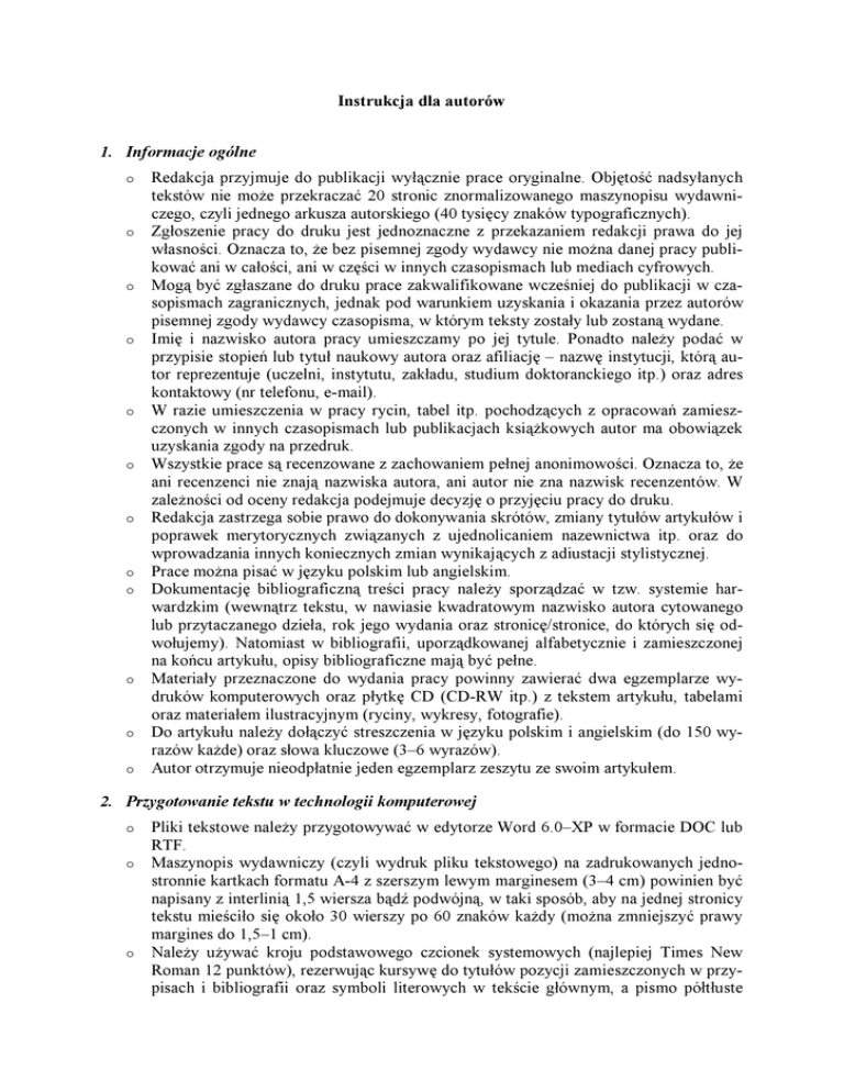 Instrukcja dla autorów 1. Informacje ogólne o Redakcja przyjmuje do