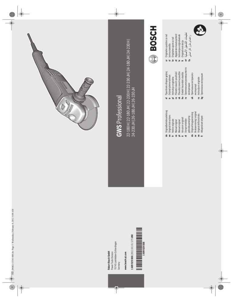 1 609 929 X88 (2012.01) O / 275 UNI www.bosch-pt.com Robert Bosch GmbH Power Tools Division 70745 Leinfelden-Echterdingen Germany OBJ_DOKU-13341-008.fm Page 1 Wednesday, February 8, 2012 8:00 AM de en fr es pt it nl Originalbetriebsanleitung Original instructions Notice originale Manual original Manual original Istruzioni originali Oorspronkelijke gebruiksaanwijzing da Original brugsanvisning sv Bruksanvisning i original no Original driftsinstruks fi Alkuperäiset ohjeet Ðñùôüôõðï ïäçãéþí ÷ñÞóçò Orijinal işletme talimatý Instrukcja oryginalna Původní návod k používání Pôvodný návod na použitie Eredeti használati utasítás Îðèãèíàëüíîå ðóêîâîäñòâî ïî ýêñïëóàòàöèè uk Îðèã³íàëüíà ³íñòðóêö³ÿ ç åêñïëóàòàö³¿ ro Instrucţiuni originale bg Îðèãèíàëíà èíñòðóêöèÿ el tr pl cs sk hu ru sr sl hr et lv lt ar fa ̶Ϡλ έΎ̯ ίήσ ̵ΎϤϨϫέ ΔϴϠλϷ ϞϴϐθΘϟ ΕΎϤϴϠόΗ Originalno uputstvo za rad Izvirna navodila Originalne upute za rad Algupärane kasutusjuhend Instrukcijas oriģinālvalodā Originali instrukcija 22-180 H | 22-180 JH | 22-230 H | 22-230 JH | 24-180 JH | 24-230 H | 24-230 JH | 26-180 JH | 26-230 JH GWS Professional OBJ_BUCH-777-008.book Page 124 Wednesday, February 8, 2012 8:04 AM 124 | Polski Aksesuarý dikkatli biçimde depolayýn ve kullanýn. Yedek bağlantý kablosu gerekli ise, güvenliğin tehlikeye düşmemesi için Bosch’tan veya yetkili bir servisten temin edilmelidir. Dikkatli biçimde yürütülen üretim ve test yöntemlerine rağmen elektrikli el aleti arýza yapacak olursa, onarým Bosch elektrikli aletleri için yetkili bir serviste yapýlmalýdýr. Bütün başvuru ve yedek parça siparişlerinizde mutlaka aletinizin tip etiketindeki 10 haneli ürün kodunu belirtiniz. Müşteri servisi ve müşteri danýşmanlýğý Müşteri servisleri ürününüzün onarým ve bakýmý ile yedek parçalarýna ait sorularýnýzý yanýtlandýrýr. Demonte görünüşler ve yedek parçalara ait bilgileri şu adreste de bulabilirsiniz: www.bosch-pt.com Bosch müşteri servisi timi satýn alacağýnýz ürünün özellikleri, bu ürünün kullanýmý ve ayar işlemleri hakkýndaki sorularýnýz ile yedek parçalarýna ait sorularýnýzý memnuniyetle yanýtlandýrýr. Türkçe Bosch San. ve Tic. A.S. Ahi Evran Cad. No:1 Kat:22 Polaris Plaza 80670 Maslak/Istanbul Bosch Uzman Ekibi +90 (0212) 367 18 88 Tasfiye Elektrikli el aleti, aksesuar ve ambalaj malzemesi çevre dostu bir yöntemle tasfiye edilmek üzere tekrar kazaným merkezine gönderilmelidir. Elektrikli el aletlerini evsel çöplerin içine atmayýn! Sadece AB üyesi ülkeler için: Elektrikli el aletleri ve eski elektronik aletlere ilişkin 2002/96/AT sayýlý Avrupa Birliği yönetmeliği ve bunlarýn tek tek ülkelerin hukuklarýna uyarlanmasý uyarýnca, kullaným ömrünü tamamlamýş elektrikli el aletleri ayrý ayrý toplanmak ve çevre dostu bir yöntemle tasfiye edilmek üzere yeniden kazaným merkezlerine gönderilmek zorundadýr. Değişiklik haklarýmýz saklýdýr. Polski Wskazówki bezpieczeństwa Ogólne przepisy bezpieczeństwa dla elektronarzędzi Należy przeczytać wszystkie wskazówki i przepisy. Błędy w przestrzeganiu poniższych wskazówek mogą spowodować porażenie prądem, pożar i/lub ciężkie obrażenia ciała. Należy starannie przechowywać wszystkie przepisy i wskazówki bezpieczeństwa dla dalszego zastosowania. 1 609 929 X88 | (8.2.12) Użyte w poniższym tekście pojęcie „elektronarzędzie“ odnosi się do elektronarzędzi zasilanych energią elektryczną z sieci (z przewodem zasilającym) i do elektronarzędzi zasilanych akumulatorami (bez przewodu zasilającego). Bezpieczeństwo miejsca pracy f Stanowisko pracy należy utrzymywać w czystości i dobrze oświetlone. Nieporządek w miejscu pracy lub nieoświetlona przestrzeń robocza mogą być przyczyną wypadków. f Nie należy pracować tym elektronarzędziem w otoczeniu zagrożonym wybuchem, w którym znajdują się np. łatwopalne ciecze, gazy lub pyły. Podczas pracy elektronarzędziem wytwarzają się iskry, które mogą spowodować zapłon. f Podczas użytkowania urządzenia zwrócić uwagę na to, aby dzieci i inne osoby postronne znajdowały się w bezpiecznej odległości. Odwrócenie uwagi może spowodować utratę kontroli nad narzędziem. Bezpieczeństwo elektryczne f Wtyczka elektronarzędzia musi pasować do gniazda. Nie wolno zmieniać wtyczki w jakikolwiek sposób. Nie wolno używać wtyków adapterowych w przypadku elektronarzędzi z uziemieniem ochronnym. Niezmienione wtyczki i pasujące gniazda zmniejszają ryzyko porażenia prądem. f Należy unikać kontaktu z uziemionymi powierzchniami jak rury, grzejniki, piece i lodówki. Ryzyko porażenia prądem jest większe, gdy ciało użytkownika jest uziemione. f Urządzenie należy zabezpieczyć przed deszczem i wilgocią. Przedostanie się wody do elektronarzędzia podwyższa ryzyko porażenia prądem. f Nigdy nie należy używać przewodu do innych czynności. Nigdy nie należy nosić elektronarzędzia, trzymając je za przewód, ani używać przewodu do zawieszenia urządzenia; nie wolno też wyciągać wtyczki z gniazdka pociągając za przewód. Przewód należy chronić przed wysokimi temperaturami, należy go trzymać z dala od oleju, ostrych krawędzi lub ruchomych części urządzenia. Uszkodzone lub splątane przewody zwiększają ryzyko porażenia prądem. f W przypadku pracy elektronarzędziem pod gołym niebem, należy używać przewodu przedłużającego, dostosowanego również do zastosowań zewnętrznych. Użycie właściwego przedłużacza (dostosowanego do pracy na zewnątrz) zmniejsza ryzyko porażenia prądem. f Jeżeli nie da się uniknąć zastosowania elektronarzędzia w wilgotnym otoczeniu, należy użyć wyłącznika ochronnego różnicowo-prądowego. Zastosowanie wyłącznika ochronnego różnicowo-pr