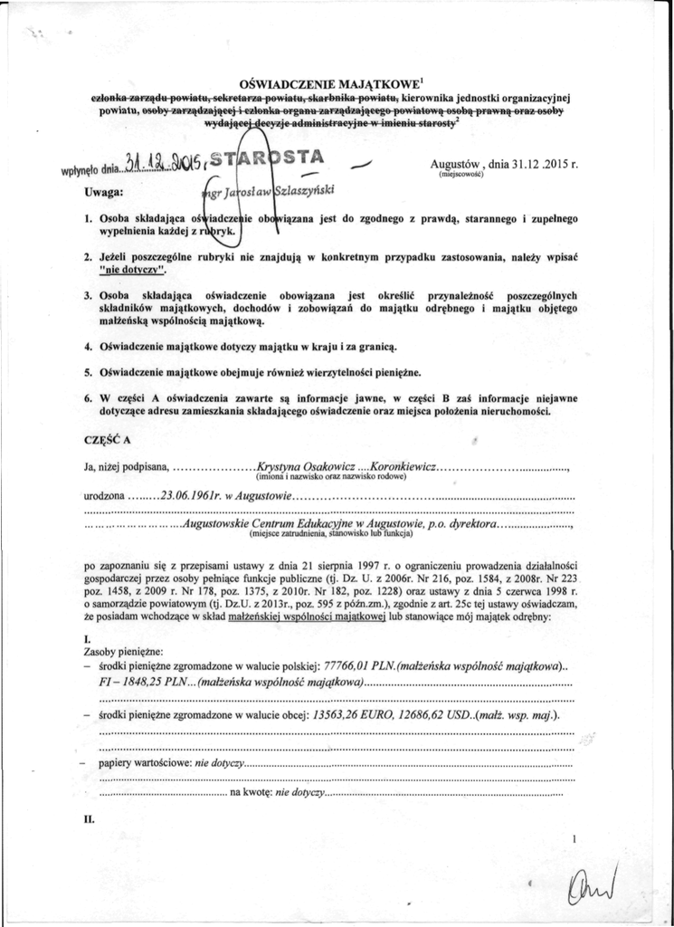 -.-. ' OŚWIADCZENIE MAJĄTKOWE 1 członka zarządu powiatu^ sekretarza powiatu, skarbnika powiatu^ kierownika jednostki organizacyjnej powiatu, osoby zarządzającej i członka organu zarządzającego powiatowa osobq prawną oraz osoby wydttjącejdecyzje administracyjne w imieniu starosty 2 (miejscowość) ^,,2,0,5, I. Osoba składająca oświadczę ie obowiązana jest do zgodnego z prawdą, starannego i zupełnego wypełnienia każdej z rubryk. ^—'nie znajdują w konkretnym przypadku zastosowania, należy wpisać 1. Jeżeli poszczególne rubryki ^nie dotyczy". 3. Osoba składająca oświadczenie obowiązana jest określić przynależność poszczególnych składników majątkowych, dochodów i zobowiązań do majątku odrębnego i majątku objętego małżeńską wspólnością majątkową. 4. Oświadczenie majątkowe dotyczy majątku w kraju i za granicą. 5. Oświadczenie majątkowe obejmuje również wierzytelności pieniężne. 6. W części A oświadczenia zawarte są informacje jawne, w części B zaś informacje niejawne dotyczące adresu zamieszkania składającego oświadczenie oraz miejsca położenia nieruchomości. CZĘŚĆ A Ja, niżej podpisana, ..................... Krystyna Osakowicz ....Koronkiewicz (imiona i nazwisko oraz nazwisko rodowe) ..................................... , urodzona ......... 23. 06. 1961 r. w Augustowie Augustowskie Centrum Edukacyjne w Augustowie, p.o. dyrektora (miejsce zatrudnienia, stanowisko lub funkcja) , po zapoznaniu się z przepisami ustawy z dnia 21 sierpnia 1997 r. o ograniczeniu prowadzenia działalności gospodarczej przez osoby pełniące funkcje publiczne (tj. Dz. U. z 2006r, Nr 216, póz. 1584, z 2008r. Nr 223 póz. 1458, z 2009 r. Nr 178, póz. 1375, z 2010r. Nr 182, póz. 1228) oraz ustawy z dnia 5 czerwca 1998 r. o samorządzie powiatowym (tj. Dz.U. z2013r., póz. 595 zpóźn.zm.), zgodnie żart, 25c tej ustawy oświadczam, że posiadam wchodzące w skład małżeńskiej wspólnoścunajatkowej lub stanowiące mój majątek odrębny: I. Zasoby pieniężne: - środki pieniężne zgromadzone w walucie polskiej: 77766,01 PLN.(małżeńska wspólność majątkowa).. FI- 1848,25 PLN...(malżeńska wspólność majątkowa) - - środki pieniężne zgromadzone w walucie obcej: 13563,26 EURO, 12686,62 USD..(małż. wsp. maj.). papiery wartościowe: nie dotyczy na kwotę: nie dotyczy. 11. l /. Dom o powierzchni: budynek mieszkalno-usługowy o paw. 240 m2, o wartości: 720000 zł tytuł prawny: własność (małżeńska wspóMasność majątkowa) 2. Mieszkanie o powierzchni: 64,65 m!, o wartości: 220000 z! tytuł prawny: własność (małżeńska wspótwlasnośó majątkowa) 3. Gospodarstwo rolne: nie dotyczy rodzaj gospodarstwa: nie dotyczy , powierzchnia: nie dotyczy. o wartości: nie dotyczy rodzaj zabudowy nie dotyczy tytuł prawny: nie dotyczy Z tego tytułu osiągnęłam w roku ubiegłym przychód i dochód w wysokości: nie dotyczy 4. Inne nieruchomości: powierzchnia: 1) 684 m2.grunt pod dom z póz. I - wartość 100000 zl, 2) budynek garażowo-gospodarczy o pow. 120 m2 - wartość 60000 zl, 3) niezabudowana nieruchomość o powierzchni 415 Im2-wartość 150000 zl, . o wartości:/M' tytuł prawny: własność ( malżeńska wspólwłasność majątkowa) III. Posiadam udziały w spółkach handlowych - należy podać liczbę i emitenta udziałów: nie dotyczy.. udziały te stanowią pakiet większy niż 10% udziałów w spółce: nie dotyczy Z tego tytułu osiągnęłam) w roku ubiegłym dochód w wysokości: nie dotyczy. IV. Posiadam akcje w spółkach handlowych - należy podać liczbę i emitenta akcji: nie dotyczy.. akcje te stanowią pakiet większy niż 10% akcji w spółce: nie dotyczy Z tego tytułu osiągnęłam) w roku ubiegłym dochód w wysokości: nie dotyczy. V. Nabyłam (nabył mój małżonek, z wyłączeniem mienia przynależnego do jego majątku odrębnego) od Skarbu Państwa, innej państwowej osoby prawnej, jednostek samorządu terytorialnego, ich związków lub od komunalnej osoby prawnej następujące mienie, które podlegało zbyciu w drodze przetargu - należy podać opis mienia i datę nabycia, od kogo: nie dotyczy VI. l . Prowadzę działalność gospodarczą* (należy podać formę prawną i przedmiot działalności): nie dotyczy - osobiście ni e dotyczy wspólnie z innymi osobami nie dotyczy Z tego tytułu osiągnęłam w roku ubiegłym przychód i dochód w wysokości: nie dotyczy 2. Zarządzani działalnością gospodarczą lub jestem przedstawicielem, pełnomocnikiem takiej działalności (należy podać formę prawną i przedmiot działalności): nie dotyczy osobiście nie dotyczy wspólnie z innymi osobami nie dotyczy Z tego tytułu osiągnąłem(łam) w roku ubiegłym dochód w wysokości: nie dotyczy VII. l. W spółkach handlowych (nazwa, siedziba spółki): nie dotyczy. jestem członkiem zarządu (od kiedy): nie dotyczy jestem członkiem rady nadzorczej (od kiedy): nie dotyczy jestem członkiem komisji rewizyjnej (od kiedy): Z tego tytułu osiągnąłem(łam) w roku ubiegłym dochód w wysokości: nie dotyczy. 2. W spółdzielniach: nie dotyczy jestem członkiem zarządu (od kiedy): nie dotyczy jestem członkiem rady nadzorczej" (od kiedy): nie dotyczy jestem członkiem komisji rewizyjnej (od kiedy): nie dotyczy Z tego tytułu osiągnęłam) w roku ubiegłym dochód w wysokości: nie dotyczy. 3. W fundacjach prowadzących działalność gospodarczą: nie dotyczy jestem członkiem zarządu (od kiedy): nie dotyczy jestem członkiem rady nadzorczej (od kiedy): nie dotyczy jestem członkiem komisji rewizyjnej (od kiedy): nie dotyczy Z tego tytułu osiągnetam) w roku ubiegłym dochód w wysokości: nie dotyczy. VIII. Inne dochody osiągane z tytułu zatrudnienia lub innej działalności zarobkowej lub zajęć, z podaniem kwot uzyskiwanych z każdego tytułu: umowa o pracę- 92211,11 zl, umowa zlecenie 24205,00 zl. - IX. Składniki mienia ruchomego o wartości powyżej 10.000 złotych (w przypadku 