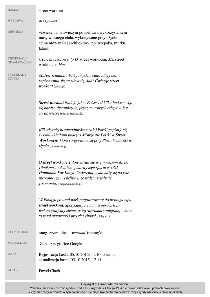 HASŁO street workout WYMOWA strit ṶorkaṶt DEFINICJA «ćwiczenia na świeżym powietrzu z wykorzystaniem masy własnego ciała, wykonywane przy użyciu elementów małej architektury, np. trzepaka, murku, latarni» INFORMACJA GRAMATYCZNA rzecz. m rzeczowy, lp D. street workoutu, Ms. street workoucie, blm PRZYKŁADY UŻYCIA Możesz schudnąć 10 kg i zyskać ciało atlety bez zapisywania się na siłownię. Jak? Ćwicząc street workout (tvn24.pl). Street workout istnieje już w Polsce od kilku lat i rozwija się bardzo dynamicznie, przez co nowych adeptów jest coraz więcej (uliczny-trening.pl). Kilkudziesięciu zawodników z całej Polski popisuje się swoimi układami podczas Mistrzostw Polski w Street Workoucie, które rozgrywane są przy Placu Wolności w Opolu (radio.opole.pl). O street workoucie dowiedział się w gimnazjum dzięki filmikom z udziałem gwiazdy tego sportu w USA, Hannibala For Kinga. Ćwiczenia wydawały się na tyle nierealne, że myśleliśmy, że widzimy jedynie fotomontaż (magazyn.nowiny.pl). W Elblągu powstał park przystosowany do treningu typu street workout. Spotykamy się tam, a oprócz tego wykorzystujemy elementy infrastruktury miejskiej – bo o to w tej aktywności przecież chodzi (elblag.net). ETYMOLOGIA WIZUALIZACJE <ang. street ‘ulica’ i workout ‘trening’> Zobacz w grafice Google DATA Rejestracja hasła: 05.10.2015, 11.10, ostatnia aktualizacja hasła: 05.10.2015, 12.11 AUTOR Paweł Ciach Copyright © Uniwersytet Warszawski Wszelkie prawa zastrzeżone zgodnie z art.17 ustawy z dnia 4 lutego 1994 r. o prawie autorskim i prawach pokrewnych. Teksty oraz zdjęcia zawarte w tym dokumencie nie mogą być publikowane bez wiedzy i zgody właściciela praw autorskich. REDAKTOR Maciej Czeszewski Copyright © Uniwersytet Warszawski Wszelkie prawa zastrzeżone zgodnie z art.17 ustawy z dnia 4 lutego 1994 r. o prawie autorskim i prawach pokrewnych. Teksty oraz zdjęcia zawarte w tym dokumencie nie mogą być publikowane bez wiedzy i zgody właściciela praw autorskich. Powered by TCPDF (www.tcpdf.org)