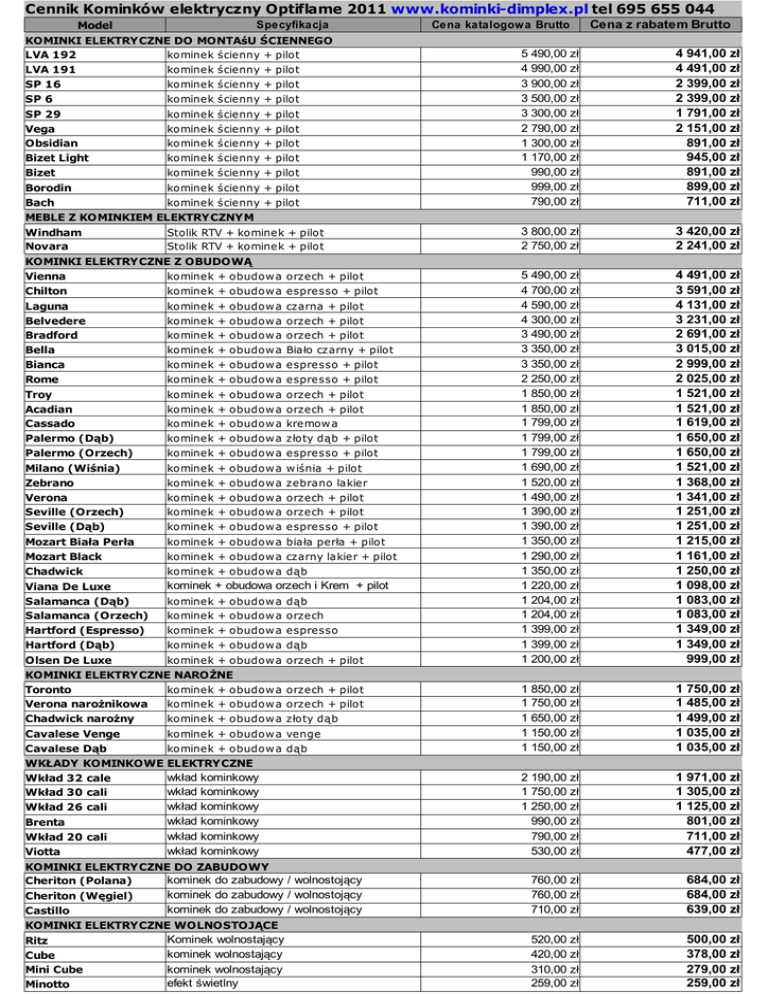Cennik Kominków elektryczny Optiflame 2011 www - Opti-Myst