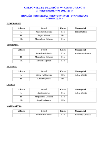 OSIĄGNIĘCIA UCZNIÓW W KONKURSACH W ROKU SZKOLNYM 2013/2014 FINALIŚCI KONKURSÓW KURATORYJNYCH - ETAP SZKOLNY - GIMNAZJUM JĘZYK POLSKI Lokata Uczeń Klasa Nauczyciel I. Radosław Labuda III a Lidia Stahlke II. Edyta Wenta II a III. Magdalena Cichosz III a Lokata Uczeń Klasa I. Radosław Labuda III a II. Magdalena Cichosz III a III. Karolina Cyman III a Lokata Uczeń Klasa Nauczyciel I. Alicja Kotłowska III b Adela Wenta II. Kamila Sychta II a Lokata Uczeń Klasa Nauczyciel I. Agnieszka Lis III a Adela Wenta II. Magdalena Cichosz III a III. Angelika Wenta III b Lokata Uczeń Klasa I. Radosław Labuda III a GEOGRAFIA Nauczyciel Barbara Salamon BIOLOGIA CHEMIA MATEMATYKA Nauczyciel Roksana Syldatk OSIĄGNIĘCIA UCZNIÓW W KONKURSACH w roku szkolnym 2013/2014 - GIMNAZJUM – *Legenda etap szkolny – S etap gminny – G etap powiatowy – P etap rejonowy – R etap wojewódzki – W etap ogólnopolski - O NAZWA KONKURSU Konkurs plastyczny na plakat promujący zdrowy styl życia w powiązaniu z promocją krwiodawstwa. Wojewódzki Konkurs Prozy i Poezji Jana Pawła II Konkurs Poezji J. Tuwima Konkurs regionalny Ślady historii najnowszej w mojej miejscowości IV Wojewódzki Konkurs Historyczny im. Lecha Bądkowskiego – Historia regionalna – Sierpień 80 Szkolny Konkurs Historyczny Religia na przestrzeni dziejów „Miejsce pamięci narodowej w mojej gminie” UCZEŃ Katarzyna Cirocka – II b Agata Ruszkowska – II b Edyta Wenta – II a LOKATA II III wyróżnienie ETAP* P NAUCZYCIEL Adela Wenta Bartosz Sadowski – III b I W Ewa Grucza Przemysław Bulczak – III b Agnieszka Lis – III a Natalia Górniak – I a Weronika Labuda – I a Kamila Lublewska – I a Natalia Wolska – I a Aleksandra Cyman – I a Natalia Górniak – I a Agata Wolska – I a Dominika Sildatk – I b Marta Wenta - I b Kamila Sychta – II a Marita Miotk – II a Sylwia Cichosz – II a Patrycja Woźniak – II a Natalia Wolska – I a Katarzyna Cirocka – II b Julia Kobiela – II a I/II II III S/P Ewa Grucza Lidia Stahlke Anna Fuczka Udział W Joanna Neubauer I II III S Joanna Neubauer I II III S Joanna Neubauer Radosław Labuda – III a Natalia Wolska – I a Agnieszka Lis – III a Magdalena Cichosz – III a Urszula Labuda – I a Natalia Pobłocka – III b Udział Aleksandra Stark Udział W Konkurs p/poż - OTWP Konkurs matematyczny (kuratoryjny) Konkurs Wiedzy o Kaszubach i Pomorzu Konkurs Prozy i Poezji polskiej Konkurs j. angielskiego ENGLISH ACE Konkurs j. niemieckiego Konkurs wiedzy o Unii Europejskiej Konkurs ekologiczny Ekosystem lasu Konkurs piosenki angielskiej Crazy 80’s Turniej Wiedzy Przyrodniczej Konkurs muzyczny Śpiewam, bo umiem Kamila Sychta – II a Angelika Wenta – III b Katarzyna Cirocka – II b Adrianna Olejnik – I a Dariusz Stefanowski – I a I II/III III S S/G S Franciszek Wróbel Radosław Labuda – III a I/finalista S/R/W Roksana Syldatk Anna Gawin – III b Magdalena Cichosz – III a Sylwia Cichosz – II a Agnieszka Lis– III a Bartosz Sadowski – III b Kamila Sychta – II a Natalia Górniak – I a Klasy I: Maksymilian Potrykus-Ia Natalia Wolska – I a Aleksandra Olejnik – I a Klasy II: Julia Kobiela – II a Aleksandra Korda – II b Katarzyna Cirocka – II b Radosław Labuda – III a Katarzyna Cirocka – II b Magdalena Cichosz – III a Julia Kobiela – II a Monika Mondzińska – IIIa Angelika Wenta – III b Magdalena Cichosz – III a Adriana Olejnik – I a Aleksandra Cyman – I a Kamila Lublewska – I a Julia Labuda – II a Radosław Labuda – III a Anna Gawin – III b Radosław Labuda – III a Karolina Cyman – III a Natalia Pobłocka – III b Kamila Sychta – II a I III V I/II/udział II/wyróż III III W Aleksandra Stark S/G/W S/G S S SwO Lidia Stahlke Ewa Grucza Lidia Stahlke Anna Fuczka Martyna Mejer S Alicja Kuchta S Barbara Salamon Joanna Neubauer S Adela Wenta międzyszkolny Martyna Mejer P Roksana Syldatk Adela Wenta Barbara Salamon Maria Kostuch I II III I II III I II III III I II III I II III udział III III/I/udział S/P/W