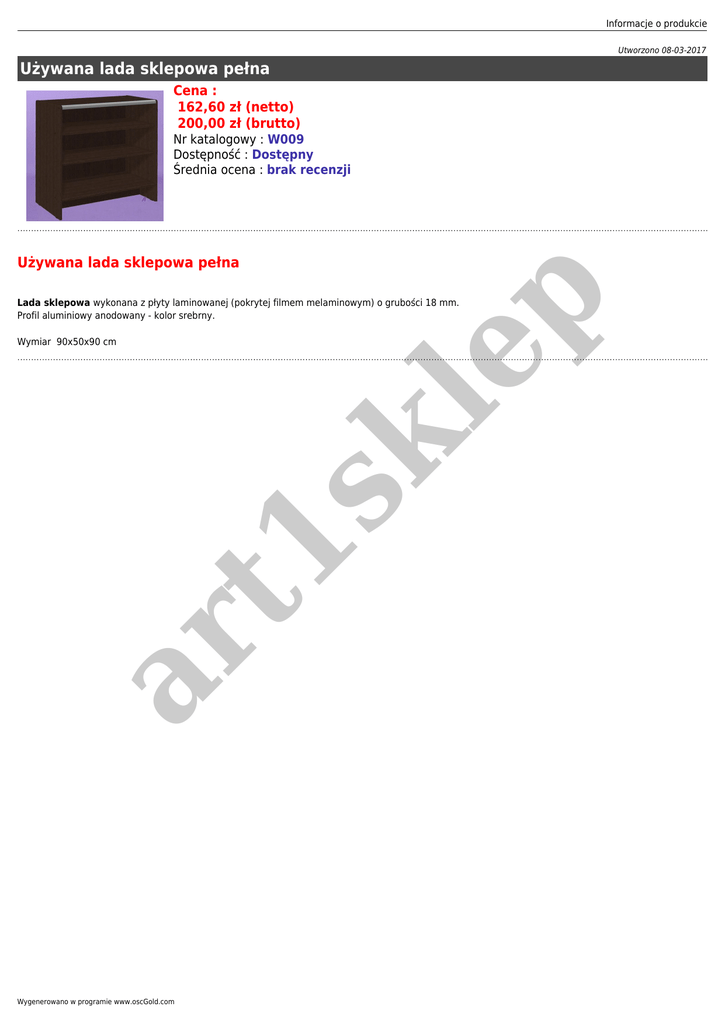 Informacje o produkcie Utworzono 08-03-2017 Używana lada sklepowa pełna Cena : 162,60 zł (netto) 200,00 zł (brutto) Nr katalogowy : W009 Dostępność : Dostępny Średnia ocena : brak recenzji le p Używana lada sklepowa pełna Lada sklepowa wykonana z płyty laminowanej (pokrytej filmem melaminowym) o grubości 18 mm. Profil aluminiowy anodowany - kolor srebrny. ar t1 sk Wymiar 90x50x90 cm Wygenerowano w programie www.oscGold.com