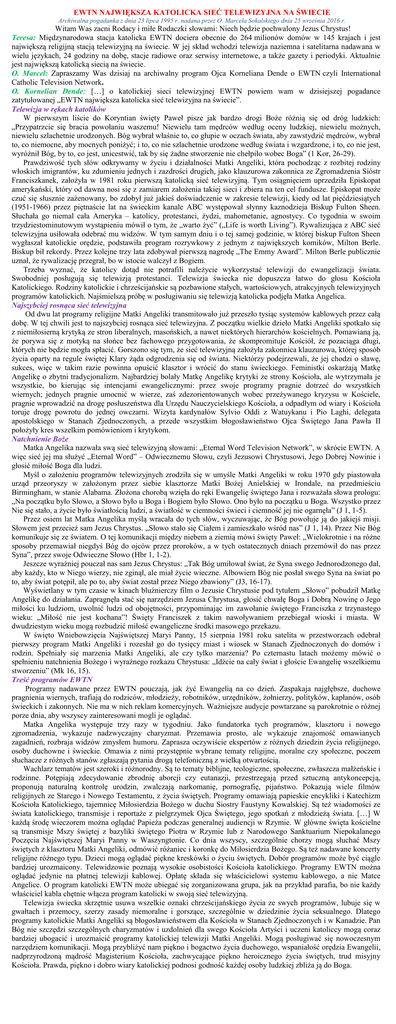 EWTN NAJWIĘKSZA KATOLICKA SIEĆ TELEWIZYJNA NA ŚWIECIE Archiwalna pogadanka z dnia 23 lipca 1995 r. nadana przez O. Marcela Sokalskiego dnia 25 września 2016 r. Witam Was zacni Rodacy i miłe Rodaczki słowami: Niech będzie pochwalony Jezus Chrystus! Teresa: Międzynarodowa stacja katolicka EWTN dociera obecnie do 264 milionów domów w 145 krajach i jest największą religijną stacją telewizyjną na świecie. W jej skład wchodzi telewizja naziemna i satelitarna nadawana w wielu językach, 24 godziny na dobę, stacje radiowe oraz serwisy internetowe, a także gazety i periodyki. Aktualnie jest największą katolicką siecią na świecie. O. Marcel: Zapraszamy Was dzisiaj na archiwalny program Ojca Korneliana Dende o EWTN czyli International Catholic Television Network. O. Kornelian Dende: […] o katolickiej sieci telewizyjnej EWTN powiem wam w dzisiejszej pogadance zatytułowanej „EWTN największa katolicka sieć telewizyjna na świecie”. Telewizja w rękach katolików W pierwszym liście do Koryntian święty Paweł pisze jak bardzo drogi Boże różnią się od dróg ludzkich: „Przypatrzcie się bracia powołaniu waszemu! Niewielu tam mędrców według oceny ludzkiej, niewielu możnych, niewielu szlachetnie urodzonych. Bóg wybrał właśnie to, co głupie w oczach świata, aby zawstydzić mędrców, wybrał to, co niemocne, aby mocnych poniżyć; i to, co nie szlachetnie urodzone według świata i wzgardzone, i to, co nie jest, wyróżnił Bóg, by to, co jest, unicestwić, tak by się żadne stworzenie nie chełpiło wobec Boga” (1 Kor, 26-29). Prawdziwość tych słów odkrywamy w życiu i działalności Matki Angeliki, która pochodząc z rozbitej rodziny włoskich imigrantów, ku zdumieniu jednych i zazdrości drugich, jako klauzurowa zakonnica ze Zgromadzenia Sióstr Franciszkanek, założyła w 1981 roku pierwszą katolicką sieć telewizyjną. Tym osiągnięciem uprzedziła Episkopat amerykański, który od dawna nosi się z zamiarem założenia takiej sieci i zbiera na ten cel fundusze. Episkopat może czuć się słusznie zażenowany, bo zdobył już jakieś doświadczenie w zakresie telewizji, kiedy od lat pięćdziesiątych (1951-1966) przez piętnaście lat na świeckim kanale ABC występował słynny kaznodzieja Biskup Fulton Sheen. Słuchała go niemal cała Ameryka – katolicy, protestanci, żydzi, mahometanie, agnostycy. Co tygodnia w swoim trzydziestominutowym wystąpieniu mówił o tym, że „warto żyć” („Life is worth Living”). Rywalizująca z ABC sieć telewizyjna usiłowała odebrać mu widzów. W tym samym dniu i o tej samej godzinie, w której biskup Fulton Sheen wygłaszał katolickie orędzie, podstawiła program rozrywkowy z jednym z największych komików, Milton Berle. Biskup bił rekordy. Przez kolejne trzy lata zdobywał pierwszą nagrodę „The Emmy Award”. Milton Berle publicznie uznał, że rywalizację przegrał, bo w istocie walczył z Bogiem. Trzeba wyznać, że katolicy dotąd nie potrafili należycie wykorzystać telewizji do ewangelizacji świata. Swobodniej posługują się telewizją protestanci. Telewizja świecka nie dopuszcza łatwo do głosu Kościoła Katolickiego. Rodziny katolickie i chrześcijańskie są pozbawione stałych, wartościowych, atrakcyjnych telewizyjnych programów katolickich. Najśmielszą próbę w posługiwaniu się telewizją katolicka podjęła Matka Angelica. Najszybciej rosnąca sieć telewizyjna Od dwu lat programy religijne Matki Angeliki transmitowało już przeszło tysiąc systemów kablowych przez całą dobę. W tej chwili jest to najszybciej rosnąca sieć telewizyjna. Z początku wielkie dzieło Matki Angeliki spotkało się z niemiłosierną krytyką ze stron liberalnych, masońskich, a nawet niektórych hierarchów kościelnych. Pomawianą ją, że porywa się z motyką na słońce bez fachowego przygotowania, że skompromituje Kościół, że pozaciąga długi, których nie będzie mogła spłacić. Gorszono się tym, że sieć telewizyjną założyła zakonnica klauzurowa, której sposób życia oparty na regule świętej Klary żąda odgrodzenia się od świata. Niektórzy podejrzewali, że jej chodzi o sławę, sukces, więc w takim razie powinna opuścić klasztor i wrócić do stanu świeckiego. Feministki oskarżają Matkę Angelikę o zbytni tradycjonalizm. Najbardziej bolały Matkę Angelikę krytyki ze strony Kościoła, ale wytrzymała je wszystkie, bo kierując się intencjami ewangelicznymi: przez swoje programy pragnie dotrzeć do wszystkich wiernych; jednych pragnie umocnić w wierze, zaś zdezorientowanych wobec przeżywanego kryzysu w Kościele, pragnie wprowadzić na drogę posłuszeństwa dla Urzędu Nauczycielskiego Kościoła, a odpadłym od wiary i Kościoła toruje drogę powrotu do jednej owczarni. Wizyta kardynałów Sylvio Oddi z Watuykanu i Pio Laghi, delegata apostolskiego w Stanach Zjednoczonych, a przede wszystkim błogosławieństwo Ojca Świętego Jana Pawła II położyły kres wszelkim pomówieniom i krytykom. Natchnienie Boże Matka Angelika nazwała swą sieć telewizyjną słowami: „Eternal Word Television Network”, w skrócie EWTN. A więc sieć jej ma służyć „Eternal Word” – Odwiecznemu Słowu, czyli Jezusowi Chrystusowi, Jego Dobrej Nowinie i głosić miłość Boga dla ludzi. Myśl o założeniu programów telewizyjnych zrodziła się w umyśle Matki Angeliki w roku 1970 gdy piastowała urząd przeoryszy w założonym przez siebie klasztorze Matki Bożej Anielskiej w Irondale, na przedmieściu Birmingham, w stanie Alabama. Złożona chorobą wzięła do ręki Ewangelię świętego Jana i rozważała słowa prologu: „Na początku było Słowo, a Słowo było u Boga i Bogiem było Słowo. Ono było na początku u Boga. Wszystko przez Nie się stało, a życie było światłością ludzi, a światłość w ciemności świeci i ciemność jej nie ogarnęła” (J 1, 1-5). Przez osiem lat Matka Angelika myślą wracała do tyc