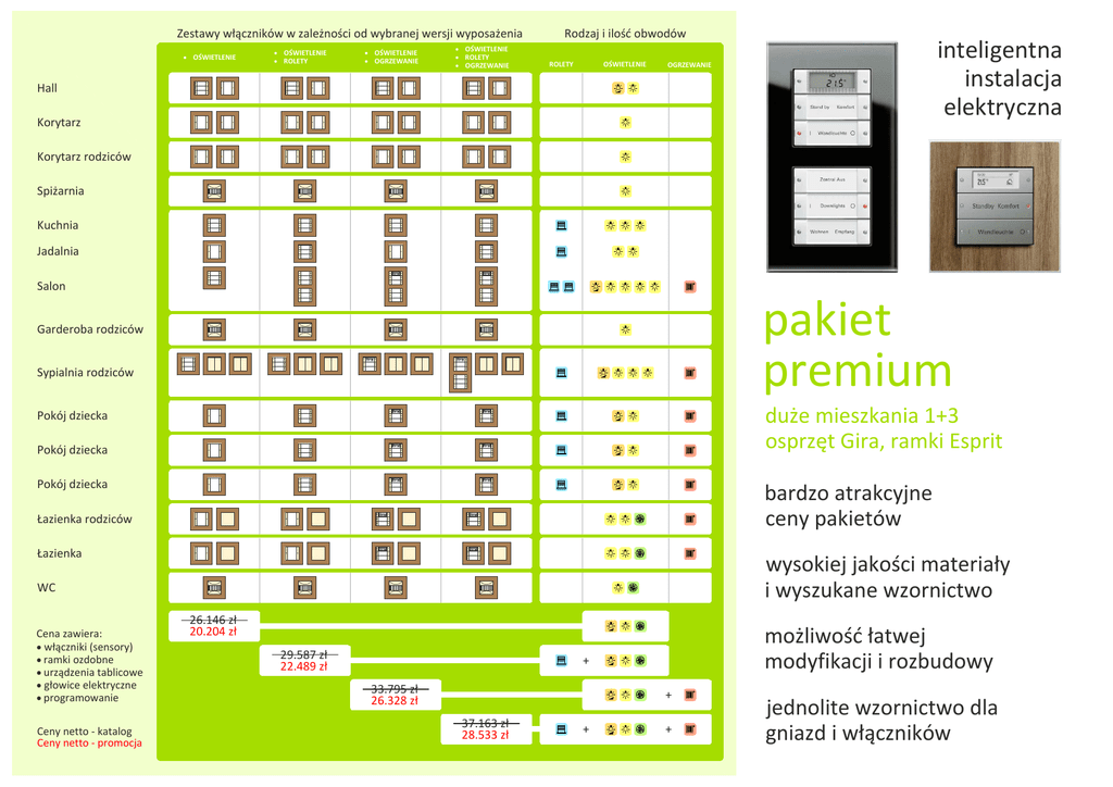 ROLETY OGRZEWANIE ROLETY OGRZEWANIE ROLETY inteligentna instalacja elektryczna OGRZEWANIE Hall Korytarz Kuchnia Jadalnia Salon pakiet premium bardzo atrakcyjne i wyszukane wzornictwo WC Cena zawiera: ramki ozdobne + programowanie Ceny netto - katalog Ceny netto - promocja modyfikacji i rozbudowy + + + jednolite wzornictwo dla FUNKCJE OPCJONALNE * dostosowanie do aktualnych potrzeb. Sterowanie grupowe jest realizowane na zasadzie scen jednym przycisku. scena lampy odpowiedni poziom W pomieszczeniach, w przebywa proponujemy czujniki ruchu, aw smartphonie. miejsca sporadycznie Funkcja centralna pozwala jednym przyciskiem podczas wychodzenia z domu. WENTYLACJA Wentylatory wentylacji wizualizacja stanu instalacji i sterowanie centralne automatycznie wraz sterowane ogrzewania podczas otwarcia okna itp z ROLETY otwarte okno. ustawianie stanu instalacji po powrocie zasilania lub grupowo oraz centralnie jednym przyciskiem podczas sterowanie bezprzewodowe OGRZEWANIE Temperatura regulowana jest indywidualnie, w oparciu o regulatory temperatury z wbudowanym czujnikiem, umieszczone w pomieszczeniach oraz przy pomocy elektrycznych montowanych na kaloryferach lub na rozdzielaczach ogrzewania INTELIGENTNA INSTALACJA ELEKTRYCZNA Instalacja, proponujemy to programowalny system automatyki budynkowej wykorzystywany do sterowania, System w dowolnym momencie rozszerzony o kolejne na zjawiska, zdarzenia czy sytuacje. Funkcje i Instalacja jest poprzez przyciski (sensory) systemu inteligentnego tradycyjne proponowanego jest swobodnego programowania funkcji w zakresie sterownia roletami, W razu dany od instalacji tradycyjnej klient nie musi od przyciskiem i w jaki Musi jedynie miejsca, REALIZACJA Prosimy o kontakt w celu przekazania wytycznych sposobu wykonania instalacji oraz miejsca potrzebnego w tablicy elektrycznej na wykonawcze inteligentnej instalacji elektrycznej. W tablicy elektrycznej zamontowane KONTAKT masz pytania, - skontaktuj z nami! i wybierzemy optymalne ! ZALETY SYSTEMU THS System Show Room: W pomieszczeniach o znaczeniu (gospodarczych, garderobach, korytarzach itp.) sterowanie ogrzewaniem realizowane jest w oparciu o tradycyjne inteligentne 62-052 Komorniki Czynne od Pn do Pt w godzinach 8:00 - 16:00 W pomieszczeniu, w jest regulator i tryb pracy. Przy wychodzeniu z domu, po jednego przycisku, ogrzewanie przechodzi w tryb temperatury zredukowanej, a po powrocie w tryb temperatury komfortowej. energii bardzo szeroka oferta zgodnych wzorniczo gniazd wtykowych - zasilajacych, komputerowych, audio, tel. +48 61 893 18 71 kom. +48 72 21 65 799 www: www.thssystem.pl e-mail: [email protected]