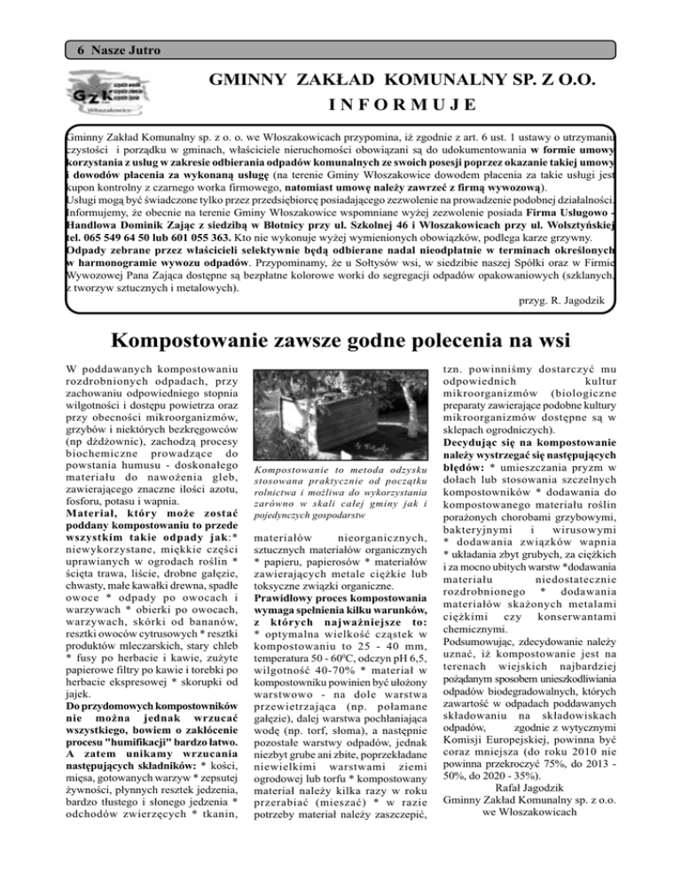 6 6 Nasze Nasze Jutro Jutro GMINNY ZAK£AD KOMUNALNY SP. Z O.O. INFORMUJE Gminny Zak³ad Komunalny sp. z o. o. we W³oszakowicach przypomina, i¿ zgodnie z art. 6 ust. 1 ustawy o utrzymaniu czystoci i porz¹dku w gminach, w³aciciele nieruchomoci obowi¹zani s¹ do udokumentowania w formie umowy korzystania z us³ug w zakresie odbierania odpadów komunalnych ze swoich posesji poprzez okazanie takiej umowy i dowodów p³acenia za wykonan¹ us³ugê (na terenie Gminy W³oszakowice dowodem p³acenia za takie us³ugi jest kupon kontrolny z czarnego worka firmowego, natomiast umowê nale¿y zawrzeæ z firm¹ wywozow¹). Us³ugi mog¹ byæ wiadczone tylko przez przedsiêbiorcê posiadaj¹cego zezwolenie na prowadzenie podobnej dzia³alnoci. Informujemy, ¿e obecnie na terenie Gminy W³oszakowice wspomniane wy¿ej zezwolenie posiada Firma Us³ugowo Handlowa Dominik Zaj¹c z siedzib¹ w B³otnicy przy ul. Szkolnej 46 i W³oszakowicach przy ul. Wolsztyñskiej tel. 065 549 64 50 lub 601 055 363. Kto nie wykonuje wy¿ej wymienionych obowi¹zków, podlega karze grzywny. Odpady zebrane przez w³acicieli selektywnie bêd¹ odbierane nadal nieodp³atnie w terminach okrelonych w harmonogramie wywozu odpadów. Przypominamy, ¿e u So³tysów wsi, w siedzibie naszej Spó³ki oraz w Firmie Wywozowej Pana Zaj¹ca dostêpne s¹ bezp³atne kolorowe worki do segregacji odpadów opakowaniowych (szklanych, z tworzyw sztucznych i metalowych). przyg. R. Jagodzik Kompostowanie zawsze godne polecenia na wsi W poddawanych kompostowaniu rozdrobnionych odpadach, przy zachowaniu odpowiedniego stopnia wilgotnoci i dostêpu powietrza oraz przy obecnoci mikroorganizmów, grzybów i niektórych bezkrêgowców (np d¿d¿ownic), zachodz¹ procesy biochemiczne prowadz¹ce do powstania humusu - doskona³ego materia³u do nawo¿enia gleb, zawieraj¹cego znaczne iloci azotu, fosforu, potasu i wapnia. Materia³, który mo¿e zostaæ poddany kompostowaniu to przede wszystkim takie odpady jak:* niewykorzystane, miêkkie czêci uprawianych w ogrodach rolin * ciêta trawa, licie, drobne ga³êzie, chwasty, ma³e kawa³ki drewna, spad³e owoce * odpady po owocach i warzywach * obierki po owocach, warzywach, skórki od bananów, resztki owoców cytrusowych * resztki produktów mleczarskich, stary chleb * fusy po herbacie i kawie, zu¿yte papierowe filtry po kawie i torebki po herbacie ekspresowej * skorupki od jajek. Do przydomowych kompostowników nie mo¿na jednak wrzucaæ wszystkiego, bowiem o zak³ócenie procesu "humifikacji" bardzo ³atwo. A zatem unikamy wrzucania nastêpuj¹cych sk³adników: * koci, miêsa, gotowanych warzyw * zepsutej ¿ywnoci, p³ynnych resztek jedzenia, bardzo t³ustego i s³onego jedzenia * odchodów zwierzêcych * tkanin, Kompostowanie to metoda odzysku stosowana praktycznie od pocz¹tku rolnictwa i mo¿liwa do wykorzystania zarówno w skali ca³ej gminy jak i pojedynczych gospodarstw materia³ów nieorganicznych, sztucznych materia³ów organicznych * papieru, papierosów * materia³ów zawieraj¹cych metale ciê¿kie lub toksyczne zwi¹zki organiczne. Prawid³owy proces kompostowania wymaga spe³nienia kilku warunków, z których najwa¿niejsze to: * optymalna wielkoæ cz¹stek w kompostowaniu to 25 - 40 mm, temperatura 50 - 600C, odczyn pH 6,5, wilgotnoæ 40-70% * materia³ w kompostowniku powinien byæ u³o¿ony warstwowo - na dole warstwa przewietrzaj¹ca (np. po³amane ga³êzie), dalej warstwa poch³aniaj¹ca wodê (np. torf, s³oma), a nastêpnie pozosta³e warstwy odpadów, jednak niezbyt grube ani zbite, poprzek³adane niewielkimi warstwami ziemi ogrodowej lub torfu * kompostowany materia³ nale¿y kilka razy w roku przerabiaæ (mieszaæ) * w razie potrzeby materia³ nale¿y zaszczepiæ, tzn. powinnimy dostarczyæ mu odpowiednich kultur mikroorganizmów (biologiczne preparaty zawieraj¹ce podobne kultury mikroorganizmów dostêpne s¹ w sklepach ogrodniczych). Decyduj¹c siê na kompostowanie nale¿y wystrzegaæ siê nastêpuj¹cych b³êdów: * umieszczania pryzm w do³ach lub stosowania szczelnych kompostowników * dodawania do kompostowanego materia³u rolin pora¿onych chorobami grzybowymi, bakteryjnymi i wirusowymi * dodawania zwi¹zków wapnia * uk³adania zbyt grubych, za ciê¿kich i za mocno ubitych warstw *dodawania materia³u niedostatecznie rozdrobnionego * dodawania materia³ów ska¿onych metalami ciê¿kimi czy konserwantami chemicznymi. Podsumowuj¹c, zdecydowanie nale¿y uznaæ, i¿ kompostowanie jest na terenach wiejskich najbardziej po¿¹danym sposobem unieszkodliwiania odpadów biodegradowalnych, których zawartoæ w odpadach poddawanych sk³adowaniu na sk³adowiskach odpadów, zgodnie z wytycznymi Komisji Europejskiej, powinna byæ coraz mniejsza (do roku 2010 nie powinna przekroczyæ 75%, do 2013 50%, do 2020 - 35%). Rafa³ Jagodzik Gminny Zak³ad Komunalny sp. z o.o. we W³oszakowicach