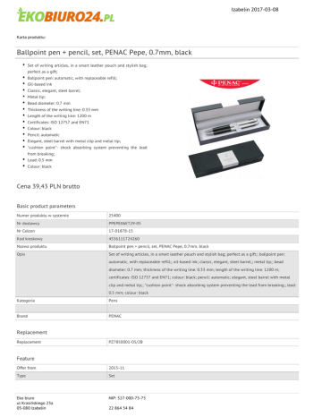 Izabelin 2017-03-08 Karta produktu: Ballpoint pen + pencil, set, PENAC Pepe, 0.7mm, black Set of writing articles, in a smart leather pouch and stylish bag; perfect as a gift; Ballpoint pen: automatic, with replaceable refill; Oil-based ink Classic, elegant, steel barrel; Metal tip; Bead diameter: 0.7 mm Thickness of the writing line: 0.33 mm Length of the writing line: 1200 m Certificates: ISO 12757 and EN71 Colour: black Pencil: automatic Elegant, steel barrel with metal clip and metal tip; "cushion point"- shock absorbing system preventing the lead from breaking; Lead: 0.5 mm Colour: black Cena 39,43 PLN brutto Basic product parameters Numer produktu w systemie 25400 Nr dostawcy PPEPE06ET29-05 Nr Celcen 17-01878-15 Kod kreskowy 4536111724260 Nazwa produktu Ballpoint pen + pencil, set, PENAC Pepe, 0.7mm, black Opis Set of writing articles, in a smart leather pouch and stylish bag; perfect as a gift;; ballpoint pen: automatic, with replaceable refill;; oil-based ink; classic, elegant, steel barrel;; metal tip;; bead diameter: 0.7 mm; thickness of the writing line: 0.33 mm; length of the writing line: 1200 m; certificates: ISO 12757 and EN71; colour: black; pencil: automatic; elegant, steel barrel with metal clip and metal tip;; "cushion point"- shock absorbing system preventing the lead from breaking;; lead: 0.5 mm; colour: black Kategoria Pens Brand PENAC Replacement Replacement PZ7850001-05/2B Feature Offer from 2015-11 Type Set Eko biuro ul Krasińskiego 23a 05-080 Izabelin NIP: 527-000-75-75 22 864 54 84 Izabelin 2017-03-08 Karta katalogowa produktu cd. Ballpoint pen + pencil, set, PENAC Pepe, 0.7mm, black Product Ballpoint pen + pencil Certifications Certifications ISO 12757, EN71 New product Standard Hit Standard Procurement vocabulary CPV 39292400-9 Przybory do pisania Colour Casing /refill colour Silver-black/black Colour Black Dimensions Thickness line (mm) 0,33 Length of the writing lines (m) 1200 Serdecznie zapraszamy do współpracy Eko biuro zespół. Eko biuro ul Krasińskiego 23a 05-080 Izabelin NIP: 527-000-75-75 22 864 54 84