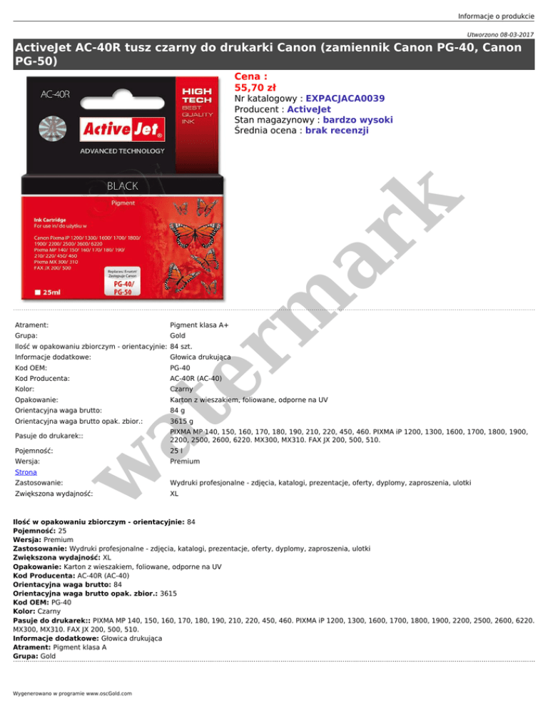 Informacje o produkcie Utworzono 08-03-2017 ActiveJet AC-40R tusz czarny do drukarki Canon (zamiennik Canon PG-40, Canon PG-50) Cena : 55,70 zł Atrament: er m ar k Nr katalogowy : EXPACJACA0039 Producent : ActiveJet Stan magazynowy : bardzo wysoki Średnia ocena : brak recenzji Pigment klasa A+ Grupa: Gold Ilość w opakowaniu zbiorczym - orientacyjnie: 84 szt. Informacje dodatkowe: Kod OEM: Głowica drukująca PG-40 Kod Producenta: AC-40R (AC-40) Kolor: Czarny Opakowanie: Karton z wieszakiem, foliowane, odporne na UV 84 g at Orientacyjna waga brutto: Orientacyjna waga brutto opak. zbior.: 3615 g Pasuje do drukarek:: PIXMA MP 140, 150, 160, 170, 180, 190, 210, 220, 450, 460. PIXMA iP 1200, 1300, 1600, 1700, 1800, 1900, 2200, 2500, 2600, 6220. MX300, MX310. FAX JX 200, 500, 510. Pojemność: Strona 25 l Premium w Wersja: Zastosowanie: Wydruki profesjonalne - zdjęcia, katalogi, prezentacje, oferty, dyplomy, zaproszenia, ulotki Zwiększona wydajność: XL Ilość w opakowaniu zbiorczym - orientacyjnie: 84 Pojemność: 25 Wersja: Premium Zastosowanie: Wydruki profesjonalne - zdjęcia, katalogi, prezentacje, oferty, dyplomy, zaproszenia, ulotki Zwiększona wydajność: XL Opakowanie: Karton z wieszakiem, foliowane, odporne na UV Kod Producenta: AC-40R (AC-40) Orientacyjna waga brutto: 84 Orientacyjna waga brutto opak. zbior.: 3615 Kod OEM: PG-40 Kolor: Czarny Pasuje do drukarek:: PIXMA MP 140, 150, 160, 170, 180, 190, 210, 220, 450, 460. PIXMA iP 1200, 1300, 1600, 1700, 1800, 1900, 2200, 2500, 2600, 6220. MX300, MX310. FAX JX 200, 500, 510. Informacje dodatkowe: Głowica drukująca Atrament: Pigment klasa A Grupa: Gold Wygenerowano w programie www.oscGold.com