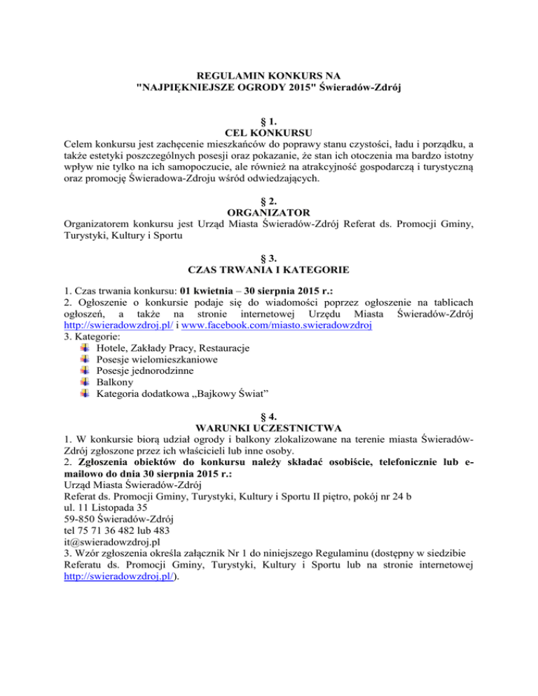 REGULAMIN KONKURS NA "NAJPIĘKNIEJSZE OGRODY 2015" Świeradów-Zdrój § 1. CEL KONKURSU Celem konkursu jest zachęcenie mieszkańców do poprawy stanu czystości, ładu i porządku, a także estetyki poszczególnych posesji oraz pokazanie, że stan ich otoczenia ma bardzo istotny wpływ nie tylko na ich samopoczucie, ale również na atrakcyjność gospodarczą i turystyczną oraz promocję Świeradowa-Zdroju wśród odwiedzających. § 2. ORGANIZATOR Organizatorem konkursu jest Urząd Miasta Świeradów-Zdrój Referat ds. Promocji Gminy, Turystyki, Kultury i Sportu § 3. CZAS TRWANIA I KATEGORIE 1. Czas trwania konkursu: 01 kwietnia – 30 sierpnia 2015 r.: 2. Ogłoszenie o konkursie podaje się do wiadomości poprzez ogłoszenie na tablicach ogłoszeń, a także na stronie internetowej Urzędu Miasta Świeradów-Zdrój http://swieradowzdroj.pl/ i www.facebook.com/miasto.swieradowzdroj 3. Kategorie: Hotele, Zakłady Pracy, Restauracje Posesje wielomieszkaniowe Posesje jednorodzinne Balkony Kategoria dodatkowa „Bajkowy Świat” § 4. WARUNKI UCZESTNICTWA 1. W konkursie biorą udział ogrody i balkony zlokalizowane na terenie miasta ŚwieradówZdrój zgłoszone przez ich właścicieli lub inne osoby. 2. Zgłoszenia obiektów do konkursu należy składać osobiście, telefonicznie lub emailowo do dnia 30 sierpnia 2015 r.: Urząd Miasta Świeradów-Zdrój Referat ds. Promocji Gminy, Turystyki, Kultury i Sportu II piętro, pokój nr 24 b ul. 11 Listopada 35 59-850 Świeradów-Zdrój tel 75 71 36 482 lub 483 [email protected] 3. Wzór zgłoszenia określa załącznik Nr 1 do niniejszego Regulaminu (dostępny w siedzibie Referatu ds. Promocji Gminy, Turystyki, Kultury i Sportu lub na stronie internetowej http://swieradowzdroj.pl/). § 5. KOMISJE KONKURSOWE 1. W skład komisji konkursowej wchodzi od 3 do 5 osób. 2. Komisja dokonuje przeglądu zgłoszonych ogrodów lub balkonów po otrzymaniu zgłoszenia i wcześniejszym uzgodnieniu terminu z zainteresowanym (istnieje możliwość przesłania dokumentacji fotograficznej na adres [email protected]) . § 6. PRZEDMIOT OCENY KONKURSU 1. Przedmiotem oceny konkursu jest ogólna estetyka obiektu oraz bieżąca konserwacja ze szczególnym uwzględnieniem następujących kryteriów: a) czystość, ład i porządek na terenie całej posesji: 0 – 20 pkt., b) ogród kwiatowy w tym różnorodność kwiatów: 0 – 20 pkt., c) różnorodność krzewów, zadrzewienie: 0 – 20 pkt., d) dodatkowe elementy architektury ogrodowej: 0 – 20 pkt., e) ogólne wrażenie estetyczne: 0 – 20 pkt. 2. Uzyskane oceny pozostają do wyłącznej wiadomości komisji. 3. Komisja ma prawo wyłonić grono finalistów i dokonać ponownego przeglądu celem ostatecznego wyłonienia laureatów. § 7. POSTANOWIENIA KONCOWE 1. Nagrodami zostaną wyróżnione I, II, i III miejsca. Komisja może również przyznać wyróżnienia. 2. Zwycięzcy konkursu otrzymają pamiątkowe dyplomy i nagrody. 3. Organizator zastrzega sobie prawo do innego podziału nagród. 4. Od postanowienia komisji konkursowej nie przysługuje odwołanie. 5. Komisja konkursowa nie uzasadnia decyzji o nie przyznaniu nagrody bądź wyróżnienia. 6. Ogłoszenie wyników konkursu i rozdanie nagród nastąpi w październiku 2015 r. na Sesji Rady Miasta. 7. Prawo do interpretacji regulaminu konkursu, bądź rozstrzygania kwestii nie ujętych w regulaminie przysługuje Przewodniczącemu komisji konkursowej. § 8. PRZETWARZANIE DANYCH OSOBOWYCH 1. Wzięcie udziału w Konkursie jest równoznaczne z wyrażeniem zgody na wykorzystanie danych osobowych Uczestników zgodnie z przepisami Ustawy z dnia 29 sierpnia 1997 roku o ochronie danych osobowych, o ile dane takie będą ujawniane w toku Konkursu i w związku z jego przebiegiem. 2. Dane osobowe Uczestników przetwarzane będą przez Organizatora Konkursu lub podmioty działające na jego zlecenie w celu przeprowadzania Konkursu i w związku z wykonywaniem postanowień niniejszego Regulaminu, a w szczególności w celu komunikacji z Uczestnikami, wyłonienia Zwycięzcy Konkursu, wydania nagrody, promocji imprezy, podania do publicznej wiadomości danych zwycięzców i wszystkich uczestników biorących udział w konkursie zgodnie z Ustawą o ochronie danych osobowych (Dz.U. z 2002 r. Nr 101, poz.926). Uczestnikom przysługuje prawo wglądu i poprawiania danych osobowych. 3. Podanie danych osobowych jest dobrowolne, jednakże w przypadku, gdy Uczestnik odmówi podania danych lub odmówi zgody na przetwarzanie danych osobowych dla potrzeb realizacji niniejszego Konkursu, projekt konkursowy przez niego zgłoszony nie będzie brany pod uwagę przy przeprowadzaniu Konkursu. 4. Dane, po ich wykorzystaniu w celu przeprowadzenia Konkursu i wydania nagrody, zostaną niezwłocznie usunięte. 5. Administratorem danych jest Organizator.