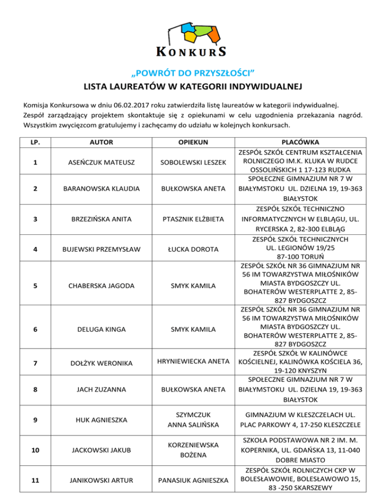 „POWRÓT DO PRZYSZŁOŚCI” LISTA LAUREATÓW W KATEGORII