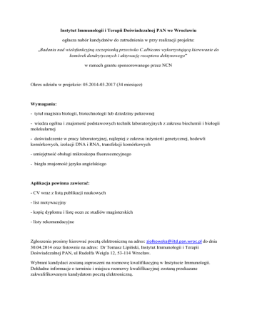 Instytut Immunologii i Terapii Doświadczalnej PAN we Wrocławiu ogłasza nabór kandydatów do zatrudnienia w przy realizacji projektu: „Badania nad wielofunkcyjną szczepionką przeciwko C.albicans wykorzystującą kierowanie do komórek dendrytycznych i aktywację receptora dektynowego” w ramach grantu sponsorowanego przez NCN Okres udziału w projekcie: 05.2014-03.2017 (34 miesiące) Wymagania: - tytuł magistra biologii, biotechnologii lub dziedziny pokrewnej - wiedza ogólna i znajomość podstawowych technik laboratoryjnych z zakresu biochemii i biologii molekularnej - doświadczenie w pracy laboratoryjnej, najlepiej z zakresu inżynierii genetycznej, hodowli komórkowych, izolacji DNA i RNA, transfekcji komórkowych - umiejętność obsługi mikroskopu fluorescencyjnego - biegła znajomość języka angielskiego Aplikacja powinna zawierać: - CV wraz z listą publikacji naukowych - list motywacyjny - kopię dyplomu i listę ocen ze studiów magisterskich - listy rekomendacyjne Zgłoszenia prosimy kierować pocztą elektroniczną na adres: [email protected] do dnia 30.04.2014 oraz listownie na adres: Dr Tomasz Lipiński, Instytut Immunologii i Terapii Doświadczalnej PAN, ul Rudolfa Weigla 12, 53-114 Wrocław. Wybrani kandydaci zostaną zaproszeni na rozmowę kwalifikacyjną w Instytucie Immunologii. Dokładne informacje o terminie i miejscu rozmowy kwalifikacyjnej zostaną przekazane zakwalifikowanym kandydatom pocztą elektroniczną.