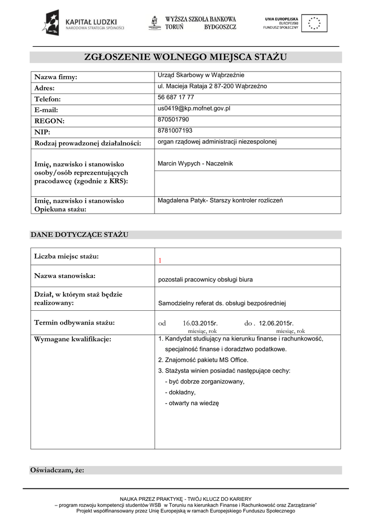 ZGŁOSZENIE WOLNEGO MIEJSCA STAŻU Nazwa firmy: Adres: Telefon: E-mail: REGON: NIP: Rodzaj prowadzonej działalności: Urząd Skarbowy w Wąbrzeźnie Imię, nazwisko i stanowisko osoby/osób reprezentujących pracodawcę (zgodnie z KRS): Marcin Wypych - Naczelnik Imię, nazwisko i stanowisko Opiekuna stażu: Magdalena Patyk- Starszy kontroler rozliczeń ul. Macieja Rataja 2 87-200 Wąbrzeźno 56 687 17 77 [email protected] 870501790 8781007193 organ rządowej administracji niezespolonej DANE DOTYCZĄCE STAŻU Liczba miejsc stażu: 1 Nazwa stanowiska: pozostali pracownicy obsługi biura Dział, w którym staż będzie realizowany: Samodzielny referat ds. obsługi bezpośredniej Termin odbywania stażu: od Wymagane kwalifikacje: 16.03.2015r. do . 12.06.2015r. miesiąc, rok miesiąc, rok 1. Kandydat studiujący na kierunku finanse i rachunkowość, specjalność finanse i doradztwo podatkowe. 2. Znajomość pakietu MS Office. 3. Stażysta winien posiadać następujące cechy: - być dobrze zorganizowany, - dokładny, - otwarty na wiedzę Oświadczam, że: NAUKA PRZEZ PRAKTYKĘ - TWÓJ KLUCZ DO KARIERY – program rozwoju kompetencji studentów WSB w Toruniu na kierunkach Finanse i Rachunkowość oraz Zarządzanie” Projekt współfinansowany przez Unię Europejską w ramach Europejskiego Funduszu Społecznego - zakład nie jest w stanie upadłości, likwidacji; - organizacja stażu dla skierowanego studenta nie będzie przyczyną zwolnień pracowników zatrudnionych w przedsiębiorstwie. SZCZEGÓŁOWY PROGRAM STAŻU Zakres obowiązków Stażysty - analizy zeznań (deklaracji) podatkowych i ich wprowadzenie do systemu komputerowego, - egzekucji administracyjnej w zakresie: aktualnie obowiązujących przepisów prawnych, organizacji dokumentów egzekucyjnych (podstawa wystawiania tytułu egzekucyjnego), ewidencji tytułów egzekucyjnych - egzekucja zaległości podatkowych objętych tytułem egzekucyjnym - księgowości podatkowej w zakresie: ewidencji podatkowej kart kontowych podatnika i płatnika, wystawiania upomnień i tytułów wykonawczych, zwrotów podatków i nadpłat, archiwizacji danych, sposobów postępowania z zaległościami podatkowymi, wydawania zaświadczeń - sporządzania pism do organów podatkowych itp. Wymiar godzinowy Liczba godzin dziennie: 8 Godziny pracy: od 7.15 do 15.15 Praca przy monitorze ekranowym co najmniej połowę dobowego wymiaru czasu pracy TAK □ NIE □ Cele edukacyjne 1. Zapoznanie się z organizacją podmiotu (profil działalności, branża, sektor w którym funkcjonuje podmiot, cele działalności, podmiotu i jego struktura organizacyjna) 2. Zapoznanie się z przepisami wewnętrznymi regulującymi funkcjonowanie podmiotu (przepisy bhp i przeciwpożarowe, regulamin pracy podmiotu, przepisy dotyczące zachowania tajemnicy związanej z prowadzoną działalnością, normy i certyfikaty posiadane przez podmiot, zasady obiegu i archiwizacji dokumentów w podmiocie) 3. Identyfikacja przez studenta specyfiki podmiotu przyjmującego na staż m.in. - zapoznanie się ze specyfiką pracy biurowej, sposobem jej organizacji, - zapoznanie się z posiadanym sprzętem/wyposażeniem i sposobem korzystania z niego, ze szczególnym zwróceniem uwagi na systemy informatyczne i programy specjalistyczne wykorzystywane w firmie, - zapoznanie się z dokumentacją charakterystyczną dla podmiotu przyjmującego na staż: wzorami umów, regulaminami 4. Czynne posługiwanie się techniką komputerową. NAUKA PRZEZ PRAKTYKĘ - TWÓJ KLUCZ DO KARIERY – program rozwoju kompetencji studentów WSB w Toruniu na kierunkach Finanse i Rachunkowość oraz Zarządzanie” Projekt współfinansowany przez Unię Europejską w ramach Europejskiego Funduszu Społecznego Zobowiązuję się do: - dostarczenia, wraz z wypełnionym Zgłoszeniem wolnego miejsca stażu, kserokopii wpisu do KRS - wzięcia udziału w spotkaniu informacyjnym dla studentów, podczas którego zostanie zaprezentowana firma/instytucja, którą reprezentuję ………………………….. Miejscowość i data …………………..………………………………….. Podpis osoby reprezentującej i pieczątka firm NAUKA PRZEZ PRAKTYKĘ - TWÓJ KLUCZ DO KARIERY – program rozwoju kompetencji studentów WSB w Toruniu na kierunkach Finanse i Rachunkowość oraz Zarządzanie” Projekt współfinansowany przez Unię Europejską w ramach Europejskiego Funduszu Społecznego