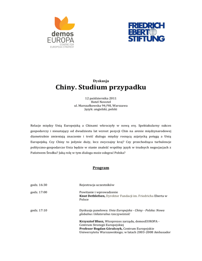 Dyskusja Chiny. Studium przypadku 12 października 2011 Hotel Novotel ul. Marszałkowska 94/98, Warszawa Język: angielski, polski Relacje między Unią Europejską a Chinami wkroczyły w nową erę. Spektakularny sukces gospodarczy i nieustający od dwudziestu lat wzrost pozycji Chin na arenie międzynarodowej diametralnie zmieniają znaczenie i treść dialogu między rosnącą azjatycką potęgą a Unią Europejską. Czy Chiny to jedynie duży, lecz zwyczajny kraj? Czy przechodząca turbulencje polityczno-gospodarcze Unia będzie w stanie znaleźć wspólny język w trudnych negocjacjach z Państwem Środka? Jaką rolę w tym dialogu może odegrać Polska? Program godz. 16:30 Rejestracja uczestników godz. 17:00 Powitanie i wprowadzenie Knut Dethlefsen, Dyrektor Fundacji im. Friedricha Eberta w Polsce godz. 17:10 Dyskusja panelowa: Unia Europejska - Chiny - Polska: Nowa globalna i bilateralna rzeczywistość Krzysztof Blusz, Wiceprezes zarządu, demosEUROPA Centrum Strategii Europejskiej Profesor Bogdan Góralczyk, Centrum Europejskie Uniwersytetu Warszawskiego; w latach 2003-2008 Ambasador RP w Tajlandii, Filipinach i Myanmar (d. Birma) Dietmar Nietan, członek Komisji ds. Unii Europejskiej Bundestagu, zastępca członka Komisji Spraw Zagranicznych, Niemcy Jürgen Stetten, Szef departamentu Azji, Fundacja im. Friedricha Eberta, Niemcy Joerg Wuttke, Chief Representative, BASF (China); w latach 2007-2010 Prezydent Europejskiej Izby Handlowej w Chinach (European Chamber of Commerce), Chiny Moderacja: Paweł Świeboda, Prezes demosEUROPA - Centrum Strategii Europejskiej godz. 18:25 Sesja pytań i odpowiedzi godz. 18:40 Konkluzje i zakończenie debaty