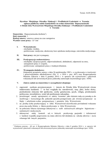 Toruń, 16.05.2016r. Dyrektor Miejskiego Ośrodka Edukacji i Profilaktyki Uzależnień w Toruniu ogłasza publiczny nabór kandydatów na wolne stanowisko Depozytariuszki w Dziale Izba Wytrzeźwień Miejskiego Ośrodka Edukacji i Profilaktyki Uzależnień w Toruniu Stanowisko: Depozytariuszka (kobieta1) Ilość stanowisk: 1 Rodzaj umowy: umowa o pracę na czas zastępstwa Wymiar czasu pracy: 1,0 etat I. II. Wykształcenie: - niezbędne: średnie, - preferowane: medyczne, ukończony kurs opiekuna medycznego, ratownika medycznego. Staż pracy: nie jest wymagany. III. Predyspozycje osobowościowe: - niezbędne: dyspozycyjność, odpowiedzialność, dokładność, odporność na stres, umiejętność pracy w zespole, - preferowane: umiejętność pracy z trudnym klientem. IV. Wymagania dodatkowe: Znajomość przepisów ustawy z dnia 26 października 1982 r. o wychowaniu w trzeźwości i przeciwdziałaniu alkoholizmowi (Dz. U. z 2016 r. poz. 487) oraz Rozporządzenia Ministra Zdrowia z dnia 8 grudnia 2014 r. w sprawie izb wytrzeźwień i placówek wskazanych lub utworzonych przez jednostkę samorządu terytorialnego (poz. 1850). V. Zakres zadań na stanowisku w szczególności obejmuje: 1. zapewnić osobom przyjmowanym i innym do Działu Izba Wytrzeźwień równe traktowanie każdemu i to bez względu na: narodowość, rasę, płeć, kolor skóry, pochodzenie etniczne lub społeczne, cechy genetyczne, język, religię, przekonania polityczne, inwalidztwo, wiek lub preferencje seksualne, 2. przestrzegać zasady uprzejmości, co należy rozumieć jako służenie radą czy poradą co do możliwego i korzystnego dla jednostki sposobu postępowania jak również przepraszać za błędy i uchybienia wobec pensjonariuszy i petentów Izby Wytrzeźwień, 3. na prośbę osoby przebywającej w Izbie Wytrzeźwień niezwłocznie powiadomić wskazane przez nią osoby bliskie o fakcie przebywania w Izbie Wytrzeźwień, 4. na polecenie lekarza dyżurnego dokonywać u osób nietrzeźwych zabiegów higieniczno – sanitarnych i medycznych, 5. dokonywać stałej kontroli sal, w których przebywają pacjentki i informować o każdym wypadku pogorszenia się stanu zdrowia lub działania na szkodę zdrowia i życia własnego lub innych pacjentów, 1 Podstawa prawna - §8 ust. 6 Rozporządzenia Ministra Zdrowia z dnia 8 grudnia 2014 r. w sprawie izb wytrzeźwień i placówek wskazanych lub utworzonych przez jednostkę samorządu terytorialnego (poz. 1850). 6. dokonywać na bieżąco zmiany pościeli oraz dbać o wygląd estetyczny pomieszczeń i łóżek, 7. przyjmować interesantów w sprawach związanych z regulowaniem należności, 8. prowadzić rejestr ponagleń do zapłaty należności rozłożonych na raty, 9. prowadzić akta pensjonariuszy, 10. wykonywać polecenia bezpośredniego przełożonego i Dyrektora jednostki wynikających z obowiązku służbowego. VI. 1. 2. 3. 4. Wymagane dokumenty: CV, list motywacyjny świadectwa i dyplomy potwierdzające wykształcenie /kserokopie/ dokumenty potwierdzające staż pracy /kserokopie/ dokumenty potwierdzające dodatkowe kwalifikacje /kserokopie. Wymagane dokumenty aplikacyjne zawarte w ofercie powinny być opatrzone klauzulą: „Wyrażam zgodę na przetwarzanie moich danych osobowych zawartych w ofercie pracy dla potrzeb niezbędnych do realizacji procesu rekrutacji zgodnie z ustawą z dnia 29.08.1997r. o ochronie danych osobowych /Dz.U. z 2002r. nr 101, poz. 926 z późn. zm./. VII. Termin i miejsce składania dokumentów: Wymagane dokumenty w zamkniętej kopercie z dopiskiem: „Konkurs na stanowisko Depozytariuszki w Miejskim Ośrodku Edukacji i Profilaktyki Uzależnień w Toruniu” należy składać w terminie do dnia 30.05.2016r. do godziny 12.00 w sekretariacie Ośrodka lub listownie na adres: Miejski Ośrodek Edukacji i Profilaktyki Uzależnień ul. Kasztanowa 16 87 – 100 Toruń Za datę złożenia oferty uważa się datę wpływu. VIII. Informacje o przebiegu naboru: 1. złożone oferty będą badane pod względem kompletności i spełniania przez kandydatów wymagań formalnych na w/w stanowisko, 2. aplikacje, które wpłyną do Miejskiego Ośrodka Edukacji i Profilaktyki Uzależnień w Toruniu po wyżej określonym terminie nie będą rozpatrywane, 3. osoby spełniające wymagania formalne poinformowane zostaną telefonicznie o rozmowie kwalifikacyjnej w dniu 30.05.2016r. Dyrektor Miejskiego Ośrodka Edukacji i Profilaktyki Uzależnień w Toruniu (-) Danuta Gadziomska