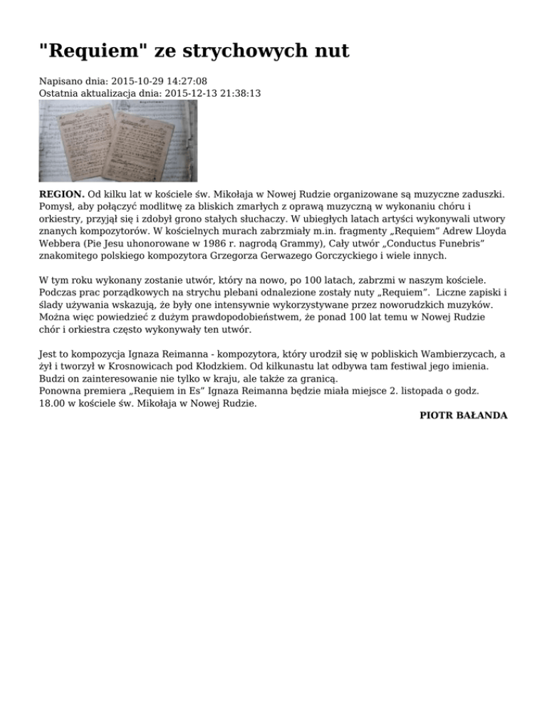 "Requiem" ze strychowych nut Napisano dnia: 2015-10-29 14:27:08 Ostatnia aktualizacja dnia: 2015-12-13 21:38:13 REGION. Od kilku lat w kościele św. Mikołaja w Nowej Rudzie organizowane są muzyczne zaduszki. Pomysł, aby połączyć modlitwę za bliskich zmarłych z oprawą muzyczną w wykonaniu chóru i orkiestry, przyjął się i zdobył grono stałych słuchaczy. W ubiegłych latach artyści wykonywali utwory znanych kompozytorów. W kościelnych murach zabrzmiały m.in. fragmenty „Requiem” Adrew Lloyda Webbera (Pie Jesu uhonorowane w 1986 r. nagrodą Grammy), Cały utwór „Conductus Funebris” znakomitego polskiego kompozytora Grzegorza Gerwazego Gorczyckiego i wiele innych. W tym roku wykonany zostanie utwór, który na nowo, po 100 latach, zabrzmi w naszym kościele. Podczas prac porządkowych na strychu plebani odnalezione zostały nuty „Requiem”. Liczne zapiski i ślady używania wskazują, że były one intensywnie wykorzystywane przez noworudzkich muzyków. Można więc powiedzieć z dużym prawdopodobieństwem, że ponad 100 lat temu w Nowej Rudzie chór i orkiestra często wykonywały ten utwór. Jest to kompozycja Ignaza Reimanna - kompozytora, który urodził się w pobliskich Wambierzycach, a żył i tworzył w Krosnowicach pod Kłodzkiem. Od kilkunastu lat odbywa tam festiwal jego imienia. Budzi on zainteresowanie nie tylko w kraju, ale także za granicą. Ponowna premiera „Requiem in Es” Ignaza Reimanna będzie miała miejsce 2. listopada o godz. 18.00 w kościele św. Mikołaja w Nowej Rudzie. PIOTR BAŁANDA