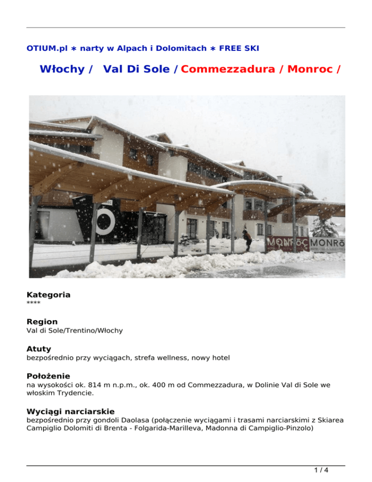 OTIUM.pl ∗ narty w Alpach i Dolomitach ∗ FREE SKI Włochy / Val Di Sole / Commezzadura / Monroc / Kategoria **** Region Val di Sole/Trentino/Włochy Atuty bezpośrednio przy wyciągach, strefa wellness, nowy hotel Położenie na wysokości ok. 814 m n.p.m., ok. 400 m od Commezzadura, w Dolinie Val di Sole we włoskim Trydencie. Wyciągi narciarskie bezpośrednio przy gondoli Daolasa (połączenie wyciągami i trasami narciarskimi z Skiarea Campiglio Dolomiti di Brenta - Folgarida-Marilleva, Madonna di Campiglio-Pinzolo) 1/4 Wyposażenie recepcja, winda, restauracja, bar, przechowalnia sprzętu narciarskiego, parking (gratis), garaż (gratis). Hotel posiada 3 piętra; nowy obiekt, otwarty w 2015 roku Internet tak (Wi-Fi, gratis) Karty kredytowe tak (Visa, Mastercard) Sport i relaks centrum wellness (ok. 400 m<sup>2</sup>, wstęp gratis) - łaźnia parowa, bio sauna, sauna fińska, prysznice sensoryczne, 3 strefy relaksacyjne; wypożyczenie szlafroka, ręcznik kąpielowego oraz klapek kąpielowych w cenie. Zabiegi kosmetyczne i masaże za opłatą (na zapytanie) Szkolenie narciarskie Val di Sole/Marilleva 1400 lub Folgarida w terminach 14.01-26.02.2017 proponujemy (dodatkowo płatne) 6-dniowe grupowe szkolenia narciarskie na wszystkich poziomach zaawansowania dla dzieci od 4 lat, młodzieży i dorosłych - 2,5 h dziennie i dla jeżdżących w stopniu min. podstawowym dzieci 6-12 lat - 4,5 h lub 5,5 h dziennie. (Uwaga! w Marillevie nie prowadzimy szkoleń na poziomie 0, zajęcia dla początkujących odbywają się w Folgaridzie). Fakultatywna dopłata przy rezerwacji. Szczegóły i ceny na stronie www - Szkolenia narciarskie - info Pokoje hotel dysponuje 40 pokojami w tym m.in. typu STANDARD oraz COMFORT. Pokoje STANDARD - (ok. 18 m<sup>2</sup>), dwuosobowe z możliwością jednej dostawki; łazienka z WC, suszarka do włosów; sat-TV, Wi-Fi, minibar (za opłatą), sejf (za opłatą); balkon. Pokoje COMFORT - (ok. 22 m<sup>2</sup>), dwuosobowe z możliwością dwóch dostawek; łazienka z WC, suszarka do włosów; sat-TV, Wi-Fi, (za opłatą), sejf (za opłatą); balkon Wyżywienie śniadania w formie kontynentalnego bufetu i 3-daniowe ciepłe kolacje podawane przez kelnera (wybór z menu), bufet sałatkowy. Napoje do kolacji za dodatkową opłatą Pieski nie Kategoria lokalna **** Kolacja sylwestrowa w cenie Świadczenia 2/4 7 noclegów (Uwaga! W terminie 17-22.12.2016 - oferta z przejazdem autokarem, 5 noclegów, wykwaterowanie 22.12 ok. 18.00; w terminie 17-23.12.2016 - oferta z dojazdem własnym, 6 noclegów, 03-07.01.2017 - 4 noclegi), wyżywienie 2 x dziennie zgodnie z opisem, ubezpieczenie Signal Iduna - Bezpieczne Podróże (w tym rekreacyjne uprawianie narciarstwa zjazdowego, biegowego lub snowboardu na oznakowanych trasach zjazdowych) - KL, KR, NNW i bagażu, opieka włoskiego kontrahenta Uwaga Zalecamy dodatkowe ubezpieczenie OC/SS (w tym sprzęt sportowy) Signal Iduna - 35 zł/os/pobyt Obowiązkowe opłaty na miejscu taksa klimatyczna ok. 1-2 euro/os./dzień Zakwaterowanie przyjazd - w godz. 14.00-23.00, wyjazd - do godz. 10.00 Autokar przejazd komfortowym autokarem (klimatyzacja, WC, bar, video), warunki przewozu, cennik, program i rozkład jazdy na stronie organizatora (Uwaga! W terminie 16-23.12.2016 tylko dla pobytów 5-dniowych) Zniżki (na dostawkach) i dopłaty dzieci do 2,9 lat - gratis (łóżeczko - na zapytanie), dzieci 3-6,9 lat - 50% zniżki, dzieci 7-16,9 lat - 30% zniżki, od 17 lat - 20% zniżki. Dopłata do pokoju jednoosobowego według cen w systemie. Uwaga! W terminach Free Ski zniżki wg cen w systemie. Dopłata za ubezpieczenie od kosztów rezygnacji 2,4% Oferta Free Ski W terminach 03-17.12.2016 i 25.03-08.04.2017 karnet 6-dniowy Superskirama Adamello Brenta w cenie. W terminach 17-24.12.2016, 11-25.03.2017 karnet 6-dniowy FolgaridaMarilleva w cenie. Uwaga! W terminach 17-22.12.2016 (oferta autokarowa) i 17-23.12.2016 karnet 5-dniowy Folgarida-Marilleva. W dniu rezerwacji istnieje możliwość dopłaty do karnetu Skiarea Campiglio Dolomiti di Brenta (obejmuje Folgarida, Marilleva, Madonna di Campiglio, Pinzolo, Pejo) - w terminie 17-22.12 i 17-23.12.2016 - 175 zł/os., w terminie 17-24.12.2016 - 195 zł/os., w terminie 11-18.03.2016 - 275 zł/os. W terminie 18-25.03.2017 możliwość dopłaty do karnetu Superskirama Adamello Brenta - 225 zł/os. Uwaga W pozostałych terminach na podstawie Vouchera, we wszystkich kasach Folgarida/Marilleva zniżka 5% dla Klientów Otium na 6-dniowe karnety Folgarida-Marilleva i SkiArea Campiglio Dolomiti di Brenta (ok. 150 km połączonych tras Folgarida-Marilleva, Madonna di Campiglio-Pinzolo, Pejo). Dzieci do 8 lat - gratis (1 karnet dla dziecka gratis na 1 karnet dla osoby dorosłej) Promocje Niezmienność ceny - dla rezerwacji potwierdzonych do 30.11.2016. Oferta Early Booking - 3/4 5% zniżki na rezerwacje potwierdzone do 15.10.2016. Ceny w systemie uwzględniają promocję data skąd pobyt opis cena / os 11.03.2017 nie dotyczy 7 dni Pokój: Pokój COMFORT Wyżywienie: śniadania+obiadokolacje 3575 zł / os 18.03.2017 nie dotyczy 7 dni Pokój: Pokój COMFORT Wyżywienie: śniadania+obiadokolacje 3475 zł / os 25.03.2017 nie dotyczy 7 dni Pokój: Pokój COMFORT Wyżywienie: śniadania+obiadokolacje 3320 zł / os 01.04.2017 nie dotyczy 7 dni Pokój: Pokój COMFORT Wyżywienie: śniadania+obiadokolacje 3320 zł / os OTIUM POLSKA SP. Z O.O. 30-150 KRAKÓW UL. ARMII KRAJOWEJ 12 lok. 11 tel./fax +48-12.4469214, 12.4469215, 12.4469216, 12.4469217 Zapraszamy poniedziałek-piątek w godzinach 10.00-18.00 (soboty 10.00-14.00 od połowy listopada do połowy kwietnia) E-mail: [email protected] Strona Internetowa: www.otium.pl 4/4 Powered by TCPDF (www.tcpdf.org)