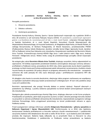 Protokół z posiedzenia Komisji Kultury, Oświaty, w dniu 28 września 2016 roku Sportu i Spraw Społecznych Porządek posiedzenia: 1. Otwarcie posiedzenia. 2. Debata o zdrowiu. 3. Zamknięcie posiedzenia. Posiedzenie Komisji Kultury, Oświaty, Sportu i Spraw Społecznych rozpoczęło się o godzinie 18:00 w dniu 28 września w sali lustrzanej Pałacyku Kasyna (CKiIO). W posiedzeniu uczestniczyli zaproszeni goście: z-ca Dyrektora ds. Lecznictwa prof. dr hab. n. med. Jacek Pawlak - ordynator Chirurgii Ogólnej w Szpitalu Zachodnim, dr n. med. Marek Stopiński, Konsultant Chorób Wewnętrznych dla Województwa Mazowieckiego, dr Krzysztof Sankiewicz, dr Magdalena Bijak-Perka, dr Marek Pleskot, dr Jadwiga Borzymowska, dr Barbara Podogrodzka, dr Marek Karpowicz, przedstawicielka PWSM (Podkowiańska Wyższa Szkoła Medyczna), dyrektor ośrodka Senior-Wigor Agnieszka Kurak, dyrektor OPS w Podkowie Leśnej Ewa Zalewska oraz mieszkańcy. Gospodarzami spotkania był Burmistrz Miasta Artur Tusiński, Przewodnicząca Komisji KOSiSS Olga Jarco i radni (obecni radni: Olga Jarco, Andrzej Porowski i Małgorzata Janus). Wobec braku uwag do przedstawionego porządku obrad rozpoczęto posiedzenie. Na wstępie głos zabrał Burmistrz Miasta Artur Tusiński, dziękując wszystkim, którzy odpowiedzieli na zaproszenie. W krótkiej wypowiedzi przedstawił działania samorządowe dotyczące ochrony zdrowia i profilaktyki w Podkowie Leśnej, prowadzone do 2014 roku, które ograniczały się do dwóch aspektów): przetargu na lokal miasta pod funkcje podstawowej opieki zdrowotnej i przeznaczenia z budżetu miasta rocznie kwoty do wysokości 20 tysięcy złotych na programy zdrowotne dla mieszkańców - szczepienia ochronne dla osób powyżej 65 roku życia dotyczące grypy i profilaktyczne szczepienia HPV dla dziewczynek. W ubiegłym roku kwota ta wzrosła dwukrotnie, obejmując także program realizowany we współpracy ze Szpitalem Zachodnim dotyczący badań przesiewowych onkologicznych. W tym roku podobna akcja rusza od 2 października. Burmistrz zaproponował, aby przyjąć formułę debaty w postaci dyskusji. Poprosił obecnych o podzielenie się refleksją z punktu widzenia specjalistów na temat działań samorządowych istotnych dla mieszkańców . Następnie głos zabrała przewodnicząca Komisji Olga Jarco, dziękując obecnym za tak liczne przybycie. Przedstawiła cel spotkania, jakim było przyjrzenie się temu co było i obranie pewnego kierunku działań na przyszłość w zakresie profilaktyki zdrowotnej dla mieszkańców. Zapowiedziała wystąpienie radnego Andrzeja Porowskiego, który przygotował prezentację na temat problematyki zdrowia w ujęciu Podkowy Leśnej. Przed wystąpieniem radnego informacji udzieliła Małgorzata Niewiadomska – główny specjalista w Referacie Organizacji i Spraw Obywatelskich UM. Poinformowała, że w 2016 roku będziemy kontynuować działania profilaktyczne w kierunku wykrycia chorób nowotworowych. 1 października zaczynamy badania USG dedykowane dla osób w wieku 40 do 50 lat – są to badania piersi dla kobiet i prostaty dla mężczyzn. Badania będą odbywały się w przychodni Basis w Owczarni na ulicy Kazimierzowskiej. Dodatkowo 2 października w Podkowie Leśnej przewidziane są badania mammograficzne. W tym celu w godzinach 9:00 - 16:00 przed Urzędem Miasta stanie mammobus; badania przeznaczone są dla kobiet w wieku od 40 do 75 lat. Radny Andrzej Porowski przedstawił prezentację pt. „Problematyka opieki zdrowotnej w Podkowie Leśnej” będącą punktem wyjściowym do dyskusji. W swojej prezentacji radny poruszył definicje dotyczące zdrowia, przedstawił dane demograficzne dla Podkowy, założenia finansowe dla profilaktyki zdrowotnej w mieście. Ponadto radny Porowski zwrócił uwagę na wiele problemów, które pojawiają się w Podkowie, przedstawił prognozy, dane dotyczące występujących chorób w zależności od wieku. W kontekście zmian demograficznych radny apelował o wrażliwość władz samorządu do zapewnienia samodzielności osobom starszym, co mogłoby obejmować pomoc samorządu w przystosowywaniu się i przygotowaniu tych osób do starzenia się - poprzez pełnienie funkcji opiekuńczych. Swoją wypowiedź zakończył zobrazowaniem zrealizowanych programów profilaktyki zdrowotnej w mieście w latach 2009 - 2016 (zał. nr 1). Burmistrz Artur Tusiński przyznał, że działania Miasta w tym zakresie są chaotyczne z wyjątkiem szczepień przeciwko grypie. Zwrócił się do obecnych lekarzy z pytaniem, na co zwrócić uwagę, czy kontynuować program badań onkologicznych z 2015 roku, modyfikując program tak, aby jak największa grupa osób mogła skorzystać. W temacie ośrodka dla osób starszych z całodobową opieką Burmistrz poinformował, że w chwili obecnej miasta nie stać na tego typu działania, mimo narastającego problemu. Pocieszające jest to, że odsetek osób starszych w stosunku do przekroju społeczeństwa w Podkowie rośnie najwolniej wśród okolicznych gmin, co znaczy, że osoby starsze w pewnym wieku wyprowadzają się z Podkowy. Dr Krzysztof Sankiewicz - lekarz ginekolog, radny powiatu grodziskiego, uznał, że obecni na sali eksperci doskonale wiedzą, na czym w ich dziedzinie polegają badania profilaktyczne. Skład samych lekarzy nie skłania do dyskusji. Kontynuował, że badania profilaktyczne charakteryzują się przede wszystkim zdefiniowaniem grupy docelowej, ciągłością i przewlekłością procesu badawczego, ponieważ profilaktyka jest powtarzaniem pewnego rodzaju schematu i badaniami w określonym czasie w sposób ciągły. Kontynuując, stwierdził że rolą lekarzy I-szego kontaktu jest powtarzanie badań. Wspomniał o badaniach w kierunku układu pokarmowego typu gastroskopia, kolonoskopia, markery nowotworowe. Badania te trzeba powtarzać w sposób ciągły i przewlekły. Rolą lekarza I-szego kontaktu jest przypominanie o wykonywaniu badań przez mieszkańców, a rolą samorządu