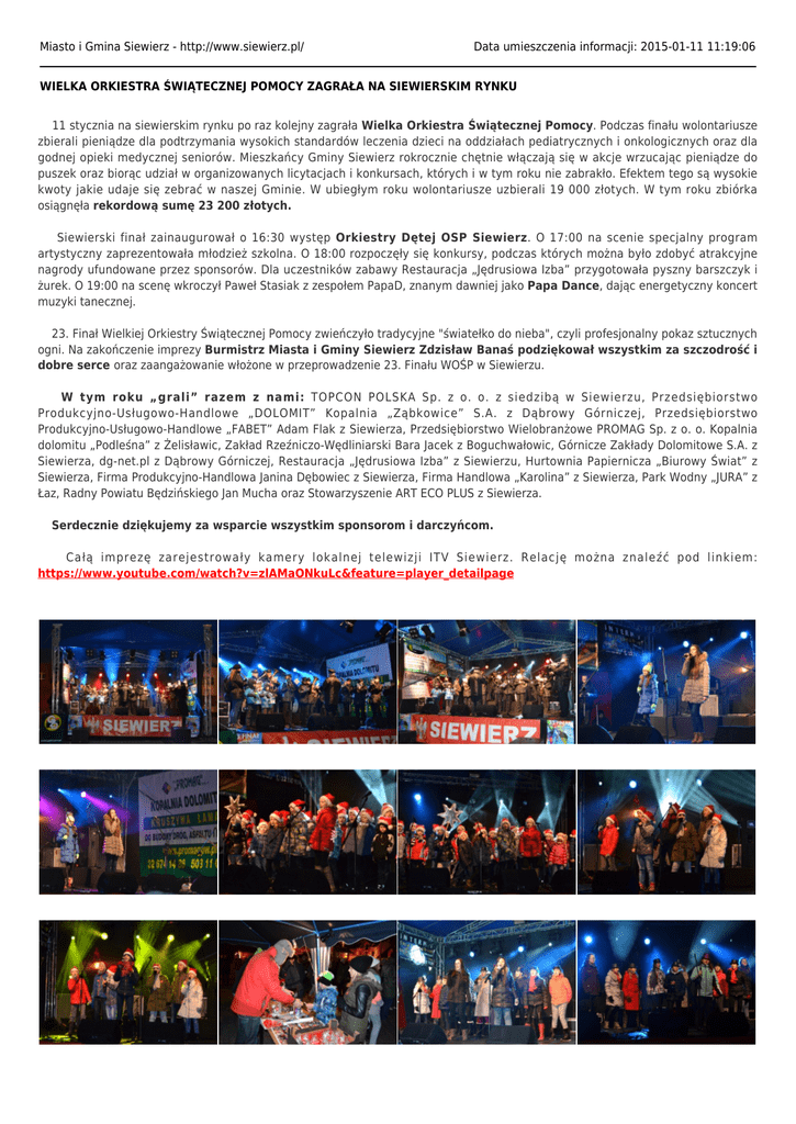 Miasto i Gmina Siewierz - http://www.siewierz.pl/ Data umieszczenia informacji: 2015-01-11 11:19:06 WIELKA ORKIESTRA ŚWIĄTECZNEJ POMOCY ZAGRAŁA NA SIEWIERSKIM RYNKU 11 stycznia na siewierskim rynku po raz kolejny zagrała Wielka Orkiestra Świątecznej Pomocy. Podczas finału wolontariusze zbierali pieniądze dla podtrzymania wysokich standardów leczenia dzieci na oddziałach pediatrycznych i onkologicznych oraz dla godnej opieki medycznej seniorów. Mieszkańcy Gminy Siewierz rokrocznie chętnie włączają się w akcje wrzucając pieniądze do puszek oraz biorąc udział w organizowanych licytacjach i konkursach, których i w tym roku nie zabrakło. Efektem tego są wysokie kwoty jakie udaje się zebrać w naszej Gminie. W ubiegłym roku wolontariusze uzbierali 19 000 złotych. W tym roku zbiórka osiągnęła rekordową sumę 23 200 złotych. Siewierski finał zainaugurował o 16:30 występ Orkiestry Dętej OSP Siewierz. O 17:00 na scenie specjalny program artystyczny zaprezentowała młodzież szkolna. O 18:00 rozpoczęły się konkursy, podczas których można było zdobyć atrakcyjne nagrody ufundowane przez sponsorów. Dla uczestników zabawy Restauracja „Jędrusiowa Izba” przygotowała pyszny barszczyk i żurek. O 19:00 na scenę wkroczył Paweł Stasiak z zespołem PapaD, znanym dawniej jako Papa Dance, dając energetyczny koncert muzyki tanecznej. 23. Finał Wielkiej Orkiestry Świątecznej Pomocy zwieńczyło tradycyjne "światełko do nieba", czyli profesjonalny pokaz sztucznych ogni. Na zakończenie imprezy Burmistrz Miasta i Gminy Siewierz Zdzisław Banaś podziękował wszystkim za szczodrość i dobre serce oraz zaangażowanie włożone w przeprowadzenie 23. Finału WOŚP w Siewierzu. W tym roku „grali” razem z nami: TOPCON POLSKA Sp. z o. o. z siedzibą w Siewierzu, Przedsiębiorstwo Produkcyjno-Usługowo-Handlowe „DOLOMIT” Kopalnia „Ząbkowice” S.A. z Dąbrowy Górniczej, Przedsiębiorstwo Produkcyjno-Usługowo-Handlowe „FABET” Adam Flak z Siewierza, Przedsiębiorstwo Wielobranżowe PROMAG Sp. z o. o. Kopalnia dolomitu „Podleśna” z Żelisławic, Zakład Rzeźniczo-Wędliniarski Bara Jacek z Boguchwałowic, Górnicze Zakłady Dolomitowe S.A. z Siewierza, dg-net.pl z Dąbrowy Górniczej, Restauracja „Jędrusiowa Izba” z Siewierzu, Hurtownia Papiernicza „Biurowy Świat” z Siewierza, Firma Produkcyjno-Handlowa Janina Dębowiec z Siewierza, Firma Handlowa „Karolina” z Siewierza, Park Wodny „JURA” z Łaz, Radny Powiatu Będzińskiego Jan Mucha oraz Stowarzyszenie ART ECO PLUS z Siewierza. Serdecznie dziękujemy za wsparcie wszystkim sponsorom i darczyńcom. Całą imprezę zarejestrowały kamery lokalnej telewizji ITV Siewierz. Relację można znaleźć pod linkiem: https://www.youtube.com/watch?v=zlAMaONkuLc&feature=player_detailpage Urząd Miasta i Gminy Siewierz, 42-470 Siewierz, ul. Żwirki i WIgury 16, tel. 32 64 99 400, e-mail: [email protected] Burmistrz Miasta i Gminy Siewierz mgr Zdzisław Banaś