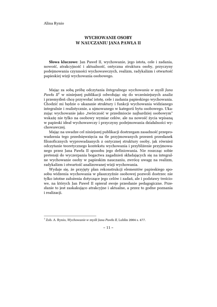Alina Rynio WYCHOWANIE OSOBY W NAUCZANIU JANA PAWĞA II Sğowa kluczowe: Jan Paweğ II, wychowanie, jego istota, cele i zadania, nowoıĄ, atrakcyjnoıĄ i aktualnoıĄ, ontyczna struktura osoby, przyczyny podejmowania czynnoıci wychowawczych, realizm, radykalizm i otwartoıĄ papieskiej wizji wychowania osobowego. MajĂc za sobĂ próbĎ odczytania Integralnego wychowania w myıli Jana Pawğa II1 w niniejszej publikacji odwoğujĂc siĎ do wczeıniejszych analiz i przemyıleġ chcĎ przywoğaĄ istotĎ, cele i zadania papieskiego wychowania. ChodziĄ mi bĎdzie o ukazanie struktury i funkcji wychowania widzianego integralnie i realistycznie, a ujmowanego w kategorii bytu osobowego. UkazujĂc wychowanie jako „twórczoıĄ w przedmiocie najbardziej osobowym” wskaŃĎ nie tylko na osobowy wymiar celów, ale na nowoıĄ Ńycia wpisanĂ w papieski ideağ wychowawczy i przyczyny podejmowania dziağalnoıci wychowawczej. MajĂc na uwadze cel niniejszej publikacji dostrzegam zasadnoıĄ przeprowadzenia tego przedsiĎwziĎcia na tle przyjmowanych przezeġ przesğanek filozoficznych wyprowadzanych z ontycznej struktury osoby, jak równieŃ odczytanie teoretycznego kontekstu wychowania i przybliŃenie przyjmowanego przez Jana Pawğa II sposobu jego definiowania. Nie roszczĂc sobie pretensji do wyczerpania bogactwa zagadnieġ skğadajĂcych siĎ na integralne wychowanie osoby w papieskim nauczaniu, zwrócĎ uwagĎ na realizm, radykalizm i otwartoıĄ analizowanej wizji wychowania. Wydaje siĎ, Ńe przyjĎty plan rekonstrukcji elementów papieskiego sposobu widzenia wychowania w pğaszczyŁnie osobowej pozwoli dostrzec nie tylko istotne zağoŃenia dotyczĂce jego celów i zadaġ, ale i podstawy treıciowe, na których Jan Paweğ II opierağ swoje przesğanie pedagogiczne. Przesğanie to jest zaskakujĂco atrakcyjne i aktualne, a przez to godne poznania i realizacji. 1 Zob. A. Rynio, Wychowanie w myıli Jana Pawğa II, Lublin 2004 s. 477. – 11 – Przesğanki wyprowadzane z ontycznej struktury osoby BiorĂc pod uwagĎ Ńycie i twórczoıĄ Jana Pawğa II, z cağĂ pewnoıciĂ powiedzieĄ moŃna, Ńe w centrum jego papieskiego nauczania znajdowağ siĎ czğowiek zdolny do poznania i odczytania sensu obiektywnej prawdy, doıwiadczajĂcy wğasnego ciağa, faktów moralnych i religijnych, widziany w kategorii osoby i podmiotu dziağania. Jako osobĎ wyróŃnia go to, Ńe jest samoıwiadomy, doıwiadczajĂcy, wolny, samostanowiĂcy, odzwierciedlajĂcy i refleksyjny, a przez to zdolny do odkrywania ciağa, które ma instynkty, jakoıci zmysğowe takie jak: zmysğ moralny, religijny, spoğeczny, estetyczny i to, co duchowe. PapieŃ ujmujĂc czğowieka jako osobĎ widzianĂ przez pryzmat natury, czyli aktywnoıci bez reszty zawartej w dynamicznej gotowoıci podmiotu i jednoıci duchowo-materialnej, charakteryzuje jĂ jako zdolnĂ do odbierania wraŃeġ, wzruszeġ, czuĄ, przeŃywania wartoıci, doıwiadczania wolnoıci, godnoıci, prawdy, piĎkna i dobra; wreszcie doıwiadczania wartoıci samej siebie jako Łródğa dochodzenia do wğasnej toŃsamoıci, adekwatnego sposobu widzenia elementów konstytuujĂcych jej osobowoıĄ, a wiĎc: popĎdów i temperamentu, potrzeb, motywów, postaw, wartoıci, charakteru, dojrzağoıci w aspekcie dojrzağoıci intelektualnej, uczuciowej, moralnej; noetycznego wymiaru osobowoıci czy doıwiadczenia wartoıci samej siebie w dialogu z innymi. Godnym teŃ podkreılenia jest i to, iŃ w papieskiej koncepcji osoba jako podmiot istnienia i dziağania, jako konkretny czğowiek, to „ktoı”, kto poprzez wszystko co czyni i co siĎ w nim dzieje, staje siĎ coraz bardziej jakimı, a nawet poniekĂd coraz bardziej „kimı”. Nade wszystko staje siĎ nim poprzez swoje czyny ıwiadomie podejmowane. Ta postaĄ ludzkiego ferii (stawania siĎ) zakğada sprawczoıĄ, czyli przyczynowanie wğaıciwe dla osoby. Owocem tego przyczynowania i homogennym skutkiem sprawczoıci osobowego „ja” jest moralnoıĄ. Zaı jednoıĄ i toŃsamoıĄ ludzkiego „ja” jako bytu podmiotowego jest moŃliwa dziĎki transcendencji, w której znajduje ono swĂ racje bytu i sens. Z pedagogicznego punktu widzenia godnym zauwaŃenia jest teŃ fakt, Ńe dla Jana Pawğa II istnienie (esse) wğaıciwe czğowiekowi jest osobowe, a nie indywidualne w znaczeniu indywidualizacji natury, a intelekt nie tworzy prawdy, lecz jĂ odczytuje. Zaı jednoıĄ duszy i ciağa jest jednoıciĂ ontycznĂ. JednoıĄ ta sprawia, Ńe natura zawiera w sobie treıciowe i moralnie wiĂŃĂce znaczenia, poniewaŃ odzwierciedla w sobie prawo BoŃe. StĂd myıl Jana Pawğa II sprzeciwia siĎ takiemu rozumieniu czğowieka, w którym natura rozumiana jest jako efekt dziağania ılepych siğ ewolucji. Kolejna istotnĂ i moŃliwĂ do odczytania z ontycznego wymiaru osoby przesğankĂ dla wychowania jest papieska teza, Ńe czğowiek z natury jest otwarty na transcendencjĎ, jest otwarty na Boga. Nie jest on bytem wyğĂcznie naturalnym (przyrodniczym). Autor Osoby i czynu sprzeciwiağ siĎ pojĎ- – 12 – ciu „czystej natury”, które zakğada, Ńe sfera BoŃej ğaski nie znajduje uwarunkowaġ w antropologicznej strukturze czğowieka. JuŃ z powyŃszych bardzo fragmentarycznych przywoğaġ wynika, Ńe rozumienie natury czğowieka widzianego w kategorii osoby legğo u podstaw wychowania przypominajĂcego ars cooperativa naturae, tzn. sztukĎ na usğugach natury, przy czym natura nie utoŃsamia siĎ tu z materiĂ ogoğoconĂ z sensów, lecz stanowi rodzaj jĎzyka domagajĂcego siĎ odczytania i respektowania jego praw. Intelekt nie jest tu czymı w rodzaju tabula rasa jak mówiğ Arystoteles, lecz stanowi Ńywotne i aktywne Łródğo poznania. CharakteryzujĂc czğowieka widzianego przez Jana Pawğa II w kategorii bytu osobowego – ujmowanego przez pryzmat doıwiadczenia, transcendencji, godnoıci osoby i integracji – zauwaŃyĄ moŃna zbieŃnoıĄ jego poglĂdów w tym wzglĎdzie z poglĂdami prezentowanymi przez wielu wsp