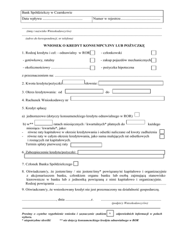 Bank Spółdzielczy w Czarnkowie Data wpływu ........................................... Numer w rejestrze........................................... ....................................................................................................................................................... (imię i nazwisko Wnioskodawcy/ów) ....................................................................................................................................................... (adres do korespondencji, nr telefonu) WNIOSEK O KREDYT KONSUMPCYJNY LUB POŻYCZKĘ 1. Rodzaj kredytu i cel: - odnawialny w ROR - członkowski - gotówkowy, ratalny - zakup pojazdów mechanicznych - okolicznościowy .......................................... - pożyczka hipoteczna z przeznaczeniem na: ................................................................................................................... 2. Kwota kredytu/pożyczki słownie: 3. Okres kredytowania: od do 4. Rachunek Wnioskodawcy nr 5. Kredyt spłacę: a) jednorazowo (dotyczy konsumenckiego kredytu odnawialnego w ROR) b) w** ratach miesięcznych / kwartalnych* płatnych do każdego miesiąca / kwartału*, jako: - równe raty kapitałowe w okresie kredytowania i odsetki naliczane od kwoty zadłużenia - równe raty w całym okresie kredytowania, jako suma malejących rat odsetkowych i rosnących rat kapitałowych. Termin spłaty pierwszej raty 6. Zabezpieczenie kredytu/pożyczki: 7. Członek Banku Spółdzielczego 8. Oświadczam/y, że jestem/śmy / nie jestem/śmy* powiązany/ni kapitałowo i organizacyjnie z akcjonariuszem banku, członkiem organu banku lub osobą zajmującą stanowisko kierownicze w banku lub z jednostką powiązaną z nimi kapitałowo i organizacyjnie. Rodzaj powiązania ........................................................................................................................ 9. Oświadczam/y, że wnioskowany kredyt nie jest przeznaczony na działalność gospodarczą. ....................................., dnia ............................r. ................................................................. (podpis/y Wnioskodawcy/ów) Prosimy o czytelne wypełnienie wniosku i zaznaczenie znakiem x odpowiednich informacji w polach wyboru. * niepotrzebne skreślić ** nie dotyczy konsumenckiego kredytu odnawialnego w ROR I N F O R M A C J E D O T Y C Z Ą C E W N I O S K O D A W C Y / Ó W: TREŚĆ WNIOSKODAWCA W S P Ó Ł M A Ł Ż O N E K pozostający/ nie pozostający* we wspólności majątkowej LUB WSPÓŁPOSIADACZ ROR Imię i nazwisko, nazwisko panieńskie, imię ojca Data i miejsce urodzenia PESEL Stan cywilny Seria i numer dowodu tożsamości i przez kogo wydany Miejsce zamieszkania – adres z kodem, nr telefonu, nr telefonu komórkowego Posiadany majątek trwały (rodzaj, wartość) Numer rachunku oszczędnościowo- rozliczeniowego, nazwa banku prowadzącego i rok otwarcia Miejsce pracy – nazwa i adres pracodawcy, nr telefonu oraz okres pracy i stanowisko Dochód netto roczny z roku ubiegłego Średni miesięczny dochód netto z ostatnich 3 miesięcy Zobowiązania wobec banków i innych podmiotów oraz innych z tytułu kredytów, pożyczek, poręczeń itp. – kwota zobowiązania, ostateczny termin spłaty i wysokość obciążenia miesięcznego Stałe obciążenia dochodu z tytułu wyroków sądowych, świadczeń alimentacyjnych – wysokość obciążenia miesięcznego i ostateczny termin spłaty Zobowiązania podatkowe – zaległe /kwota/ i bieżące/wysokość zobowiązania miesięcznego/ Przeciętne wydatki miesięczne z tytułu czynszu, opłat za energię, telefon itp. Liczba osób na utrzymaniu Czy ubiega się o kredyt lub pożyczkę w innym banku Niniejszym wyrażam zgodę na przetwarzanie przez Bank Spółdzielczy w Czarnkowie, moich danych osobowych dla celów ( na potrzeby ) marketingowych, promocyjnych i statystycznych zgodnie z Ustawą z dnia 29 sierpnia 1997r. o ochronie danych osobowych (Dz.U. 2002 r. Nr 101, poz. 926 z póź. zmianami), Zgoda ta obejmuje również przetwarzanie moich danych osobowych w przyszłości, jeżeli nie zmieni się cel przetwarzania. Oświadczam/y pod rygorem odpowiedzialności przewidzianej w art.297 Kodeksu karnego (DZ. U 1997 r. Nr 88, poz. 553), że informacje podane w tym wniosku są zgodne ze stanem faktycznym. ......................................., dnia ................................ r. ................................................... (podpis/y Wnioskodawcy/ów) Wyrażam zgodę na zaciągnięcie powyższego kredytu/pożyczki .............................................................. (podpis Współmałżonka) UWAGI . UPOWAŻNIENIE Imię i nazwisko ........................................................................................................................... Adres zamieszkania .................................................................................................................... Adres zameldowania ................................................................................................................... Nr dowodu i Nr PESEL ............................................................................................................... Na podstawie art.15 ust. 1 i art. 47 ust. 2 ustawy z dnia 14 lutego 2003r. o udostępnieniu informacji gospodarczych (Dz. U. Nr 50, poz. 424) upoważniam Gospodarczy Bank Wielkopolski S.A. z siedziba w Poznaniu / ...................... Bank Spółdzielczy w ......................* do wystąpienia za pośrednictwem Biura Informacji Kredytowej S.A. z siedzibą w Warszawie – Biura Obsługi Klienta przy ul. Pruszkowskiej 17 do biur informacji gospodarczej o ujawnienie informacji gospodarczych dotyczących moich zobowiązań. ............................................................. miejscowość, data ................................................................. czytelny podpis Wnioskodawcy/Poręczyciela* Na podstawie art.. 105 ust. 4 d) Ustawy z dnia 29.08.1997
