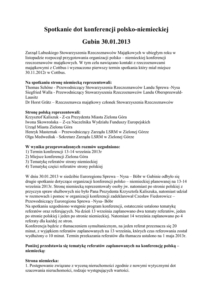 Spotkanie dot konferencji polsko-niemieckiej Gubin 30.01.2013 Zarząd Lubuskiego Stowarzyszenia Rzeczoznawców Majątkowych w ubiegłym roku w listopadzie rozpoczął przygotowania organizacji polsko – niemieckiej konferencji rzeczoznawców majątkowych. W tym celu nawiązano kontakt z rzeczoznawcami majątkowymi z Cottbus i wyznaczono pierwszy termin spotkania który miał miejsce 30.11.2012r w Cottbus. Na spotkaniu stronę niemiecką reprezentowali: Thomas Schöne - Przewodniczący Stowarzyszenia Rzeczoznawców Landu Sprewa -Nysa Siegfried Walla - Przewodniczący Stowarzyszenia Rzeczoznawców Landu OberspreewaldLausitz Dr Horst Grätz – Rzeczoznawca majątkowy członek Stowarzyszenia Rzeczoznawców Stronę polską reprezentowali: Krzysztof Kaliszuk - Z-ca Prezydenta Miasta Zielona Góra Iwona Skowrońska – Z-ca Naczelnika Wydziału Funduszy Europejskich Urząd Miasta Zielona Góra Henryk Masternak – Przewodniczący Zarządu LSRM w Zielonej Górze Olga Medwediuk - Sekretarz Zarządu LSRM w Zielonej Górze W wyniku przeprowadzonych rozmów uzgodniono: 1) Termin konferencji 13-14 września 2013r 2) Miejsce konferencji Zielona Góra 3) Tematykę referatów strony niemieckiej 4) Tematykę części referatów strony polskiej W dniu 30.01.2013 w siedzibie Euroregionu Sprewa – Nysa – Bóbr w Gubinie odbyło się drugie spotkanie dotyczące organizacji konferencji polsko – niemieckiej planowanej na 13-14 września 2013r. Stronę niemiecką reprezentowały osoby jw. natomiast po stronie polskiej z przyczyn spraw służbowych nie było Pana Prezydenta Krzysztofa Kaliszuka, natomiast udział w rozmowach i pomoc w organizacji konferencji zadeklarował Czesław Fiedorowicz – Przewodniczący Euroregionu Sprewa –Nysa- Bóbr Na spotkaniu uzgodniono wstępnie program konferencji, ostatecznie ustalono tematykę referatów oraz referujących. Na dzień 13 września zaplanowano dwa tematy referatów, jeden po stronie polskiej i jeden po stronie niemieckiej. Natomiast 14 września zaplanowano po 4 referaty dla każdej ze stron. Konferencja będzie z tłumaczeniem symultanicznym, na jeden referat przeznacza się 20 minut, z wyjątkiem referatów zaplanowanych na 13 września, których czas referowania został wydłużony o 10 minut. Termin przekazania referatów dla tłumacza ustalono na 1 maja 2013r. Poniżej przedstawia się tematykę referatów zaplanowanych na konferencję polską – niemiecką: Strona niemiecka: 1. Postępowanie związane z wyceną nieruchomości zgodnie z nowymi wytycznymi dot szacowania nieruchomości, rodzaje występujących wartości. 2. Przejrzystość rynku nieruchomości w Niemczech (Portale – online, sprawozdania z rynku). 3. Przykłady odszkodowań za zajęcia terenów pod drogi. 4. Podatki i opłaty za nieruchomości w Niemczech. 5. Szacowanie gruntów na potrzeby władz finansowych. Strona polska: 1. Struktura organizacyjna rzeczoznawstwa majątkowego w Polsce, źródła informacji dostępne dla rzeczoznawców, standardy zawodowe, specjalizacje w zakresie rzeczoznawstwa majątkowego. 2. Szacowanie gruntów rolnych dla różnych celów. Ustalanie podatków na rzecz władz skarbowych od gruntów rolnych. 3. Pozyskiwanie i szacowanie gruntów dla potrzeb budowy dróg. 4. Wycena gruntów z występującymi w podłożu kopalinami. 5. Służebność przesyłu, odszkodowania, bezumowne korzystanie w związku z budową urządzeń infrastruktury technicznej. W ciągu dwóch tygodni strona polska zobligowała się do przesłania programu konferencji stronie niemieckiej. Na tym spotkanie zakończono. Sekretarz LSRM w Zielonej Górze Olga Medwediuk