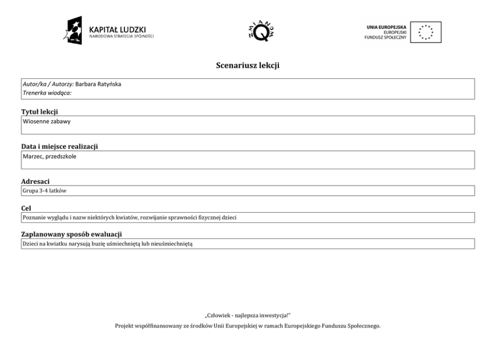 Scenariusz lekcji Autor/ka / Autorzy: Barbara Ratyńska Trenerka wiodąca: Tytuł lekcji Wiosenne zabawy Data i miejsce realizacji Marzec, przedszkole Adresaci Grupa 3-4 latków Cel Poznanie wyglądu i nazw niektórych kwiatów, rozwijanie sprawności fizycznej dzieci Zaplanowany sposób ewaluacji Dzieci na kwiatku narysują buzię uśmiechniętą lub nieuśmiechniętą „Człowiek - najlepsza inwestycja!” Projekt współfinansowany ze środków Unii Europejskiej w ramach Europejskiego Funduszu Społecznego. Scenariusz ramowy Nazwa ćwiczenia i jego krótki opis 1. Zabawa integracyjna „Mam na imię…”. Dziecko mówi jak ma na imię, co dostało i od kogo, wymienia coś co lubi i kojarzy mu się z wiosną i komu przekazuje otrzymaną rzecz np. obrazek krokusa. 2. Zabawa z rymowanką „W marcu jak w garncu, od wielu lat, to świeci słońce, to deszcze, to wiatr”. Wymawianie tekstu cicho, głośno, szybko, powoli, wyklaskiwanie, wytrzepywanie, wytańczony chód do przodu i tyłu, wystukiwanie klockami, itp. 3. „Wiosenne porządki” – zabawa przy muzyce. W przerwie muzyki dzieci wykonują różne czynności w różnym tempie podawanym przez nauczyciela, np. mycie okien, zagrabianie ogródka, sadzenie kwiatów, wywożenie śmieci taczką, itp. 4. Zabawa logarytmiczna do fragmentu wiersza „Roczek” Cz. Janczarskiego. Dzieci rytmicznie wypowiadają tekst cicho i głośno, grubo, cienko, wykonując przy tym ruchy ilustracyjne za nauczycielem 5. Wiosenne zagadki. Dzieci siedzą na dywanie, w kole obrazki wiosennych kwiatów. Nauczyciel mówi zagadkę lub opisuje kwiatek, a dzieci odgadują, o którym obrazku jest mowa. Przypominają lub pokazują nazwę kwiatka i wieszają na tablicy. Czas Materiały 5-8 min Obrazek krokusa lub tematyce wiosennej 5 min Tekst, rymowanki, klocki inny o 5 min 5 min Tekst wiersza „Roczek” – fragment o wiośnie 5 min Zagadki, ilustracje kwiatów lub inne Szczegółowe materiały dla nauczyciela/nauczycielki Pomoce dydaktyczne wykorzystane podczas zajęć, w wersji elektronicznej. „Człowiek - najlepsza inwestycja!” Projekt współfinansowany ze środków Unii Europejskiej w ramach Europejskiego Funduszu Społecznego.