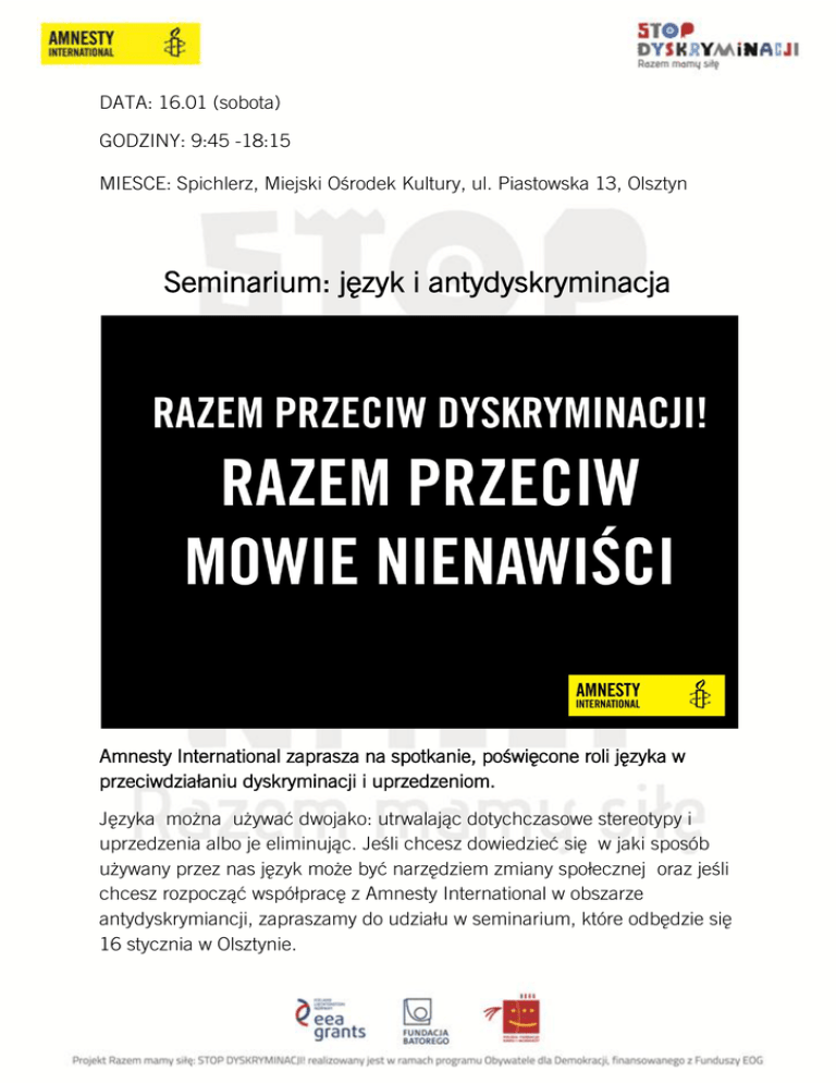 DATA: 16.01 (sobota) GODZINY: 9:45 -18:15 MIESCE: Spichlerz, Miejski Ośrodek Kultury, ul. Piastowska 13, Olsztyn Seminarium: język i antydyskryminacja Amnesty International zaprasza na spotkanie, poświęcone roli języka w przeciwdziałaniu dyskryminacji i uprzedzeniom. Języka można używać dwojako: utrwalając dotychczasowe stereotypy i uprzedzenia albo je eliminując. Jeśli chcesz dowiedzieć się w jaki sposób używany przez nas język może być narzędziem zmiany społecznej oraz jeśli chcesz rozpocząć współpracę z Amnesty International w obszarze antydyskrymiancji, zapraszamy do udziału w seminarium, które odbędzie się 16 stycznia w Olsztynie. W czasie spotkania zastanowimy się w jaki sposób identyfikować zachowania i problemy dyskryminacyjne, przyjrzymy się mediom jako narzędziu zmian, oraz nad tym w jaki sposób pracować z osobami, które doświadczyły dyskryminacji. Chcemy aby aktywiści i aktywistki NGO, dziennikarze i dziennikarki, a także blogerzy i blogerki działali razem, zrozumieli przyczyny dyskryminacji oraz zmobilizowali swoje lokalne społeczności do przeciwstawienia się jej. Dlatego zapraszamy wszystkie zainteresowane osoby na spotkanie będące częścią projektu edukacyjnego „Razem mamy siłę: STOP DYSKRYMIANCJI!” REKRUTACJA: Aby wziąć udział w seminarium należy wypełnić formularz zgłoszeniowy, który znajduje się pod linkiem: https://www.surveymonkey.com/r/3QHSPJ2 Zgłoszenie należy przesłać do dnia 11 stycznia W razie pytań prosimy o kontakt pod adresem mailowym: [email protected] Projekt „Razem mamy siłę: Stop dyskryminacji!” realizowany jest w ramach programu Obywatele dla Demokracji, finansowanego z Funduszy EOG