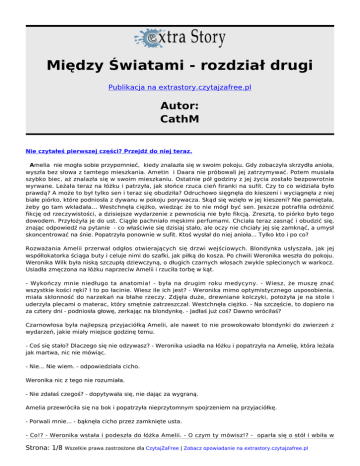 Między Światami - rozdział drugi Publikacja na extrastory.czytajzafree.pl Autor: CathM Nie czytałeś pierwszej części? Przejdź do niej teraz. Amelia nie mogła sobie przypomnieć, kiedy znalazła się w swoim pokoju. Gdy zobaczyła skrzydła anioła, wyszła bez słowa z tamtego mieszkania. Ametin i Daara nie próbowali jej zatrzymywać. Potem musiała szybko biec, aż znalazła się w swoim mieszkaniu. Ostatnie pół godziny z jej życia zostało bezpowrotnie wyrwane. Leżała teraz na łóżku i patrzyła, jak słońce rzuca cień firanki na sufit. Czy to co widziała było prawdą? A może to był tylko sen i teraz się obudziła? Odruchowo sięgnęła do kieszeni i wyciągnęła z niej białe piórko, które podniosła z dywanu w pokoju porywacza. Skąd się wzięło w jej kieszeni? Nie pamiętała, żeby go tam wkładała... Westchnęła ciężko, wiedząc że to nie mógł być sen. Jeszcze potrafiła odróżnić fikcję od rzeczywistości, a dzisiejsze wydarzenie z pewnością nie było fikcją. Zresztą, to piórko było tego dowodem. Przyłożyła je do ust. Ciągle pachniało męskimi perfumami. Chciała teraz zasnąć i obudzić się, znając odpowiedź na pytanie - co właściwie się dzisiaj stało, ale oczy nie chciały jej się zamknąć, a umysł skoncentrować na śnie. Popatrzyła ponownie w sufit. Ktoś wysłał do niej anioła... Tylko kto i po co? Rozważania Amelii przerwał odgłos otwierających się drzwi wejściowych. Blondynka usłyszała, jak jej współlokatorka ściąga buty i celuje nimi do szafki, jak piłką do kosza. Po chwili Weronika weszła do pokoju. Weronika Wilk była niską szczupłą dziewczyną, o długich czarnych włosach zwykle splecionych w warkocz. Usiadła zmęczona na łóżku naprzeciw Amelii i rzuciła torbę w kąt. - Wykończy mnie niedługo ta anatomia! - była na drugim roku medycyny. - Wiesz, że muszę znać wszystkie kości ręki? I to po łacinie. Wiesz ile ich jest? - Weronika mimo optymistycznego usposobienia, miała skłonność do narzekań na błahe rzeczy. Zdjęła duże, drewniane kolczyki, położyła je na stole i uderzyła plecami o materac, który smętnie zatrzeszczał. Westchnęła ciężko. - Na szczęście, to dopiero na za cztery dni - podniosła głowę, zerkając na blondynkę. - Jadłaś już coś? Dawno wróciłaś? Czarnowłosa była najlepszą przyjaciółką Amelii, ale nawet to nie prowokowało blondynki do zwierzeń z wydarzeń, jakie miały miejsce godzinę temu. - Coś się stało? Dlaczego się nie odzywasz? - Weronika usiadła na łóżku i popatrzyła na Amelię, która leżała jak martwa, nic nie mówiąc. - Nie... Nie wiem. - odpowiedziała cicho. Weronika nic z tego nie rozumiała. - Nie zdałaś czegoś? - dopytywała się, nie dając za wygraną. Amelia przewróciła się na bok i popatrzyła nieprzytomnym spojrzeniem na przyjaciółkę. - Porwali mnie... - bąknęła cicho przez zamknięte usta. - Co!? - Weronika wstała i podeszła do łóżka Amelii. - O czym ty mówisz!? - oparła się o stół i wbiła w Strona: 1/8 Wszelkie prawa zastrzeżone dla CzytajZaFree | Zobacz opowiadanie na extrastory.czytajzafree.pl blondynkę wzrok, oczekując jasnej odpowiedzi. Amelia usiadła i niepewnie popatrzyła na współlokatorkę. Wiedziała, że Weronika zawsze ją wysłucha i nie będzie jej wyśmiewać. Jednakże zależało jej na tym, żeby przyjaciółka jej uwierzyła, a o to mogło być trudno. Zresztą do niej samej jeszcze nie do końca docierało to co się stało, więc jak mogła tego wymagać od Weroniki? - Obiecaj, że nie będziesz się śmiać - poprosiła. - To co powiem to prawda, choć mnie też trudno w to uwierzyć... - No dobra. Obiecuję. Przecież wiesz, że nigdy się z ciebie nie śmieję - odpowiedziała ze zniecierpliwieniem. Weronika już nie raz wysłuchiwała od Amelii historii o dziwacznych ludziach, których mijała na ulicy. Nie brała tych opowieści na poważnie, mimo że Amelia opowiadała te historie z dużą powagą na twarzy. Wzięła ciastko z talerzyka, leżącego na stoliku i usiadła na łóżku czekając na zwierzenia blondynki. Amelia kiwnęła głową. Musiała komuś się zwierzyć, bo myśli nie dawały jej spokoju. Zaryzykowała i opowiedziała ze szczegółami historię, cały czas uważnie obserwując reakcję Weroniki. Szatynka przełknęła powoli ciastko, które mieliła w ustach od czasu gdy usłyszała o skrzydłach anioła. Nie wiedziała co ma myśleć o absurdalnej opowieści, którą przed chwilą usłyszała. Widziała przejęcie na twarzy Amelii, która nie był w nastroju do opowiadania bajek. Blondynka zacisnęła zęby i popatrzyła z nadzieją na przyjaciółkę. - Wierzysz mi? - zapytała ściszonym głosem. Weronika westchnęła. Znalazła na półce pomiędzy książkami w miarę czystą szklankę i nalała sobie do niej soku pomarańczowego. Zastanawiała się co właściwie ma odpowiedzieć. - Trudno w to uwierzyć.. Rozumiesz? - odparła dyplomatycznie. Amelia spodziewała się takiej odpowiedzi, bo była ona oczywista. Weronika, mówiąc, że wierzy Amelii skłamałaby. W tą opowieść nie dało się ot tak uwierzyć. Weronika była osobą racjonalną i mówiącą wprost to co myśli. Nie byłoby w jej stylu, zapewnić Amelię, że to co mówi jest dla niej wiarygodne. - Wiem, ale to prawda! - blondynka broniła tego, czego była pewna. - Ja też nie wierzyłam dopóki nie zobaczyłam skrzydeł… To wariactwo, wiem.. - zacisnęła ręce na kolanach. Weronika widziała zmartwienie przyjaciółki, ale znalazła się w sytuacji, w której musiała dobrze wyważyć każde słowo. Odstawiła szklankę po soku na stół i usiadła obok Amelii. - Najlepiej będzie jak zapomnisz o tym wydarzeniu - powiedziała, kładąc jej rękę na ramieniu. To nie było wcale takie proste. Amelia cały czas miała przed oczami obrazy z mieszkania na Grodzkiej. Widziała jednak, że dalsze przekonywanie Weroniki o autentyczności wydarzeń sp