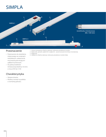 SIMPLA 3 1 1 SIMPLA 1 2 świetlówka miniaturowa 8W, 13W (G5) 2 4 2 2 SIMPLA 2 1 3 Przeznaczenie • Przeznaczone do oświetlania miejscowego we wnętrzach mieszkalnych, zwłaszcza do mocowania pod wiszącymi szafkami kuchennymi. • Do jednej świetlówki miniaturowej (średnica 16 mm) o mocy 8 W lub 13 W. Charakterystyka • Oprawa otwarta. • Możliwy montaż na podłożu o normalnej palności. 224 1. 2. 3. 4. Listwa montażowa z blachy stalowej, malowana proszkowo na kolor. Statecznik, oprawki, zapłonnik i wyłącznik – przymocowane do listwy montażowej. Wyłącznik. Odbłyśnik z blachy stalowej, malowany proszkowo na kolor biały. Oświetlenie profesjonalne • oprawy wnętrzowe mieszkaniowe Nr art. Index Źródło świadła Typ Moc źródła światła Wykonanie Statecznik listwa montażowa z blachy stalowej magnetyczny, bez kompensacji mocy biernej Klasa Trzonek ochronności lampy Sprawność świetlna [%] SIMPLA 1 Oprawa oświetlenia miejscowego, otwarta, z wyłącznikiem 1955 EM-WO0002-09 K-600 1956 EM-WO0002-10 K-800 świetlówka miniaturowa 1 x 8W 1 x 13W II II G5 72,3 78,2 SIMPLA 2 Oprawa oświetlenia miejscowego, otwarta, z wyłącznikiem 1957 EM-WO0002-11 SIMPLA 1 135° 150° K-600 165° 180° 165° 150° 135° SIMPLA 1 135° 150° 160 K-800 165° 180° 200 165° 150° 135° 160 120 120° świetlówka miniaturowa S-800 120° 120° 105° 105° II G5 55,2 S-800 105° 105° 90° 90° 75° 80 105° SIMPLA 2 magnetyczny bez kompensacji mocy biernej 120° 120 80 listwa montażowa i odbłyśnik z blachy stalowej 1 x 13 W 75° 105° 80 60° 90° 90° 90° 90° 75° 75° 75° 75° 60° 60° 60° 60° 45° 45° 60° 120 160 45° 45° 200 240 45° 30° 15° C0 – C180 • • • • • • 0° 15° 30° C90 – C270 30° 15° C0 – C180 0° 15° 30° C90 – C270 45° 30° 15° C0 – C180 0° 15° 30° C90 – C270 Listwa montażowa z blachy stalowej malowana na biało farbą proszkową. Osprzęt elektryczny zamocowany na listwie montażowej. Przewód przyłączeniowy jednostronnie odłączalny. Oprawa z wyłącznikiem. Statecznik magnetyczny bez kompensacji mocy biernej. Do przymocowania oprawy przewidziano dwa otwory o średnicy 4,2 mm o rozstawie 239 mm (typ K-600) lub 468 mm (typy K-800 i S-800). SIMPLA 1 SIMPLA 2 www.elgo-li.pl 225