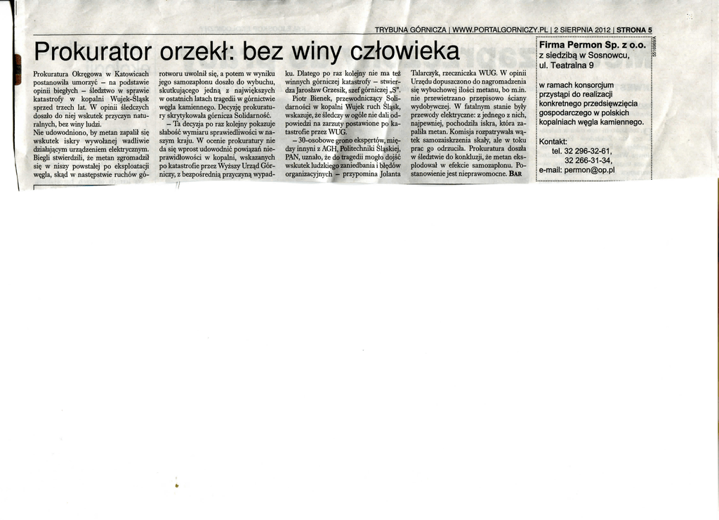 TRYBUNA G6RNICZA | WWW.PORTALGORNICZY.PL | 2 SIERPNIA 2012 | STRONA 5 Prokurator orzekt: bez winy cztowieka Prokuratura Okr^gowa w Katowicach postanowila umorzyc - na podstawie opinii biegfych - sledztwo w sprawie katastrofy w kopalni Wujek-Sla_sk sprzed trzech lat. W opinii sledczych doszlo do niej wskutek przyczyn naturalnych, bez winy ludzi. Nie udowodniono, by metan zapalil si? wskutek iskry wywolanej wadliwie dzialaja,cym urzadzeniem elektrycznym. Biegli stwierdzili, ze metan zgromadzil si? w niszy powstafej po eksploatacji w^gla, skad w nastepstwie ruchow go- rotworu uwolni} si?, a potem w wyniku jego samozaplonu doszio do wybuchu, skutkujacego jedna, z najwiekszych w ostatnich latach tragedii w gornictwie wegla kamiennego. Decyzj? prokuratury skrytykowala gornicza Solidarnosc. - Ta decyzja po raz kolejny pokazuje slabosc wymiaru sprawiedliwosci w naszym kraju. W ocenie prokuratury nie da si$ wprost udowodnic powi^zan nieprawidlowosci w kopalni, wskazanych po katastrofie przez Wyzszy Urz^d Gorniczy, z bezposredni^ przyczyn^ wypad- ku. Dlatego po raz kolejny nie ma tez winnych gorniczej katastrofy - stwierdzaJaroslawGrzesik, szef gorniczej ,,S". Piotr Bienek, przewodnicz^cy Solidarnosci w kopalni Wujek ruch Sla.sk, wskazuje, ze sledczy w ogole nie dali odpowiedzi na zarzuty postawione po katastrofie przez WUG. - 30-osobowe grono ekspertow, mi?dzy innyni z AGH, Politechniki Sl^skiej, PAN, uznalo, ze do tragedii moglo dojsc wskutek ludzkiego zaniedbania i bledow organizacyjnych - przypomina Jolanta Talarczyk, rzeczniczka WUG. W opinii Urzedu dopuszczono do nagromadzenia si§ wybuchowej ilosci metanu, bo m.in. nie przewietrzano przepisowo sciany wydobywczej. W fatalnym stanie byfy przewody elektryczne: z jednego z nich, najpewniej, pochodzila iskra, ktora zapalila metan. Komisja rozpatrywala w^tek samozaiskrzenia skaiy, ale w toku prac go odrzucila. Prokuratura doszla w sledztwie do konkluzji, ze metan eksplodowa} w efekcie samozaplonu. Postanowienie jest nieprawomocne. BAR | Firma Permon Sp. z o.o. I z siedzibq w Sosnowcu, i ul. Teatralna 9 j w ramach konsorcjum I przystapi do realizacji i konkretnego przedsi^wzif cia i gospodarczego w polskich i kopalniach w^gla kamiennego. I Kontakt: j tel. 32 296-32-61, I 32266-31-34, i e-mail: [email protected]