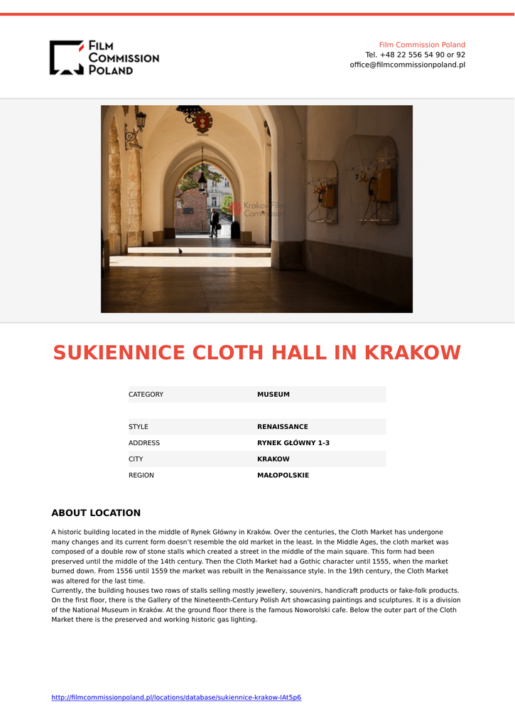 Film Commission Poland Tel. +48 22 556 54 90 or 92 office@filmcommissionpoland.pl SUKIENNICE CLOTH HALL IN KRAKOW CATEGORY MUSEUM STYLE RENAISSANCE ADDRESS RYNEK GŁÓWNY 1-3 CITY KRAKOW REGION MAŁOPOLSKIE ABOUT LOCATION A historic building located in the middle of Rynek Główny in Kraków. Over the centuries, the Cloth Market has undergone many changes and its current form doesn’t resemble the old market in the least. In the Middle Ages, the cloth market was composed of a double row of stone stalls which created a street in the middle of the main square. This form had been preserved until the middle of the 14th century. Then the Cloth Market had a Gothic character until 1555, when the market burned down. From 1556 until 1559 the market was rebuilt in the Renaissance style. In the 19th century, the Cloth Market was altered for the last time. Currently, the building houses two rows of stalls selling mostly jewellery, souvenirs, handicraft products or fake-folk products. On the first floor, there is the Gallery of the Nineteenth-Century Polish Art showcasing paintings and sculptures. It is a division of the National Museum in Kraków. At the ground floor there is the famous Noworolski cafe. Below the outer part of the Cloth Market there is the preserved and working historic gas lighting. http://filmcommissionpoland.pl/locations/database/sukiennice-krakow-IAt5p6