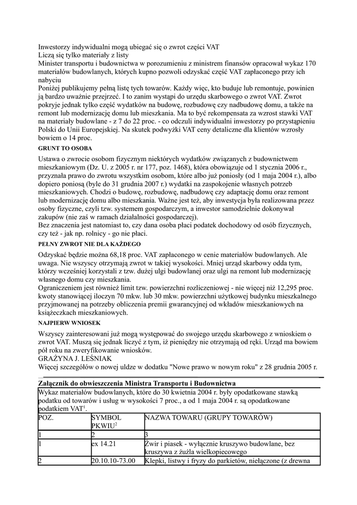 Inwestorzy indywidualni mogą ubiegać się o zwrot części VAT Liczą się tylko materiały z listy Minister transportu i budownictwa w porozumieniu z ministrem finansów opracował wykaz 170 materiałów budowlanych, których kupno pozwoli odzyskać część VAT zapłaconego przy ich nabyciu Poniżej publikujemy pełną listę tych towarów. Każdy więc, kto buduje lub remontuje, powinien ją bardzo uważnie przejrzeć. I to zanim wystąpi do urzędu skarbowego o zwrot VAT. Zwrot pokryje jednak tylko część wydatków na budowę, rozbudowę czy nadbudowę domu, a także na remont lub modernizację domu lub mieszkania. Ma to być rekompensata za wzrost stawki VAT na materiały budowlane - z 7 do 22 proc. - co odczuli indywidualni inwestorzy po przystąpieniu Polski do Unii Europejskiej. Na skutek podwyżki VAT ceny detaliczne dla klientów wzrosły bowiem o 14 proc. GRUNT TO OSOBA Ustawa o zwrocie osobom fizycznym niektórych wydatków związanych z budownictwem mieszkaniowym (Dz. U. z 2005 r. nr 177, poz. 1468), która obowiązuje od 1 stycznia 2006 r., przyznała prawo do zwrotu wszystkim osobom, które albo już poniosły (od 1 maja 2004 r.), albo dopiero poniosą (byle do 31 grudnia 2007 r.) wydatki na zaspokojenie własnych potrzeb mieszkaniowych. Chodzi o budowę, rozbudowę, nadbudowę czy adaptację domu oraz remont lub modernizację domu albo mieszkania. Ważne jest też, aby inwestycja była realizowana przez osoby fizyczne, czyli tzw. systemem gospodarczym, a inwestor samodzielnie dokonywał zakupów (nie zaś w ramach działalności gospodarczej). Bez znaczenia jest natomiast to, czy dana osoba płaci podatek dochodowy od osób fizycznych, czy też - jak np. rolnicy - go nie płaci. PEŁNY ZWROT NIE DLA KAŻDEGO Odzyskać będzie można 68,18 proc. VAT zapłaconego w cenie materiałów budowlanych. Ale uwaga. Nie wszyscy otrzymają zwrot w takiej wysokości. Mniej urząd skarbowy odda tym, którzy wcześniej korzystali z tzw. dużej ulgi budowlanej oraz ulgi na remont lub modernizację własnego domu czy mieszkania. Ograniczeniem jest również limit tzw. powierzchni rozliczeniowej - nie więcej niż 12,295 proc. kwoty stanowiącej iloczyn 70 mkw. lub 30 mkw. powierzchni użytkowej budynku mieszkalnego przyjmowanej na potrzeby obliczenia premii gwarancyjnej od wkładów mieszkaniowych na książeczkach mieszkaniowych. NAJPIERW WNIOSEK Wszyscy zainteresowani już mogą występować do swojego urzędu skarbowego z wnioskiem o zwrot VAT. Muszą się jednak liczyć z tym, iż pieniędzy nie otrzymają od ręki. Urząd ma bowiem pół roku na zweryfikowanie wniosków. GRAŻYNA J. LEŚNIAK Więcej szczegółów o nowej uldze w dodatku "Nowe prawo w nowym roku" z 28 grudnia 2005 r. Załącznik do obwieszczenia Ministra Transportu i Budownictwa Wykaz materiałów budowlanych, które do 30 kwietnia 2004 r. były opodatkowane stawką podatku od towarów i usług w wysokości 7 proc., a od 1 maja 2004 r. są opodatkowane podatkiem VAT1. POZ. SYMBOL NAZWA TOWARU (GRUPY TOWARÓW) PKWIU2 1 2 3 1 ex 14.21 Żwir i piasek - wyłącznie kruszywo budowlane, bez kruszywa z żużla wielkopiecowego 2 20.10.10-73.00 Klepki, listwy i fryzy do parkietów, niełączone (z drewna 3 4 5 6 7 8 9 10 11 12 13 14 15 16 17 18 19 20 21 22 23 24 25 26 tropikalnego) 20.10.10-77.20 Listwy dębowe do parkietów 20.10.10-77.30 Deszczułki posadzkowe lite dębowe ex 20.10.10-78.1 Deszczułki posadzkowe lite z drewna liściastego, pozostałe ex 20.10.10-78.20 Listwy przyścienne z drewna liściastego, pozostałe 20.10.10-78.90 Klepki, listwy i fryzy na parkiet wykonane z drewna liściastego, pozostałe 20.10.21-10.1 Tarcica podłogowa strugana iglasta 20.10.21-10.20 Listwy przyścienne z drewna iglastego ex 20.10.21-10.30 Kostka brukowa z drewna iglastego - z wyłączeniem nasyconej ex 20.10.21-10.90 Drewno iglaste kształtowane w sposób ciągły (łącznie z klepkami i listwami na parkiet niepołączonymi), pozostałe z wyłączeniem nasyconego ex 20.10.21-53.20 Kostka brukowa z drewna liściastego - z wyłączeniem nasyconej ex 20.10.21-53.90 Drewno liściaste kształtowane w sposób ciągły (bez klepek, listew na parkiet), pozostałe - z wyłączeniem nasyconego 20.10.21-55.00 Klepki, listwy i fryzy na parkiet wykonane z drewna liściastego (obrobione) 20.30.11 Okna i drzwi, ościeżnice i progi drewniane 20.30.12-15.00 Płyty parkietowe z drewna, do podłóg mozaikowych 20.30.12-19 Płyty parkietowe z drewna, pozostałe 20.30.20-02.10 Budynki prefabrykowane mieszkalne i letnie z drewna i materiałów drewnopochodnych ex 21.24.11 Tapety papierowe i inne okładziny ścienne; papier transparentowy do okien - z wyłączeniem papieru transparentowego do okien 24.30.22-53.10 Kity szklarskie 24.30.22-53.20 Kity budowlane uszczelniające 24.30.22-60.00 Nieogniotrwałe preparaty powierzchniowe ex 24.62.10-70 Produkty odpowiednie do stosowania jako kleje lub spoiwa, przeznaczone do sprzedaży detalicznej, w opakowaniach o masie mniejszej lub równej 1 kg - wyłącznie kleje winylowe: na bazie polioctanu winylu, z pochodnych winylowych i z kopolimerów butadienu ex 24.62.10-80 Spoiwa na bazie kauczuku lub tworzyw sztucznych (łącznie ze sztucznymi żywicami) w opakowaniach przeznaczonych do sprzedaży detalicznej - wyłącznie kleje winylowe: na bazie polioctanu, winylu, z pochodnych winylowych i z kopolimerów butadienu ex 24.62.10-90 Gotowe kleje i inne gotowe spoiwa w opakowaniach o masie powyżej 1 kg przeznaczone do sprzedaży detalicznej, gdzie indziej niewymienione - wyłącznie kleje winylowe: na bazie polioctanu winylu, z pochodnych winylowych i z kopolimerów butadienu ex 25.21.2 Rury, przewody i węże oraz ich osprzęt z tworzyw sztucznych - z wyłączeniem węży i sztucznych jelit do kiełbas 27 28 29 30 31 32 33 34 35 36 37 38 39 40 41 42 43 44 45 46 47 ex 25.21.41-20.00 Komórkowe płyty, taśmy, folie z polimerów styrenu wyłącznie płyty z polistyrenu spienionego (styropianu) 25.21.41-50.20 Płyt