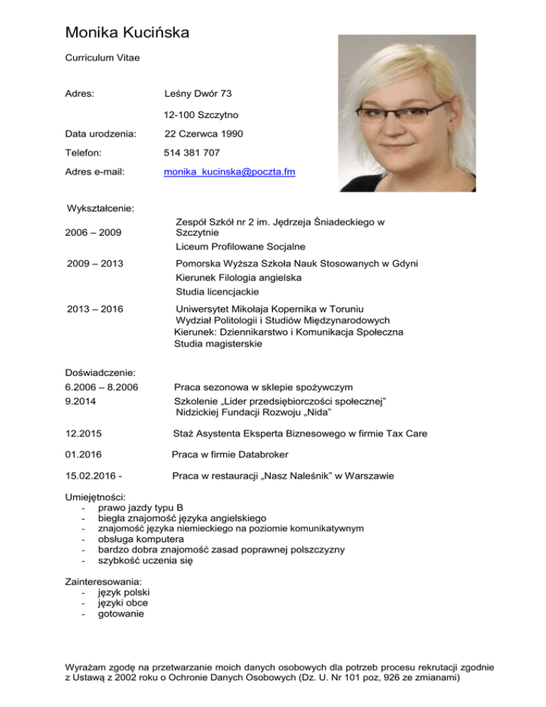 Monika Kucińska Curriculum Vitae Adres: Leśny Dwór 73 12-100 Szczytno Data urodzenia: 22 Czerwca 1990 Telefon: 514 381 707 Adres e-mail: [email protected] Wykształcenie: 2006 – 2009 Zespół Szkół nr 2 im. Jędrzeja Śniadeckiego w Szczytnie Liceum Profilowane Socjalne 2009 – 2013 Pomorska Wyższa Szkoła Nauk Stosowanych w Gdyni Kierunek Filologia angielska Studia licencjackie 2013 – 2016 Uniwersytet Mikołaja Kopernika w Toruniu Wydział Politologii i Studiów Międzynarodowych Kierunek: Dziennikarstwo i Komunikacja Społeczna Studia magisterskie Doświadczenie: 6.2006 – 8.2006 Praca sezonowa w sklepie spożywczym 9.2014 Szkolenie „Lider przedsiębiorczości społecznej” Nidzickiej Fundacji Rozwoju „Nida” 12.2015 Staż Asystenta Eksperta Biznesowego w firmie Tax Care 01.2016 Praca w firmie Databroker 15.02.2016 - Praca w restauracji „Nasz Naleśnik” w Warszawie Umiejętności: - prawo jazdy typu B - biegła znajomość języka angielskiego - znajomość języka niemieckiego na poziomie komunikatywnym - obsługa komputera - bardzo dobra znajomość zasad poprawnej polszczyzny - szybkość uczenia się Zainteresowania: - język polski - języki obce - gotowanie Wyrażam zgodę na przetwarzanie moich danych osobowych dla potrzeb procesu rekrutacji zgodnie z Ustawą z 2002 roku o Ochronie Danych Osobowych (Dz. U. Nr 101 poz, 926 ze zmianami)