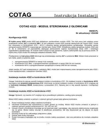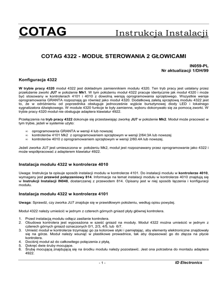 COTAG Instrukcja Instalacji COTAG 4322 - MODUŁ STEROWANIA 2 GŁOWICAMI IN059-PL Nr aktualizacji 1/DH/99 Konfiguracja 4322 W trybie pracy 4320 moduł 4322 jest dokładnym zamiennikiem modułu 4320. Ten tryb pracy jest ustalany przez przełożenie zworki JU7 w położenie Mk1. W tym położeniu moduł 4322 pracuje identycznie jak moduł 4320 i może być stosowany w kontrolerach 4101 i 4010 z dowolną wersją oprogramowania sprzętowego. Wszystkie wersje oprogramowania GRANTA rozpoznają go również jako moduł 4320. Dodatkową zaletą sprzętową modułu 4322 jest to, że w odróżnieniu od poprzednika obsługuje jednocześnie wyjście bursztynowej diody LED i lokalnego sygnalizatora dźwiękowego. W module 4320 funkcje te były zamienne, wyboru dokonywało się za pomocą zworki. W trybie pracy 4320 moduł nie obsługuje adaptera klawiatur 4922. Przełączenia na tryb pracy 4322 dokonuje się przestawiając zworkę JU7 w położenie Mk2. Moduł może pracować w tym trybie, jeżeli w systemie użyto: • • • oprogramowania GRANTA w wersji 4 lub nowszej kontrolerów 4101 Mk2 z oprogramowaniem sprzętowym w wersji 2/64:3A lub nowszej kontrolerów 4010 z oprogramowaniem sprzętowym w wersji 2/60.4A lub nowszej. Jeżeli zworka JU7 jest umieszczona w położeniu Mk2, moduł jest rozpoznawany przez oprogramowanie jako 4322 i może współpracować z adapterem klawiatur 4922. Instalacja modułu 4322 w kontrolerze 4010 Uwaga: Instrukcja ta opisuje sposób instalacji modułu w kontrolerze 4101. Do instalacji modułu w kontrolerze 4010, wymagany jest przewód połączeniowy 814. Informacje na temat instalacji modułu w kontrolerze 4010 znajdują się w Instrukcji Instalacji IN048, dostarczanej z przewodem 814. Opisany jest w niej sposób łączenia i konfiguracji modułu. Instalacja modułu 4322 w kontrolerze 4101 Uwaga: Sprawdź, czy zworka JU7 znajduje się w prawidłowym położeniu, według opisu powyżej. Moduł 4322 należy umieścić w jednym z czterech górnych gniazd płyty głównej kontrolera. 1. Przed instalacją modułu odłącz zasilanie kontrolera. 2. Obudowa kontrolera jest wyposażona w sześć gniazd na moduły. Moduł 4322 można umieścić w jednym z czterech górnych gniazd oznaczonych 0/1, 2/3, 4/5, lub 6/7. 3. Umieść moduł w kontrolerze trzymając go za kolorowe styki i pamiętając, aby elementy elektroniczne znajdowały się na górze. Moduł należy wsunąć w plastikowe prowadnice, tak aby dopasować go do złącza na płycie kontrolera. 4. Dociśnij moduł aż do całkowitego połączenia z płytą. 5. Dokręć dwie śruby mocujące. 6. Śrubę mocującą znajdującą się na środku modułu należy pozostawić. Jest ona potrzebna do montażu adaptera 4922. -1- ID Electronics Podłączanie modułu 4322 Wszystkich podłączeń do modułu dokonuje się przez złącza umieszczone z przodu płytki. Na czas przykręcania przewodów można je rozłączyć. Rozłączenie wszystkich złączy pozwala, w razie potrzeby, na wyjęcie całego modułu bez odkręcania jakichkolwiek przewodów. Przy podłączaniu urządzeń przy drzwiach należy użyć przewodów, które posiadają wystarczającą ilość skrętek (żył) dla głowicy (pętla Tx i Rx i diody LED) zamka, sygnalizatora, czujnika drzwiowego i przycisku wyjścia. Zewnętrzne ekrany przewodów należy podłączyć do obudowy kontrolera, natomiast indywidualne ekrany każdej pary (żyły) podłączyć do styku przewidzianego w module (Scr). Jeżeli przewód posiada tylko wspólny dla wszystkich przewodów ekran, należy go podłączyć wewnątrz kontrolera do najbliższej masy. Pomiędzy tym miejscem a stykiem modułu powinny przebiegać przewody bez ekranu. W poniższej tabeli zestawiono podłączenia modułu: Moduł Funkcja Tx Tx Scr pętla nadawcza pętla nadawcza Jeżeli w używanym przewodzie każda para jest ekranowana, do tego styku należy podłączyć ekrany pętli Tx i Rx pętla odbiorcza pętla odbiorcza katoda czerwonej diody LED (-) katoda pomarańczowej diody LED (-) katoda zielonej diody LED (-) wspólna anoda diod LED (+) oraz + lokalnego sygnalizatora w głowicy 280 zasilanie lokalnego sygnalizatora w głowicy 280 Rx Rx R A G VA !" Informacje na temat podłączania różnych rodzajów głowic są umieszczone w Instrukcji Instalacji Kontrolera 4101 – HB02/57 Uwaga: Jeżeli do instalowanego modułu podłączana będzie głowica 280 Mk1, nie posiadająca regulacji zasięgu (model ten był stosowany w Polsce tylko przed 1995r), w pętlę nadawczą Tx należy wpiąć szeregowo rezystor 70Ω/1W. Zapobiegnie to zniszczeniu głowicy przez zbyt wysoki dla niej poziom sygnału modułu 4322. -2- ID Electronics Lokalny sygnalizator ostrzegawczy System można skonfigurować tak, aby podczas forsowania lub niezamknięcia drzwi włączał sygnał ostrzegawczy. Do wyjścia ostrzegawczego należy podłączyć sygnalizator i umieścić go obok drzwi. Małe sygnalizatory o poborze prądu poniżej 10mA, takie jak np. w montowany fabrycznie w głowicy 280, można zasilić bezpośrednio ze styku VA. Drugim sposobem jest podłączenie sygnalizatora pomiędzy styk wyjścia !", a + napięcia 12 V, dostarczonego bezpośrednio z zasilacza. Wyjście sterujące !" jest typu otwarty kolektor i można do niego podłączyć sygnalizator o poborze prądu maksymalnie 250mA przy 12V DC. Aby podłączyć sygnalizator pobierający większy prąd, za pomocą tego wyjścia należy wysterować dodatkowy przekaźnik, a nim dopiero sygnalizator. Moduł Funkcja !" VA wyjście sygnalizatora – 0V podczas aktywności +12V Przekaźniki (do sterowania zamkiem) Każdy z przekaźników posiada trzy końcówki: Com (wspólny), NO (styk normalnie otwarty) i NC (styk normalnie zamknięty). Przekaźniki są elektrycznie odizolowane od siebie oraz od pozostałych elementów. Każdy przekaźnik może sterować maksymalnie prądem 2A przy napięciu 30V AC lub DC. Moduł Funkcja NC Com NO styk normalnie zwarty (z Com) wspólny styk normalnie otwarty U
