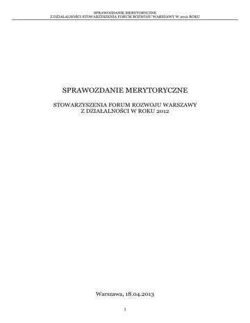 SPRAWOZDANIE MERYTORYCZNE Z DZIAŁALNOŚCI STOWARZYSZENIA FORUM ROZWOJU WARSZAWY W 2012 ROKU SPRAWOZDANIE MERYTORYCZNE STOWARZYSZENIA FORUM ROZWOJU WARSZAWY Z DZIAŁALNOŚCI W ROKU 2012 Warszawa, 18.04.2013 1 SPRAWOZDANIE MERYTORYCZNE Z DZIAŁALNOŚCI STOWARZYSZENIA FORUM ROZWOJU WARSZAWY W 2012 ROKU I. INFORMACJE OGÓLNE • • • • • • • NAZWA STOWARZYSZENIA Forum Rozwoju Warszawy ADRES SIEDZIBY ul. Budy 7 m 10, 01-466 Warszawa e-mail: [email protected] tel.: 513 616 872 www: http://www.forumrozwoju.waw.pl DATA WPISU W KRS 08.02.2007 NR KRS 0000273573 REGON 141534815 NIP 5222904093 WŁADZE STOWARZYSZENIA - WALNE ZEBRANIE CZŁONKÓW STOWARZYSZENIA - ZARZĄD w składzie: ARKADIUSZ JERZAK – prezes MIKOŁAJ PIEŃKOS – sekretarz PATRYK ZAREMBA – skarbnik - KOMISJA REWIZYJNA w składzie: MICHAŁ HARASIMOWICZ PIOTR JUTKIEWICZ PAWEŁ ŁUKASZEWICZ • CELE, SPOSOBY REALIZACJI I ZAKRES DZIAŁALNOŚCI STATUTOWEJ - CELE 1. Działalność na rzecz rozwoju Warszawy i jej aglomeracji. 2. Popularyzacja wiedzy o Warszawie i jej okolicach, jej historii i dziedzictwie, sprawach bieżących i planach na przyszłość. 3. Popularyzacja wiedzy o współczesnej architekturze i urbanistyce. Wsparcie dla tworzenia architektury na wysokim poziomie estetycznym i funkcjonalnym, sprzeciwianie się powstawaniu architektury niedbałej i szkodliwej przestrzennie. 4. Popularyzacja i promowanie miastotwórczych rozwiązań urbanistycznych i idei zrównoważonego rozwoju. Lobbing na rzecz tworzenia miejscowych planów zagospodarowania przestrzennego. 5. Poparcie dla rozwoju i rewitalizacji przestrzeni miejskiej. Wsparcie dla rewitalizacji istniejących placów miejskich i tworzenia nowych, organizowania przestrzeni publicznych przyjaznych pieszym, troska o małą architekturę i zieleń. 6. Popularyzacja wiedzy dotyczącej infrastruktury miejskiej, między innymi z zakresu infrastruktury drogowej, szynowej i lotniczej, architektury i inżynierii budowlanej. 7. Propagowanie rozwiązań komunikacyjnych, architektonicznych i urbanistycznych najlepszych pod względem funkcjonalnym, estetycznym, technicznym, ekonomicznym, społecznym i środowiskowym. 8. Integracja środowisk, w tym studentów z różnych uczelni, fachowców z wszelkich branż związanych z inwestycjami i rozwojem miasta jak i pasjonatów niezwiązanych zawodowo z tematem, popierających rozwój Warszawy i jej aglomeracji. Wymiana wiedzy, doświadczeń i wzajemne wsparcie celem wspólnego, skutecznego działania. 9. Wspieranie procesu edukacyjnego studentów z różnych środowisk uczelnianych w zakresie rozwoju miasta i jego infrastruktury. 10. Wspomaganie rozwoju kultury, sztuki, ochrony dóbr kultury i dziedzictwa narodowego. 11. Wspomaganie rozwoju świadomości obywatelskiej i kulturowej. 12. Wspieranie rozwoju wspólnot i społeczności lokalnych. 2 SPRAWOZDANIE MERYTORYCZNE Z DZIAŁALNOŚCI STOWARZYSZENIA FORUM ROZWOJU WARSZAWY W 2012 ROKU I. INFORMACJE OGÓLNE – c. d. - SPOSOBY REALIZACJI CELÓW 1. Prowadzenie strony internetowej zawierającej m.in. informacje o istniejących, projektowanych i planowanych elementach infrastruktury miejskiej. 2. Prowadzenie działań i kampanii na rzecz rozwoju infrastruktury miejskiej i infrastruktury z nią związanej oraz poprawy jakości przestrzeni miejskiej. 3. Organizacja i uczestnictwo w spotkaniach, konferencjach, seminariach, kursach, szkoleniach, warsztatach, prelekcjach, wykładach, wystawach i wycieczkach, przedstawiających aktualny stan oraz wiedzę dotyczącą istniejących, projektowanych i planowanych inwestycji w sferze infrastruktury miejskiej, w szczególności w aglomeracji warszawskiej. 4. Występowanie na prawach strony reprezentującej interes społeczny oraz interes prawny uzasadniony celami statutowymi w postępowaniach administracyjnych, procedurach związanych z planami zagospodarowania przestrzennego oraz procesach sądowych, związanych z blokowaniem rozwoju infrastruktury miejskiej, w procesach inwestycyjnych oraz procedurach planistycznych. 5. Opiniowanie planów, projektów, decyzji i uchwał organów administracji państwowej i samorządowej. 6. Przeprowadzanie i przedstawianie niezależnych opracowań, studiów, badań, analiz, ekspertyz, ocen, raportów i opinii wraz ze składaniem wniosków i postulatów w sprawach z zakresu działalności statutowej. 7. Współpraca z innymi organizacjami pożytku publicznego, stowarzyszeniami, fundacjami, instytucjami, przedsiębiorstwami, środkami masowego przekazu. 8. Współpraca z administracją publiczną. 9. Prowadzenie działalności wydawniczej. 10. Udział w otwartych konkursach ofert. 11. Udział w komisjach konkursowych powoływanych przez organy administracji publicznej ogłaszające otwarte konkursy ofert. 12. Udział w inicjatywach lokalnych. • SZCZEGÓŁOWA KLASYFIKACJA PROWADZONEJ DZIAŁALNOŚCI WG KLASYFIKACJI PKD - DZIAŁALNOŚĆ NIEODPŁATNA 58.19.Z – pozostała działalność wydawnicza 59.14.Z – działalność związana z projekcją filmów 63.12.Z – działalność portali internetowych 74.20.Z – działalność fotograficzna 82.30.Z – działalność związana z organizacją targów, wystaw i kongresów 85.52.Z – pozaszkolne formy edukacji artystycznej 85.59.B – pozostałe pozaszkolne formy edukacji, gdzie indziej nieklasyfikowane 94.99.Z – działalność pozostałych organizacji członkowskich, gdzie indziej niesklasyfikowana - DZIAŁALNOŚĆ ODPŁATNA NIE PROWADZONO - DZIAŁALNOŚĆ GOSPODARCZA NIE PROWADZONO • ILOŚĆ CZŁONKÓW ZWYKŁYCH STOWARZYSZENIA 28 OSÓB • PRZEPROWADZONE KONTROLE NIE BYŁY PRZEPROWADZONE KONTROLE 3 SPRAWOZDANIE MERYTORYCZNE Z DZIAŁALNOŚCI STOWARZYSZENIA FORUM ROZWOJU WARSZAWY W 2012 ROKU II. INFORMACJE FINANSOWE • UZYSKANE PRZYCHODY - SKŁADKI BRUTTO 1700,00 PLN - INNE PRZYCHODY - Z WPŁAT 1% PODATKU 4362,30 PLN • PONIESIONE KOSZTY - ADMINISTRACYJNE 5964,63 PLN ; W TYM: 769,98 PLN – ZUŻYCIE MATERIAŁÓW I ENERGII 5134,65 PLN – USŁUGI OBCE 60,00 P
