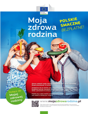 Komisja Europejska © Unia Europejska, 2014. Fotograf: Michał Obrzut. Moja zdrowa rodzina E I K S L O P E N Z C A SM ! E N T A Ł P Z E B Chcesz zmienić swoje nawyki żywieniowe, jeść lepiej i barwniej? Eksperymentować w kuchni? o d z c Dołą j e j o M j e w o zdr y n i z rod Zarejestruj się na stronie www.mojazdrowarodzina.pl żeby dostawać bezpłatne porcje starannie wyselekcjonowanych owoców i warzyw wraz z pomysłami na smaczne i zrównoważone posiłki dla całej rodziny. Podziel się z nami swoimi osiągnięciami w kuchni, weź udział w konkursie i wygraj! www.mojazdrowarodzina.pl "Moja zdrowa rodzina" jest organizowana przez Komisję Europejską w celu promowania spożywania owoców i warzyw. Uczestnicy otrzymują sezonowe owoce i warzywa pochodzące od lokalnych producentów.
