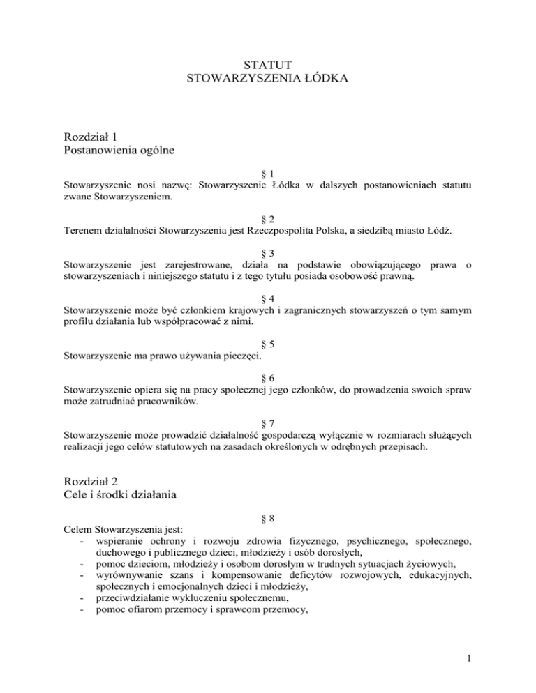 STATUT STOWARZYSZENIA ŁÓDKA Rozdział 1 Postanowienia