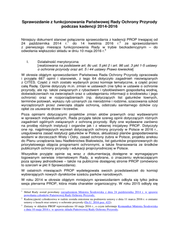 Sprawozdanie z funkcjonowania Państwowej Rady Ochrony Przyrody podczas kadencji 2014-2016 Niniejszy dokument stanowi połączenie sprawozdania z kadencji PROP trwającej od 24 października 2014 r.1 do 14 kwietnia 2016 r.2 ze sprawozdaniem z pierwszego miesiąca funkcjonowania Rady w trybie bezkadencyjnym – do odwołania większości składu w dniu 10 maja 2016 r.3 I. Działalność merytoryczna [realizowana na podstawie art. 8c ust. 5 pkt 2 i art. 96 ust. 3 pkt 1-5 ustawy o ochronie przyrody oraz art. 5 i 44 ustawy Prawo łowieckie] W okresie objętym sprawozdaniem Państwowa Rada Ochrony Przyrody opracowała i przyjęła 667 opinii i stanowisk, z tego 64 dotyczyło zagadnień niezwiązanych z CITES. Część z nich zostało wydanych przez komisje tematyczne, a część przez całą Radę. Opinie dotyczyły m.in. zmian w ustawach (nie tylko w ustawie o ochronie przyrody, ale np. także związanych z rybactwem i rybołówstwem gospodarką wodną, doświadczeniach na zwierzętach oraz o udostępnianiu informacji o środowisku i jego ochronie) oraz w rozporządzeniach (np. dotyczących list gatunków łownych, terminów polowań, wykazu ryb uznanych za nierodzime i rodzime, szacowania szkód wyrządzonych przez zwierzęta objęte ochroną, odstrzału sanitarnego dzików czy opłat za usuwanie drzew i krzewów. Poza opiniami dotyczącymi projektów zmian aktów prawnych oraz wydawanymi w sprawach indywidualnych, Rada przyjęła także szereg opinii dotyczących różnych zagadnień ogólnych związanych z ochroną przyrody. Były one wydawane zarówno na prośbę różnych instytucji i organów jak i z własnej inicjatywy PROP. Dotyczyły one np. najpilniejszych wyzwań dotyczących ochrony przyrody w Polsce w 2016 r., uregulowania zasad restytucji gatunków w Polsce, aktualizacji planów gospodarowania wodami w dorzeczach Wisły i Odry, zasad ochrony żubra w Polsce, projektu aneksu do Planu urządzania lasu Nadleśnictwa Białowieża, list gatunków proponowanych do priorytetowego objęcia programami ochronnymi, a także finansowania ze środków publicznych ochrony przyrody i edukacji proprzyrodniczej w Polsce. Wszystkie przyjęte opinie są wraz z dokumentacją dostępne w wymagającym logowanym serwisie internetowym Rady, a wybrane, o znaczeniu wykraczającym poza sprawy jednostkowe – także na publicznie dostępnej stronie PROP (omówiono to szerzeń w pkt II Sprawozdania). W ostatnich miesiącach PROP wydelegowała swoich przedstawicieli do komisji wybierających nowych dyrektorów sześciu parków narodowych. W roku 2014 w okresie objętym mniejszym sprawozdaniem odbyła się tylko jedna sesja plenarna PROP, która miała charakter organizacyjny. W roku 2015 odbyły się 1 2 3 Skład Rady został powołany zarządzeniem Ministra Środowiska z dnia 24 października 2014 r. w sprawie powołania członków Państwowej Rady Ochrony Przyrody. Kadencyjność członkostwa w radzie została zniesione na podstawie ustawy z dnia 11 marca 2016 r. o zmianie ustawy o lasach oraz ustawy o ochronie przyrody (Dz.U. 2016 poz. 422). Zmiany w składzie PROP wprowadzono 10 maja 2016 r., o czym informuje Komunikat Ministra Środowiska z dnia 10 maja 2016 r. w sprawie składu Państwowej Rady Ochrony Przyrody. dwie sesje plenarne o charakterze merytorycznym. Pierwszą merytoryczną sesję plenarną w roku 2016, o temacie przewodnim: „Bierna i czynna ochrony przyrody, ze szczególnym uwzględnieniem siedlisk i gatunków leśnych” (tytuł roboczy) planowano na przełom maja i czerwca tego roku. Przedstawiciele PROP uczestniczyli w pracach parlamentarnych (posiedzeniach komisji Sejmu i Senaty) nad kilkoma ustawami (w tym o rybołówstwie, o doświadczeniach na zwierzętach oraz ustawy Prawo Wodne. W wyniku spotkania przedstawicieli PROP i Ministerstwa Środowiska z reprezentantami ówczesnego Departamentu Rybołówstwa Ministerstwa Rolnictwa i Rozwoju Wsi, zapoczątkowano współpracę i wprowadzono praktykę przesyłania do PROP z prośbą o zaopiniowanie projektów wszystkich aktów prawnych związanych z rybołówstwem. II. Działalność edukacyjna i propagująca ochronę przyrody [realizowana na podstawie art. 96 ust. 3 pkt 6 ustawy o ochronie przyrody] PROP rozpoczęła działania w celu swojej aktywizacji jako członka IUCN. M.in. uaktualniono profil PROP w serwisie internetowym IUCN oraz nawiązano regularną łączność z działem do spraw członkowskich. W listowniku Rady umieczono poprawne logo IUCN. PROP jest kosponsorem propozycjo jednej z uchwał IUCN, która będzie dyskutowane i głosowana podczas Światowego Kongresu ochrony przyrody IUCN (dotyczy ograniczania zabijania ptaków drapieżnych przez linie energetyczne). Przedstawiciel Rady powinien uczestniczyć w tym Kongresie (będzie on miał miejsce w dniach 01-10 września, na Hawajach). Po raz ostatni przedstawiciel PROP uczestniczył w takim Kongresie w roku 2007. Po raz pierwszy utworzono publicznie dostępną stronę internetową, prezentującą informacje o PROP (kadencja 2014-2016) oraz przyjmowane przez Radę opinie o znaczeniu ponadjednostkowym. Podstawowe dane dotyczące statystyki odwiedzalności przez pierwsze 4 miesiące funkcjonowania przedstawia poniższa rycina: Widać da niej, że odwiedzalność strony, mimo braku jej promocji, stopniowo rośnie. Do tej pory odwiedziło ją około 7,5 tysięcy różnych osób, przy czym ponad ¼ z nich co najmniej 2-krotnie. 2 W dniu 9 lutego 2015 r. w Ministerstwie Środowiska odbyło się spotkanie „poświęcone omówieniu aktualnych problemów związanych z ochroną i hodowlą restytucyjną żubra w Polsce”, W spotkaniu uczestniczyło aktywnie 5 członków Rady. W dniach 27-29 maja 2015 r. w Warszawie odbyło się seminarium dla prokuratorów, dotyczące CITES. Komisja PROP ds. CITES była jego współorganizatorem. Seminarium miało charakter szkolenia, w którym uczestniczyli przedstawiciele wszystkich prokuratur okręgowych. W dniach 8-10 czerwca 2015 Państwowa Rada O