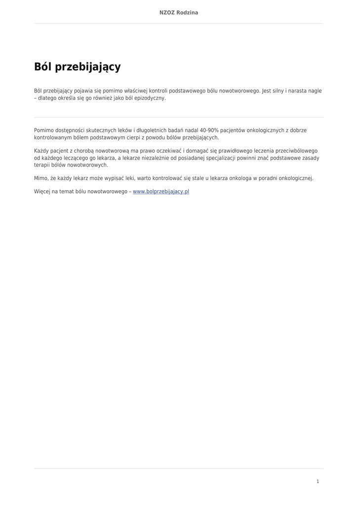 NZOZ Rodzina Ból przebijający Ból przebijający pojawia się pomimo właściwej kontroli podstawowego bólu nowotworowego. Jest silny i narasta nagle – dlatego określa się go również jako ból epizodyczny. Pomimo dostępności skutecznych leków i długoletnich badań nadal 40-90% pacjentów onkologicznych z dobrze kontrolowanym bólem podstawowym cierpi z powodu bólów przebijających. Każdy pacjent z chorobą nowotworową ma prawo oczekiwać i domagać się prawidłowego leczenia przeciwbólowego od każdego leczącego go lekarza, a lekarze niezależnie od posiadanej specjalizacji powinni znać podstawowe zasady terapii bólów nowotworowych. Mimo, że każdy lekarz może wypisać leki, warto kontrolować się stale u lekarza onkologa w poradni onkologicznej. Więcej na temat bólu nowotworowego – www.bolprzebijajacy.pl 1